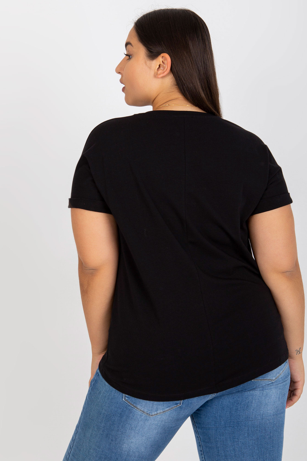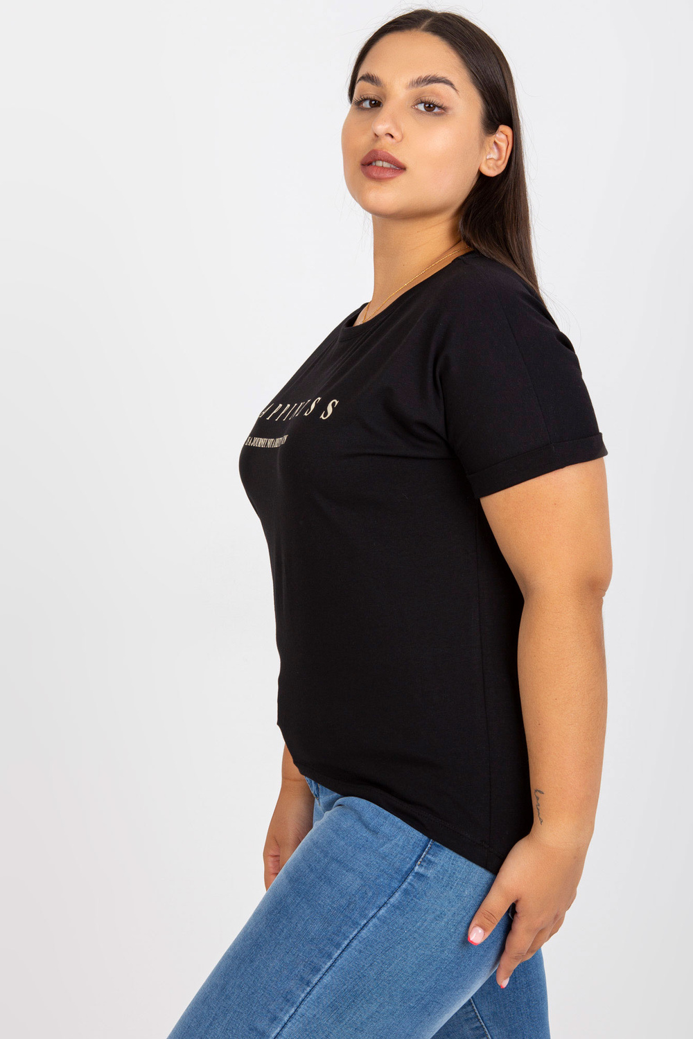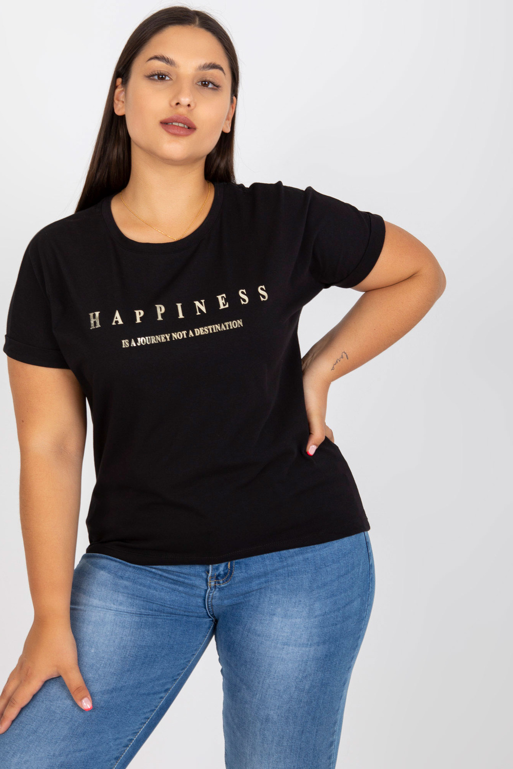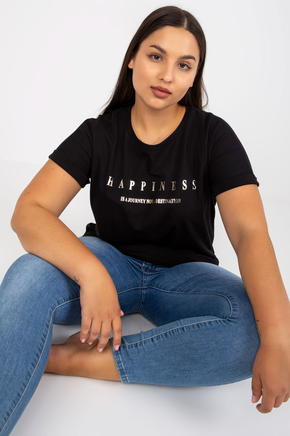 Juodi plius dydžio marškinėliai su aukso spalvos raštu .
