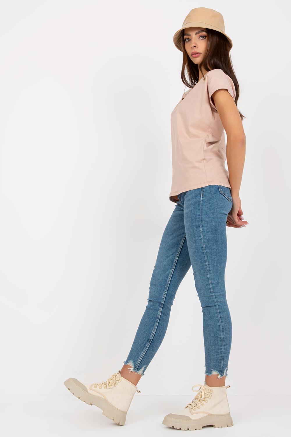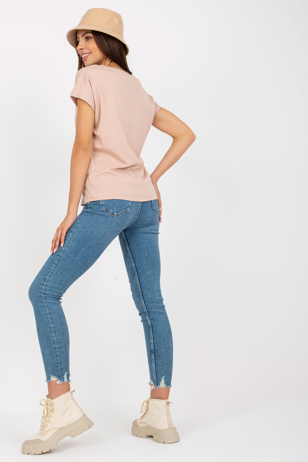 Smėlio spalvos moteriški pagrindiniai marškinėliai trumpomis rankovėmis< /strong> .