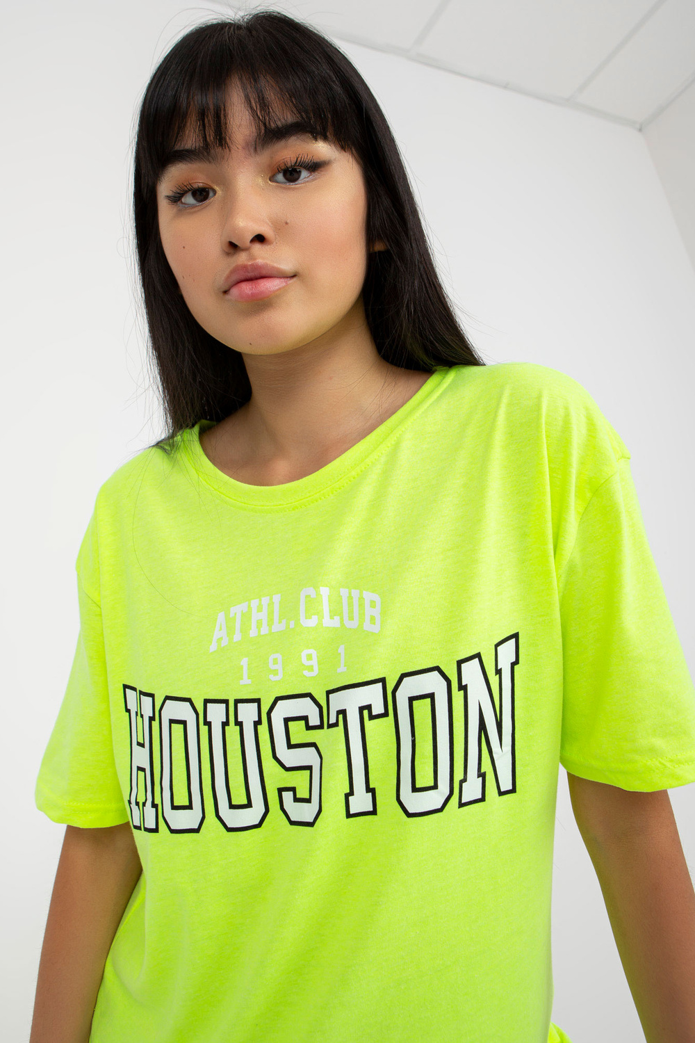 Fluo geltoni laisvi moteriški marškinėliai su užrašu.
