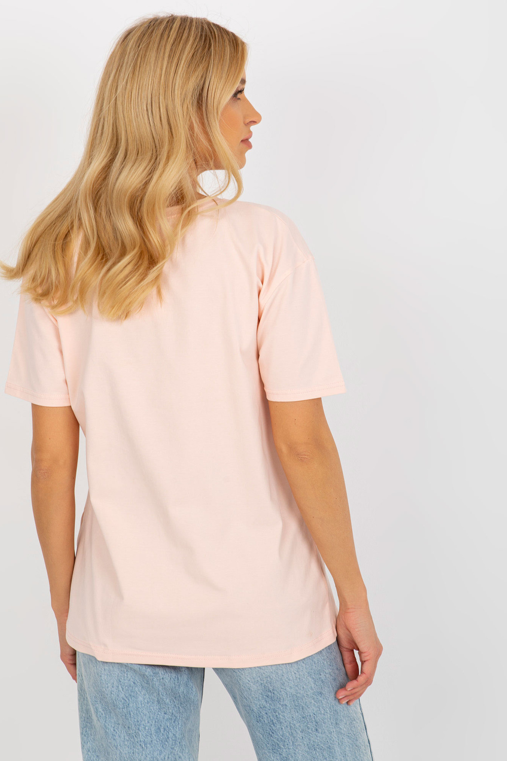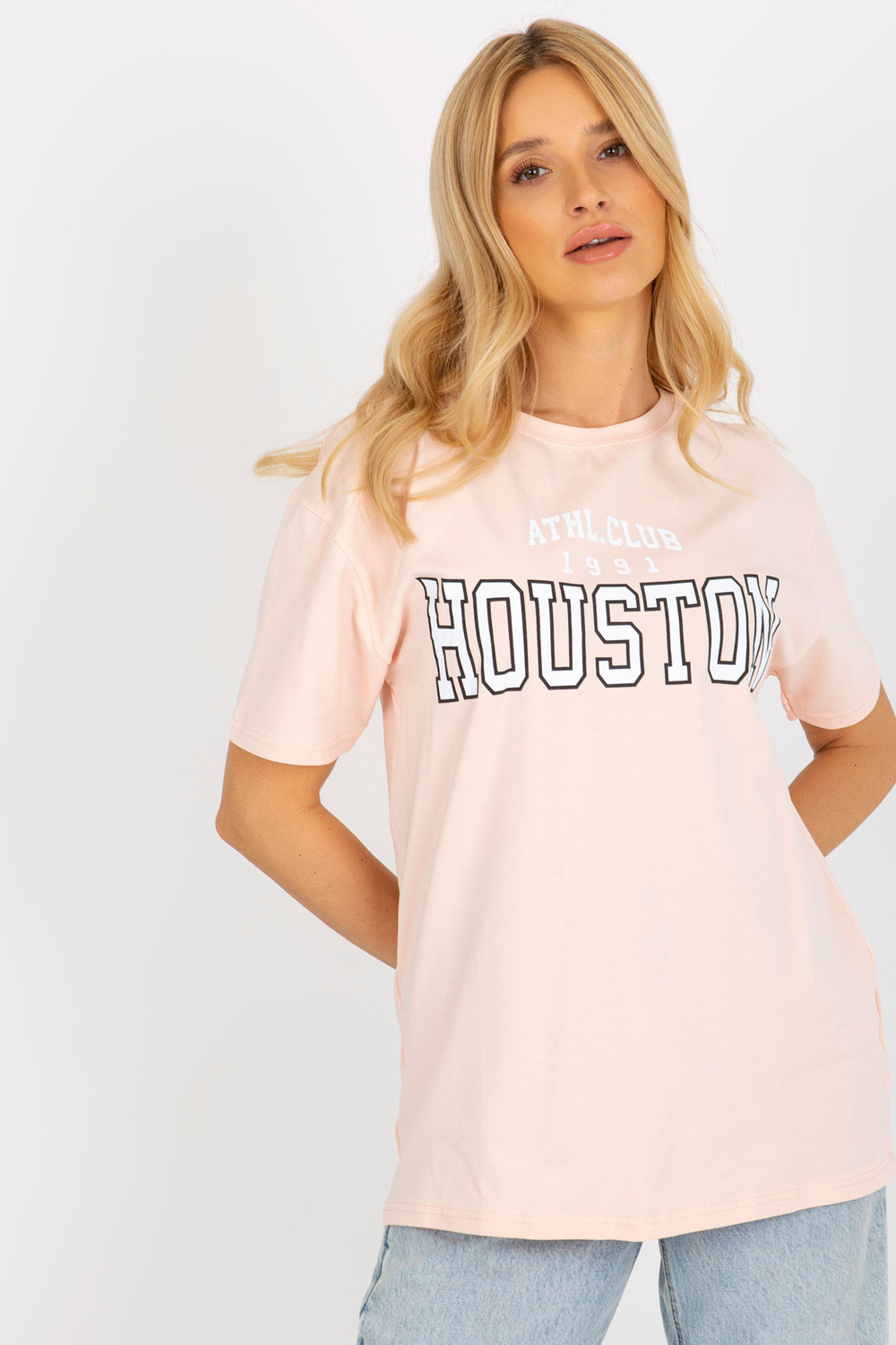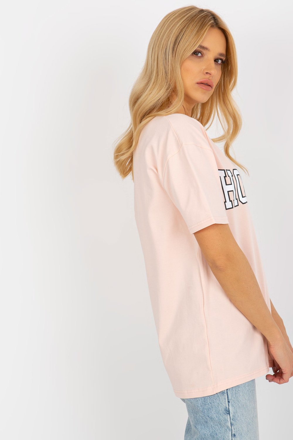 Lengvi persikų spalvos moteriški marškinėliai su užrašu.