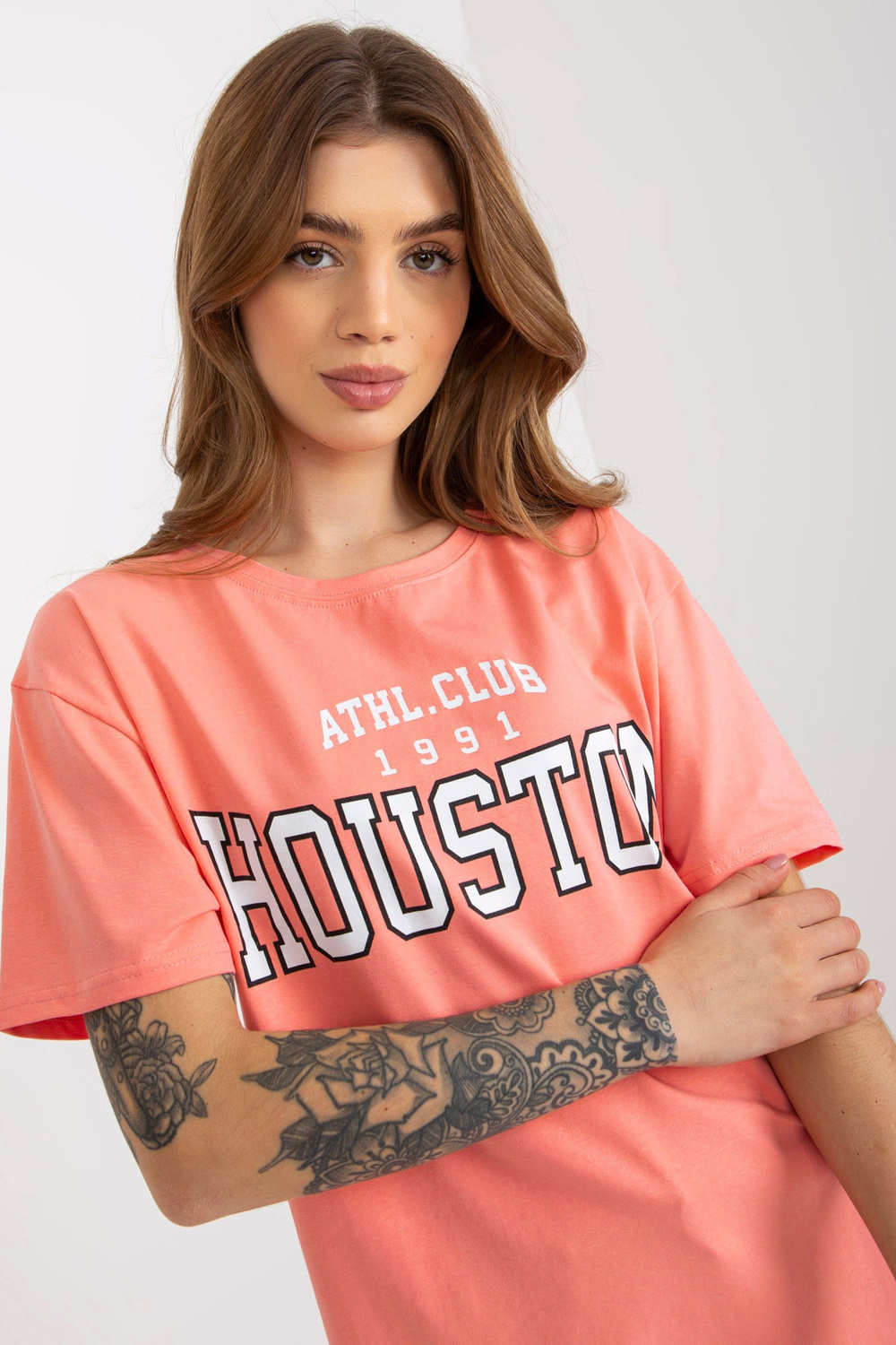 Persikų spalvos laisvi moteriški marškinėliai su raštu.