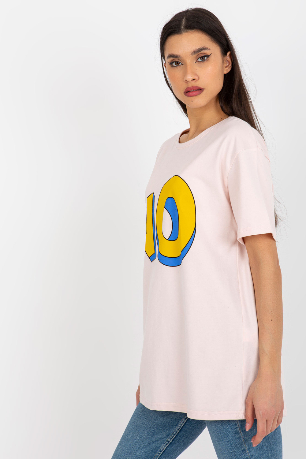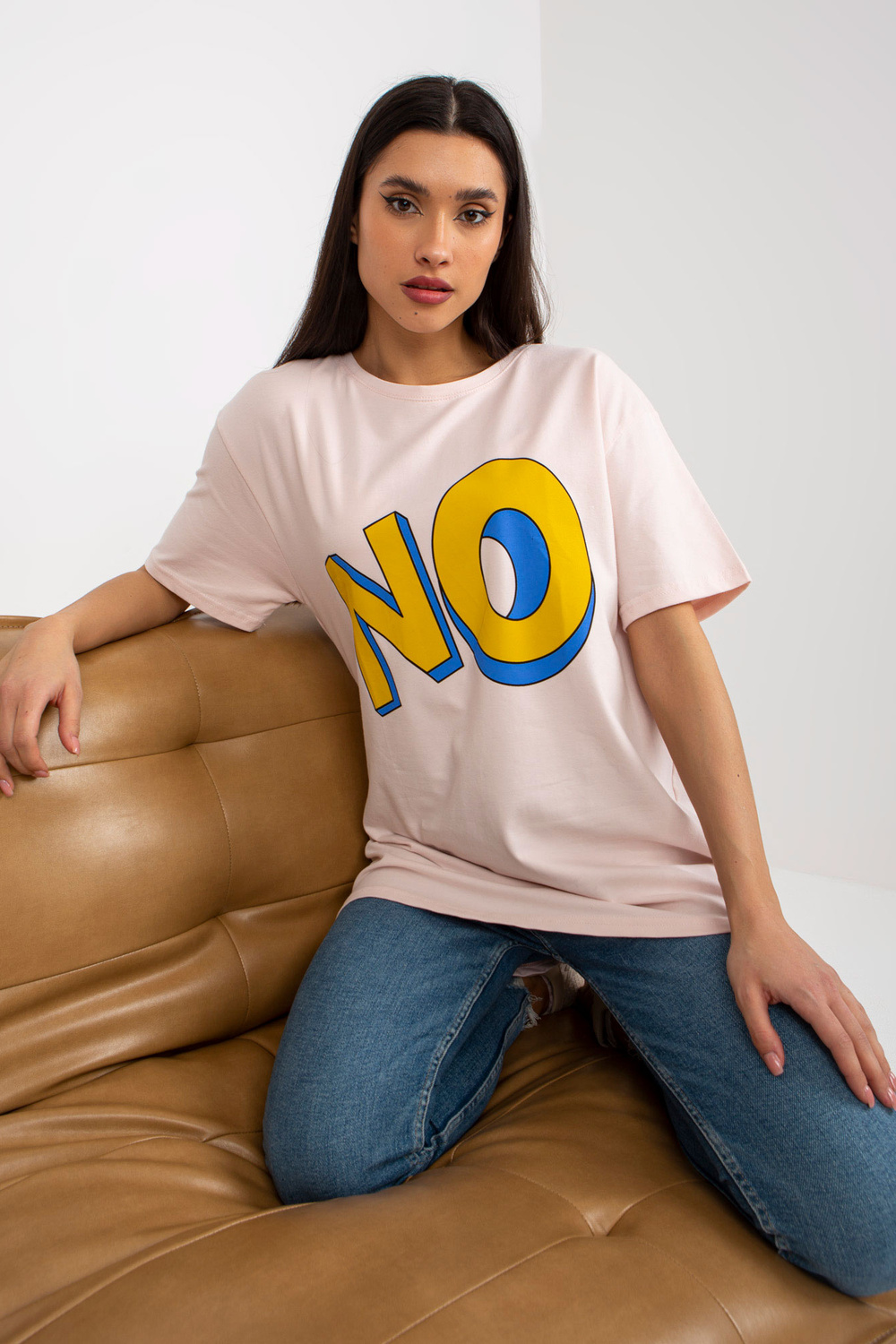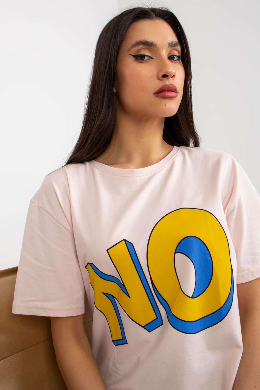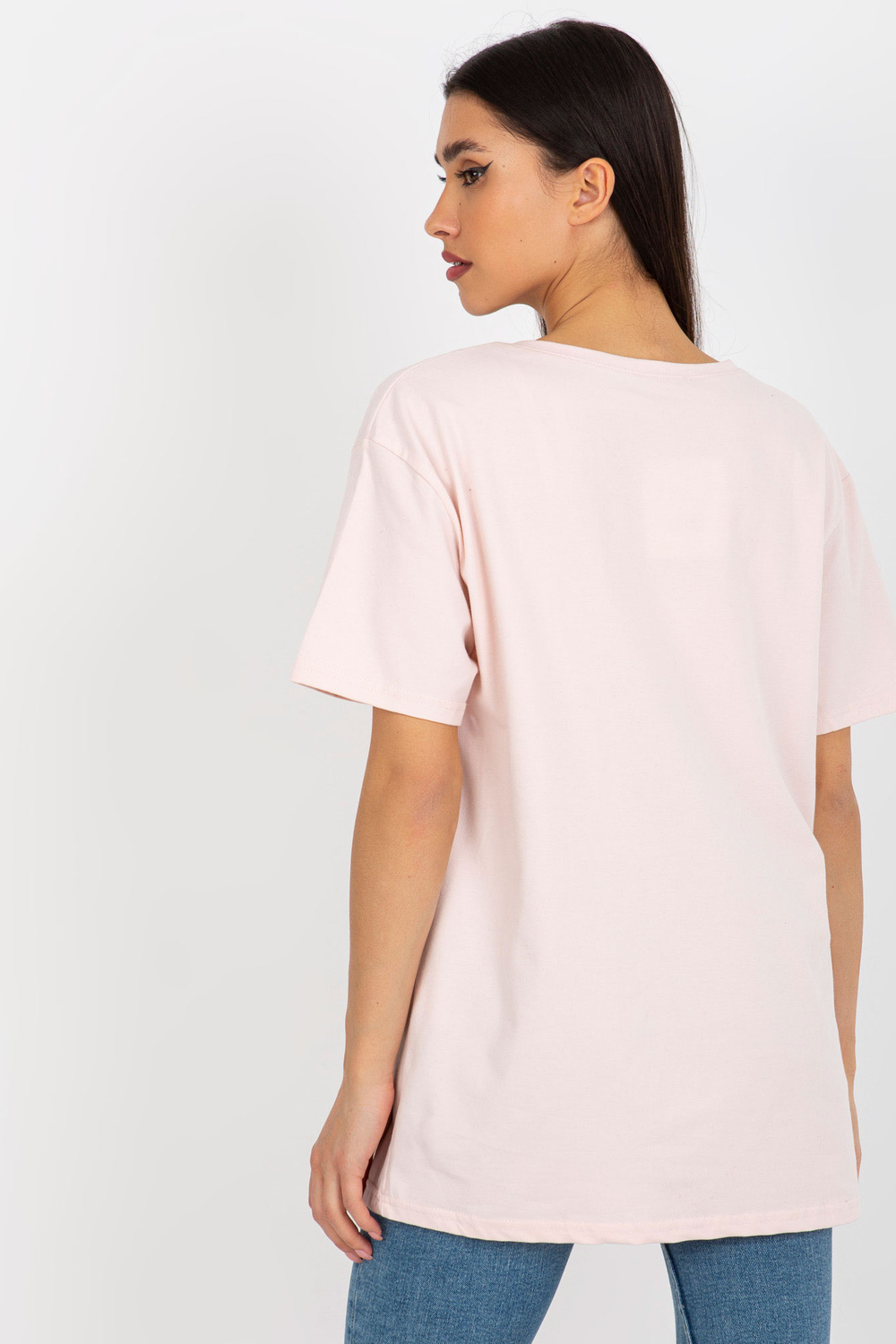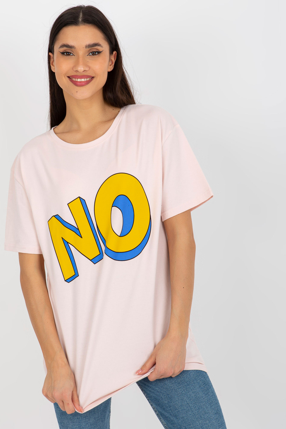 Šviesiai rožinės spalvos medvilniniai marškinėliai su užrašu.