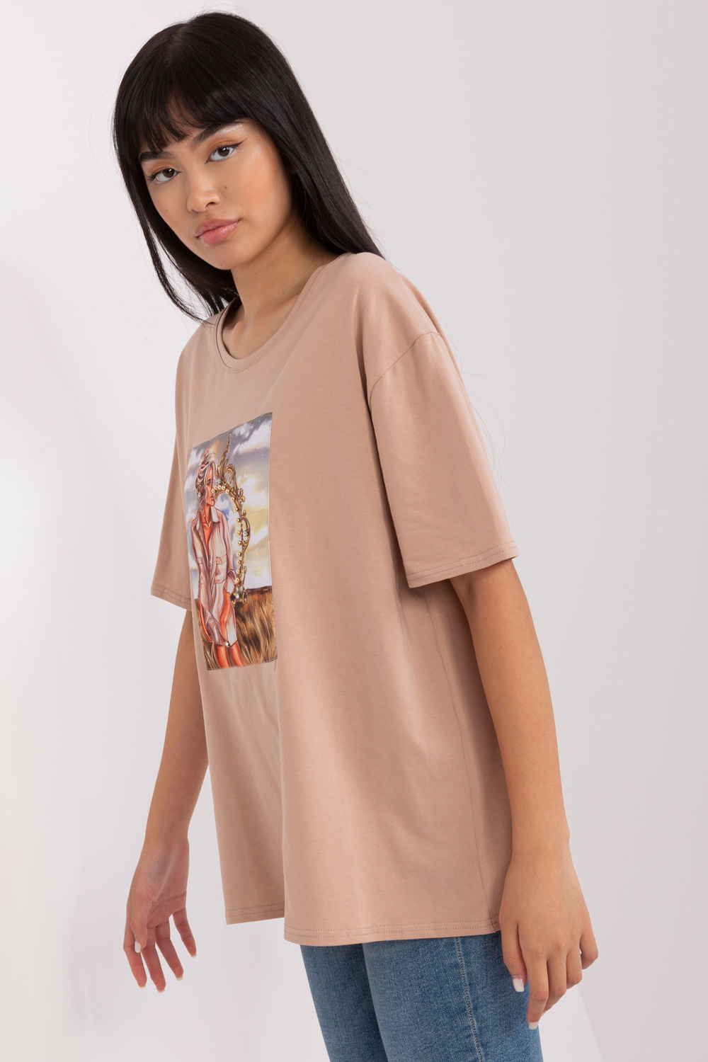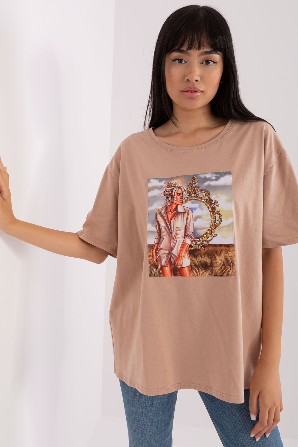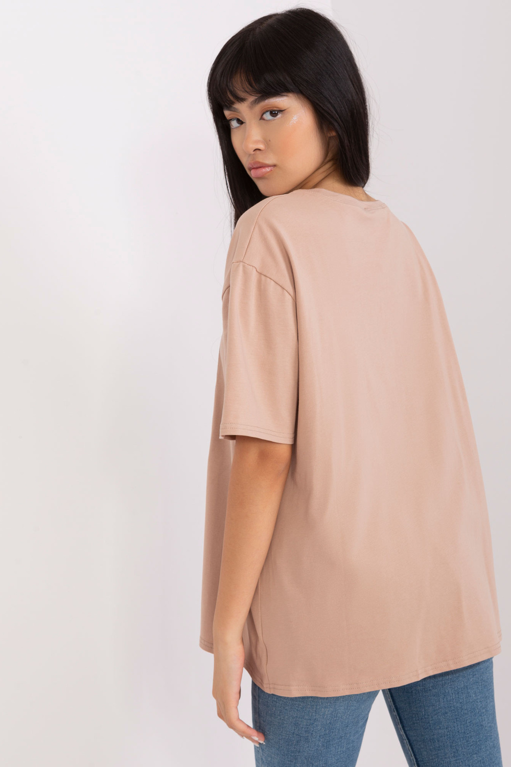 Vieno dydžio marškinėlių matmenys, matuojami plokščiai: plotis po apačia rankos - 58 cm, bendras ilgis - 70 cm.