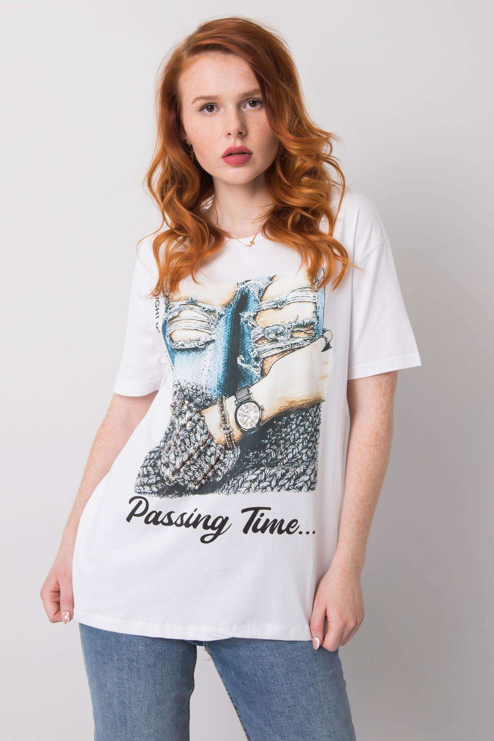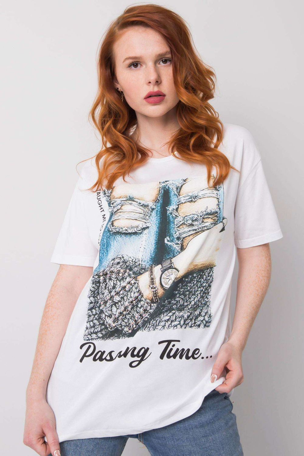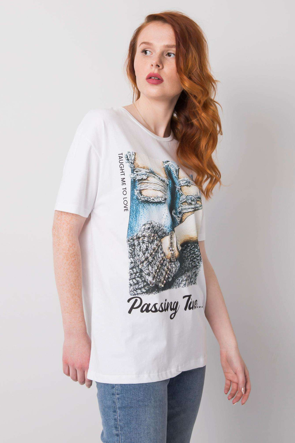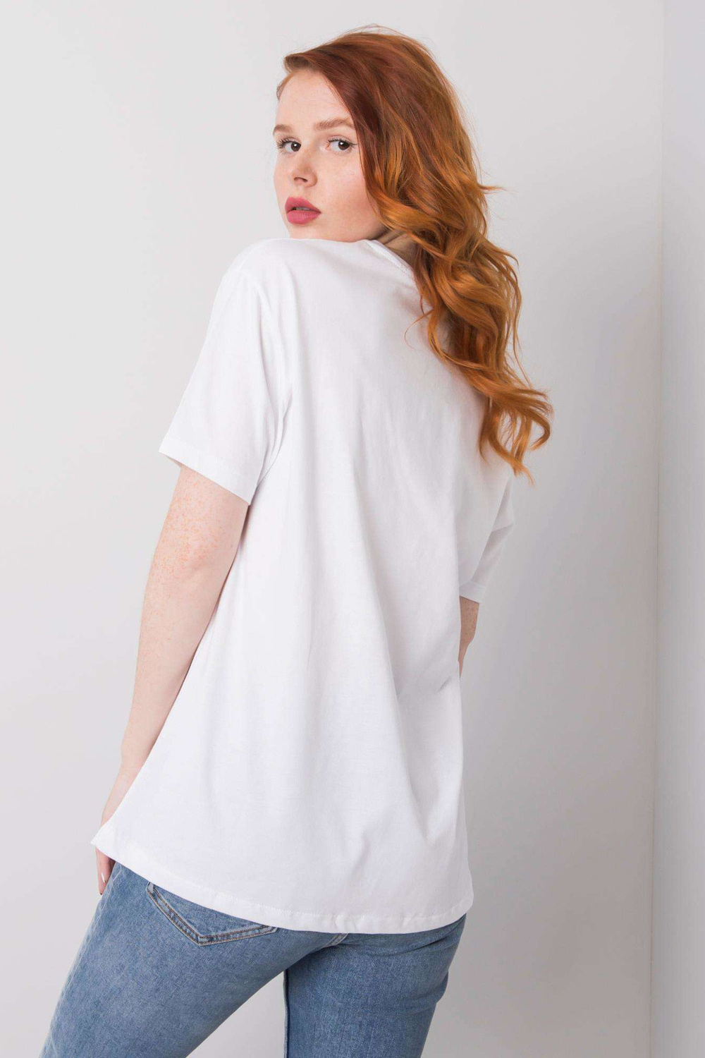 Balti marškinėliai moterims su Blanche aplikacijomis.