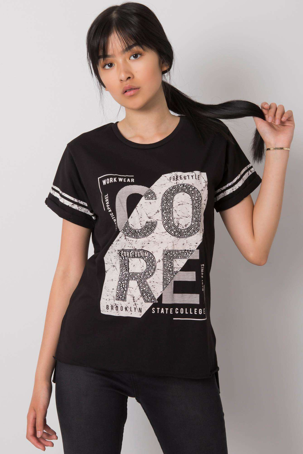 Modelis dėvi S dydį. Modelio išmatavimai: ūgis 167 cm, krūtinė 73 cm, juosmuo 64 cm, klubai 91 cm.
