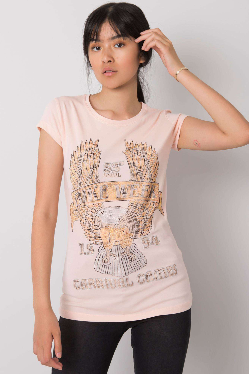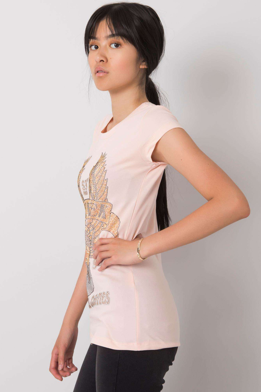 Šviesiai rausvi marškinėliai su Haley aplikacijomis.