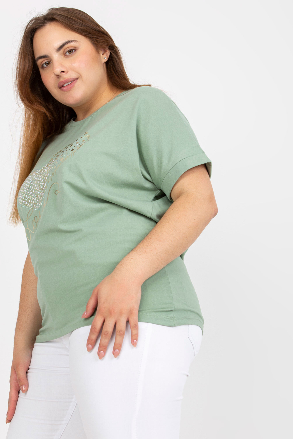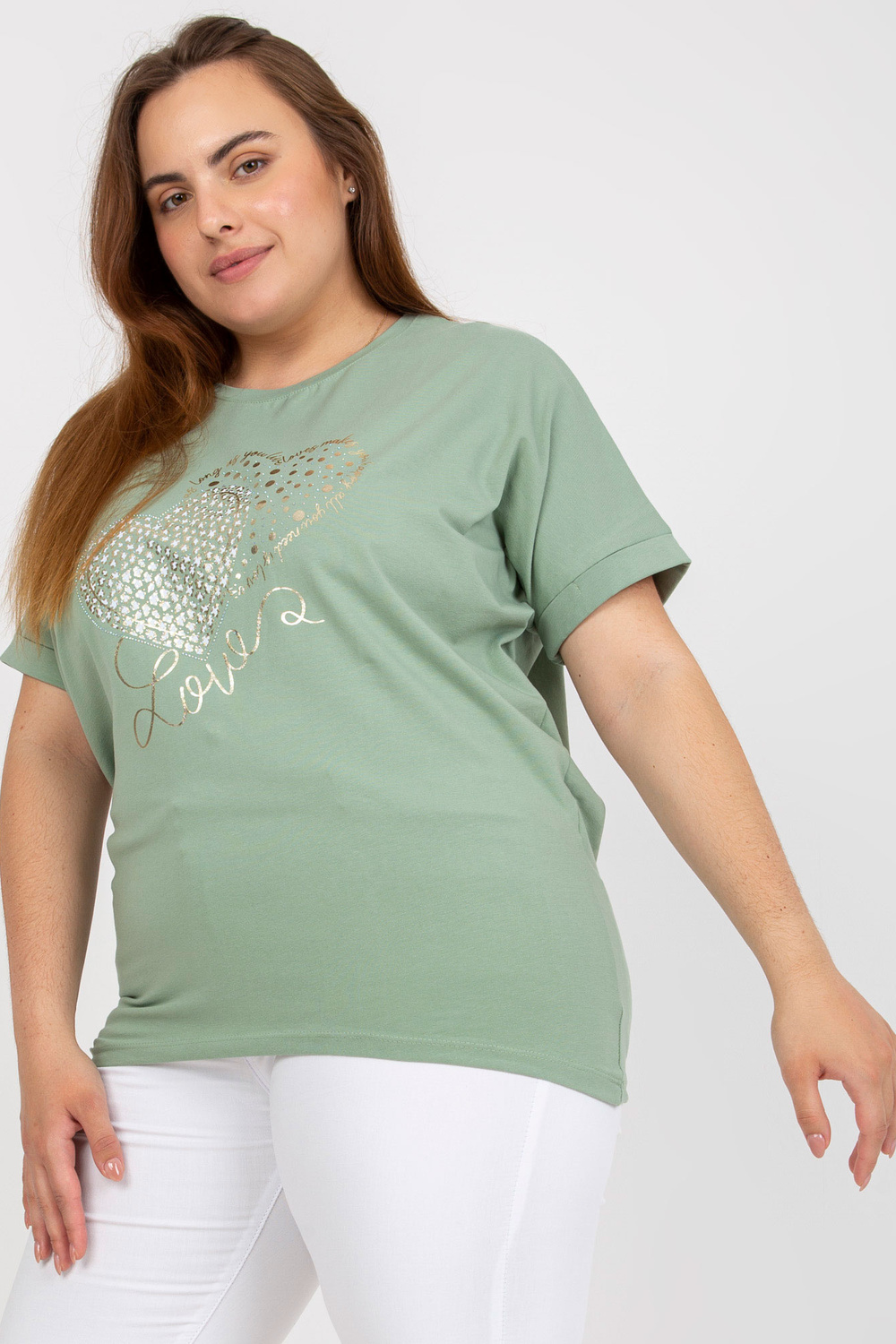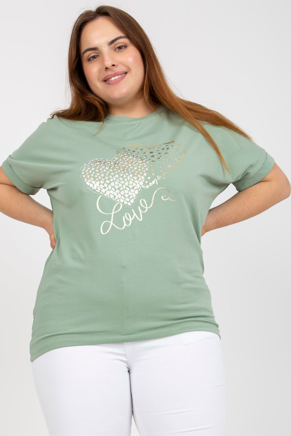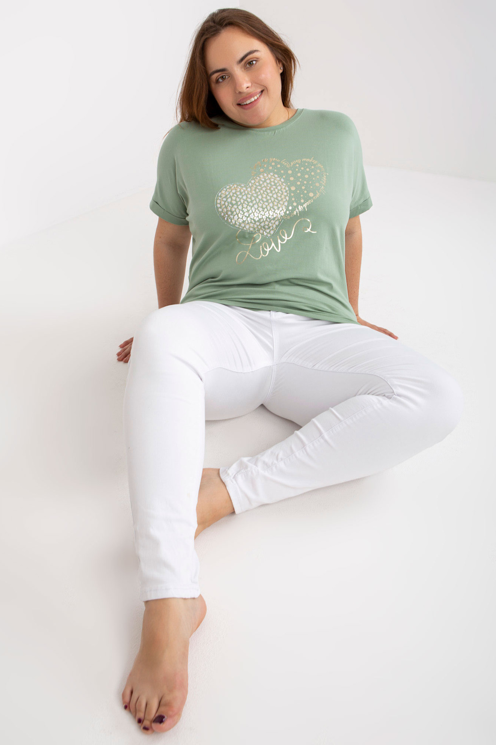 Pistacijų medvilnės marškinėliai moterims su spauda.