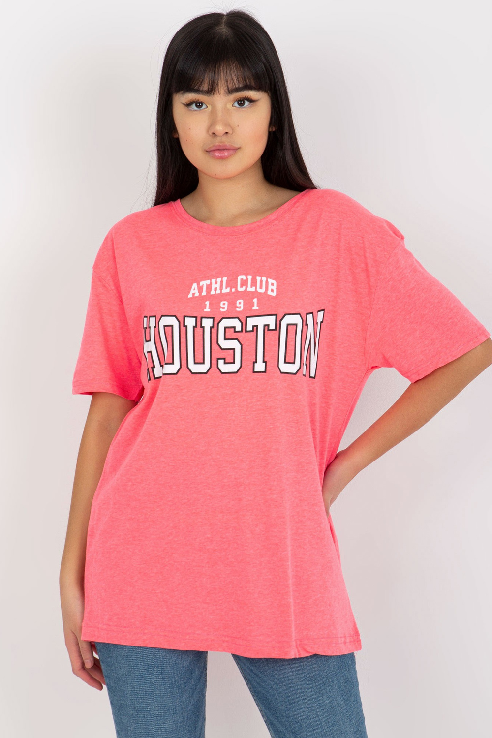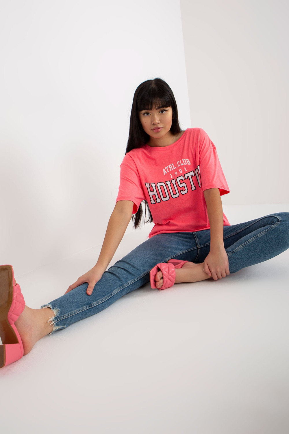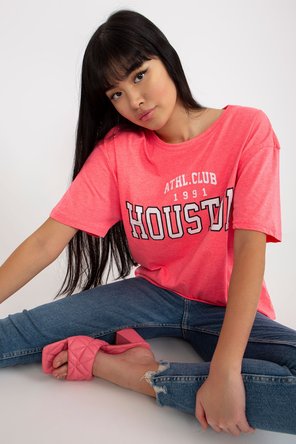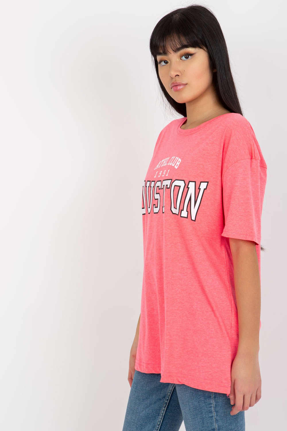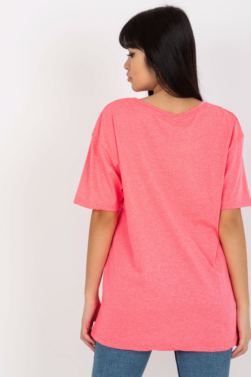 Fluo rožiniai laisvi moteriški marškinėliai su raštu.