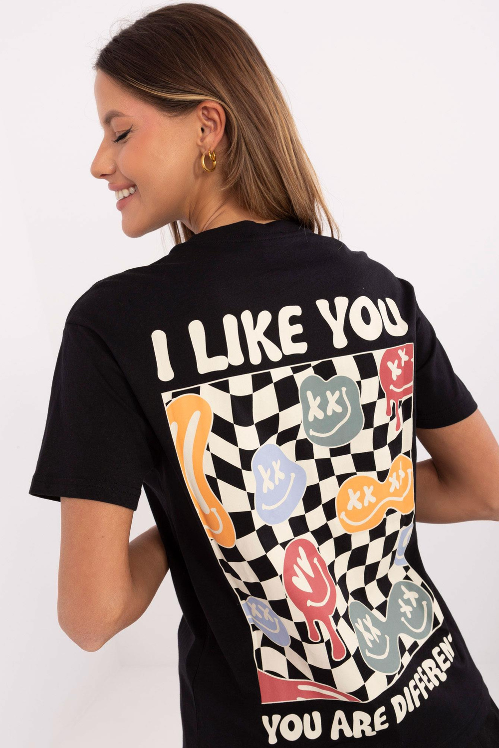 Marškinėlių išmatavimai S dydžio matuojant plokščią: plotis po pažastimis - 52 cm, rankovių ilgis - 20 cm, bendras ilgis - 5 cm.6 cm.