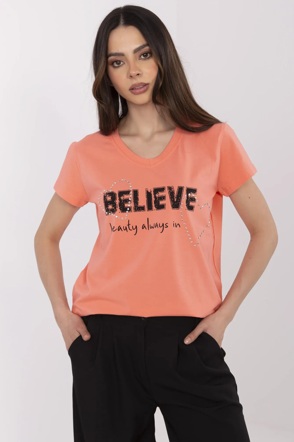 Modelis dėvi S dydį. Modelio išmatavimai: ūgis 175 cm, krūtinė 90 cm, juosmuo 66 cm, klubai 94 cm.