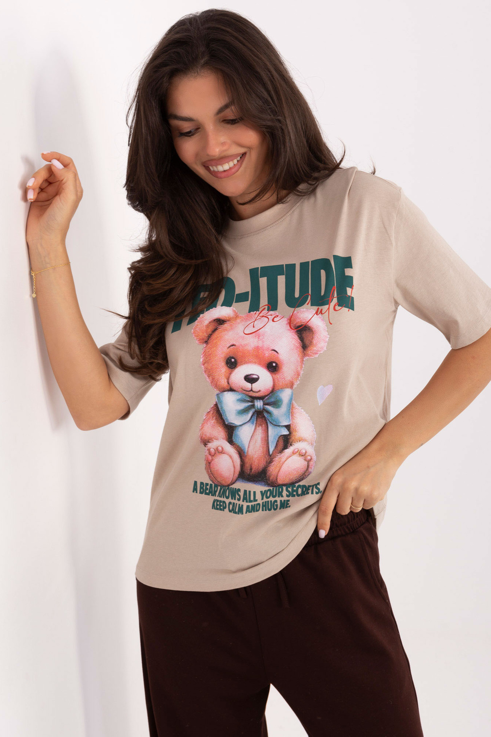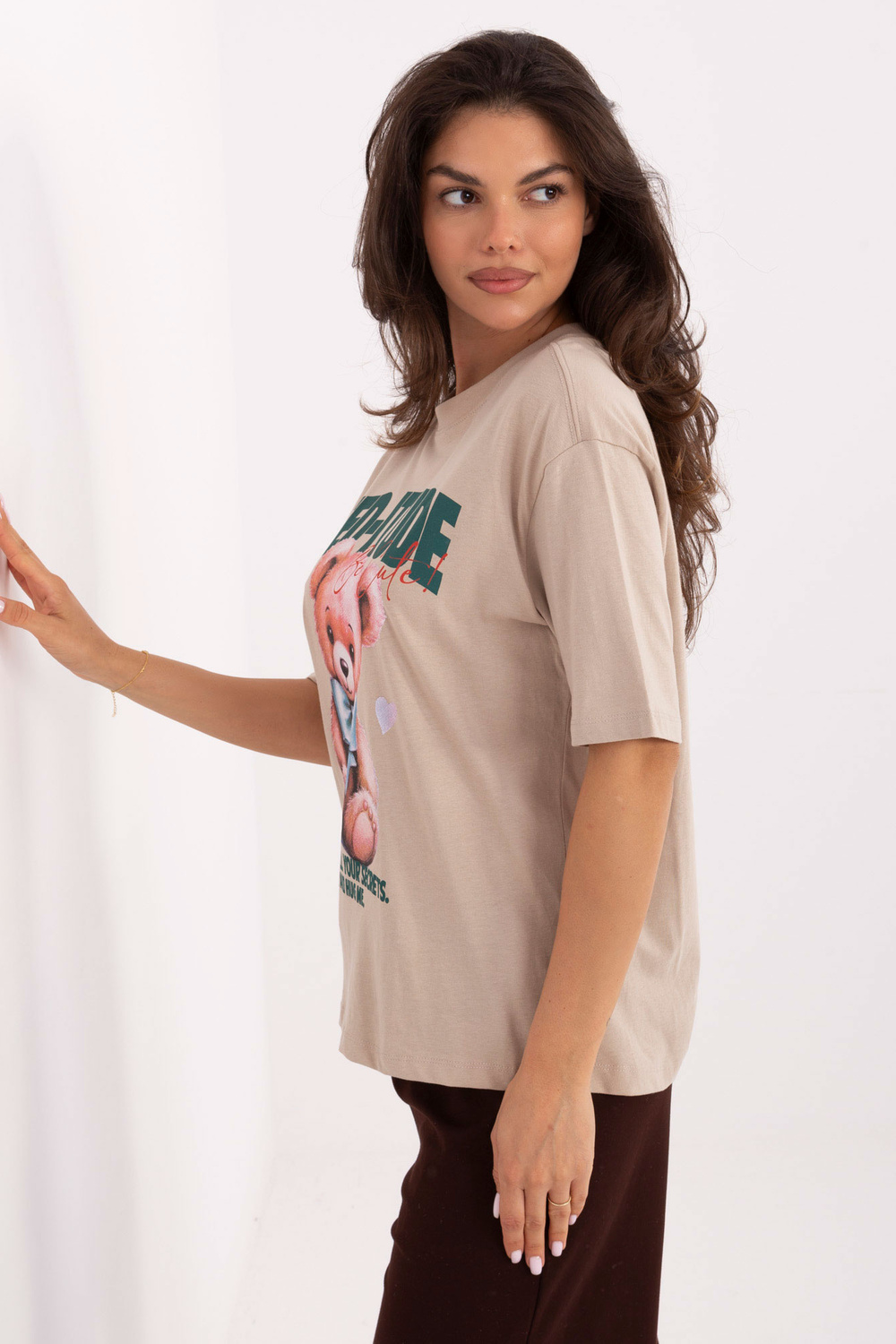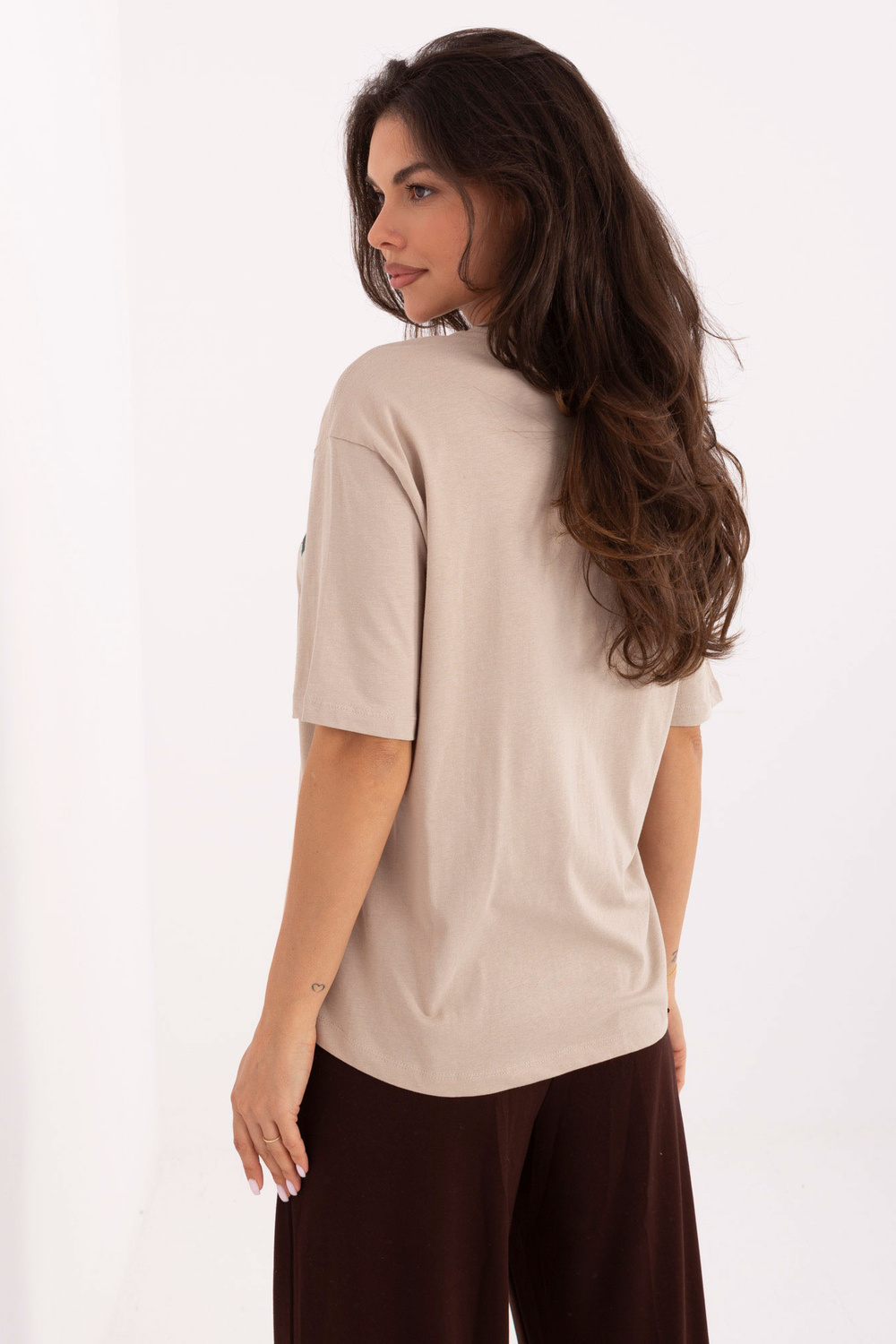 Marškinėlių matmenys S dydžio, matuojant paklotus: plotis po pažastimis - 57 cm, rankovės ilgis - 25 cm (nuo siūlės), plotis ties klubais - 60 cm, bendras ilgis - 67 cm.