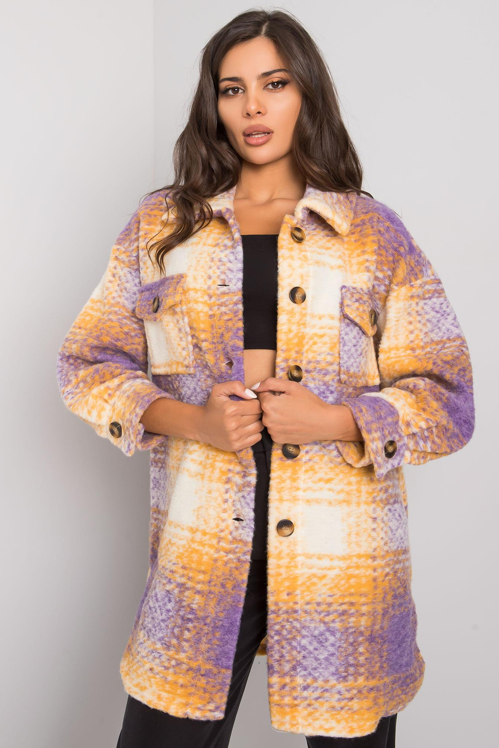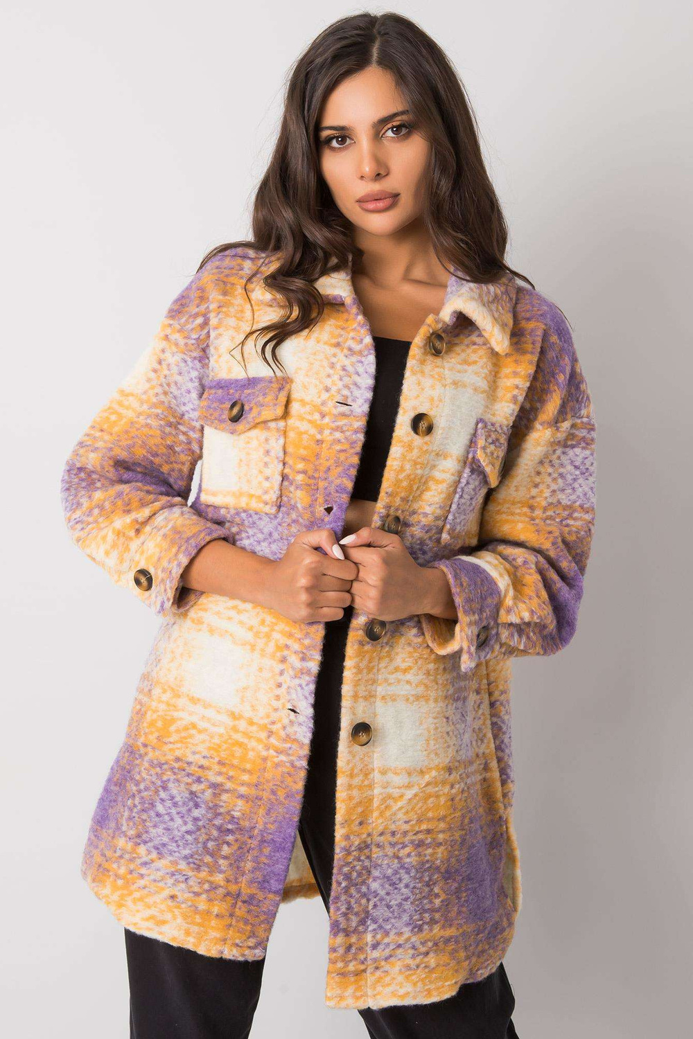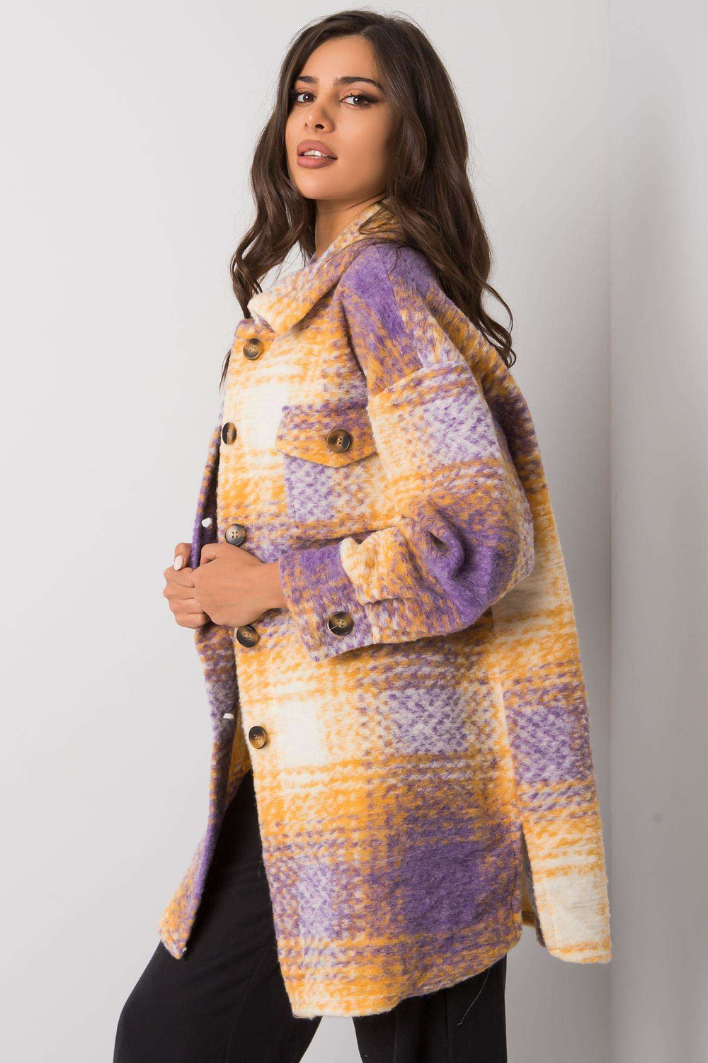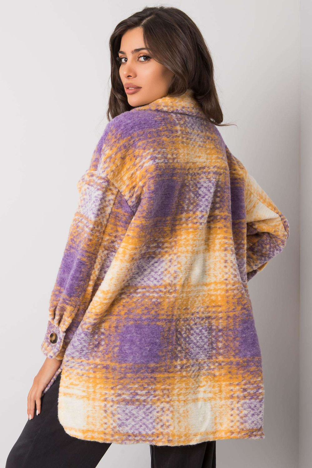 Violetinės ir geltonos spalvos „Vissy“ languoti marškiniai.