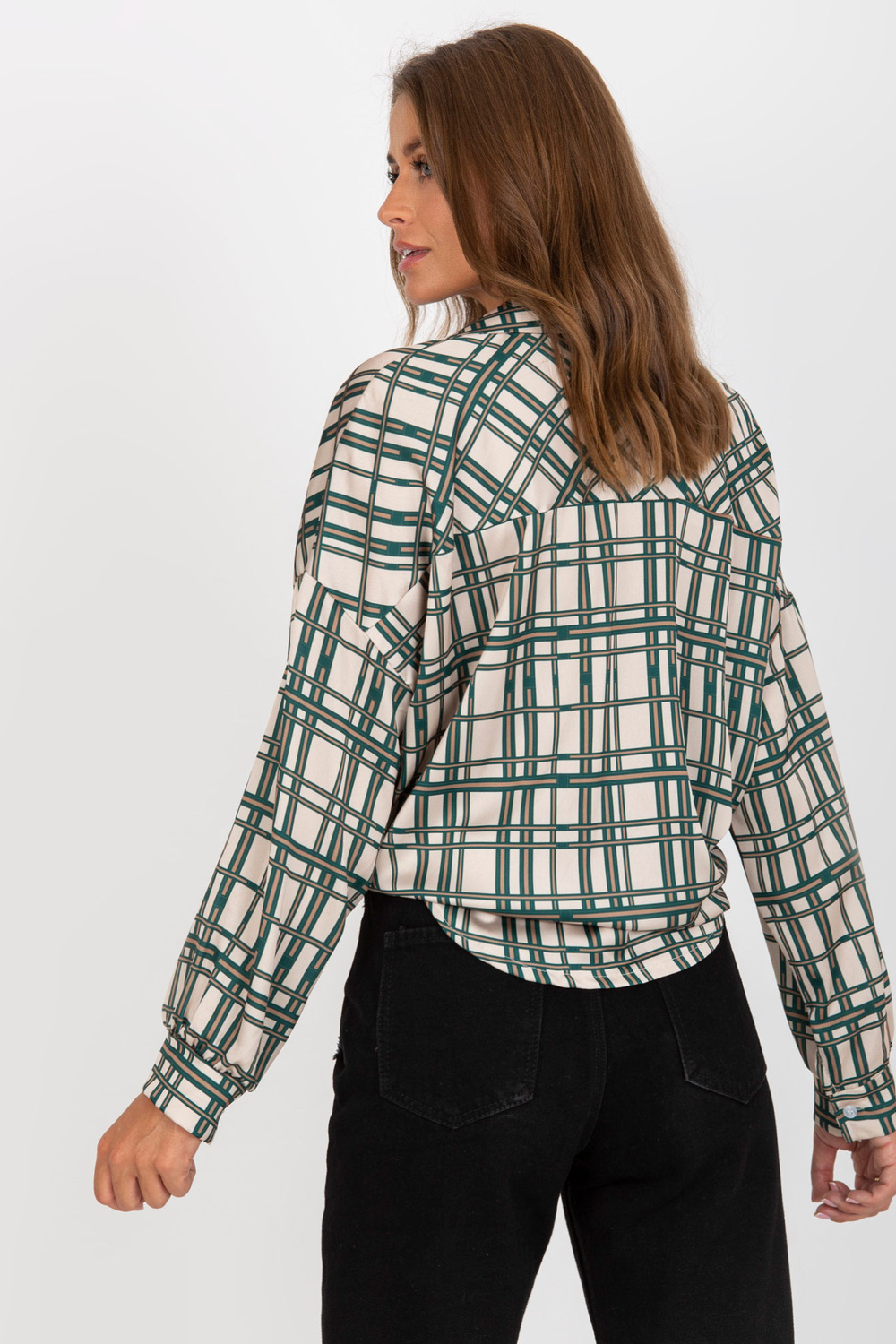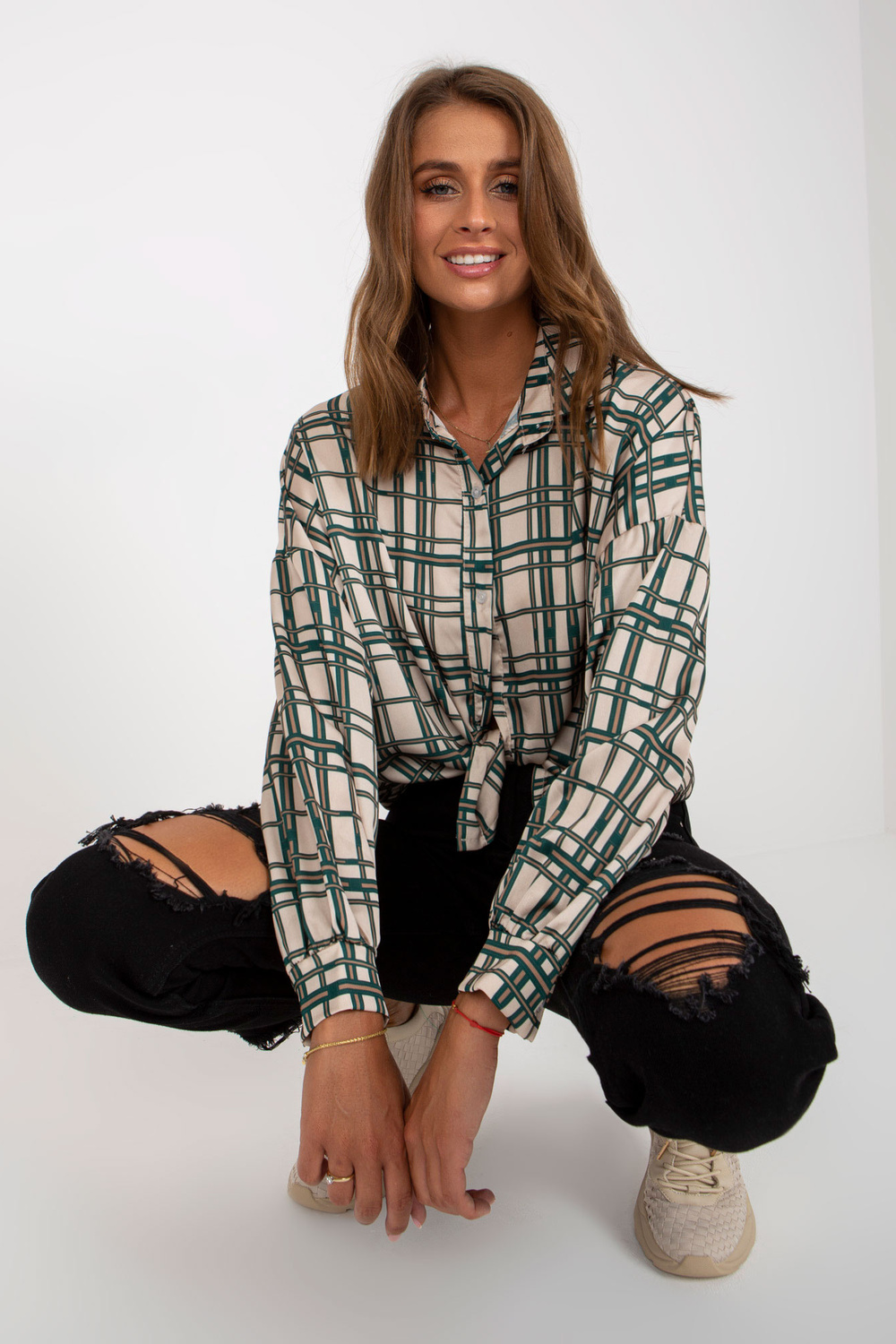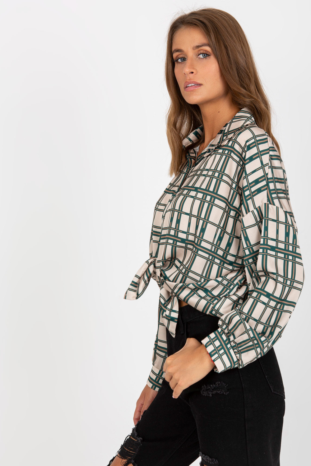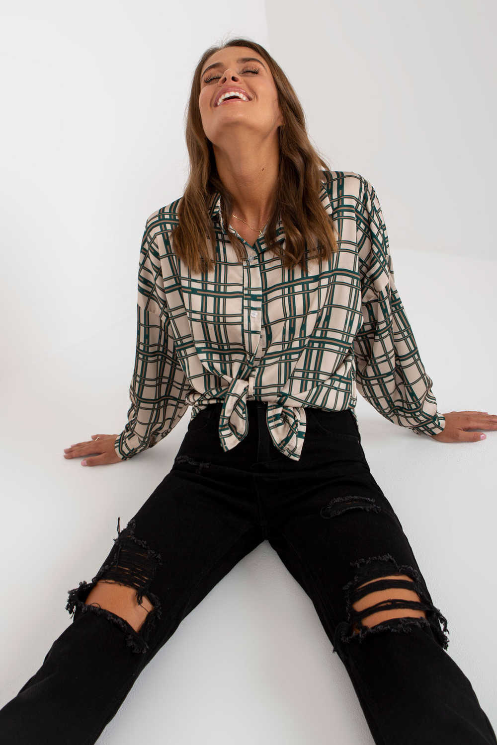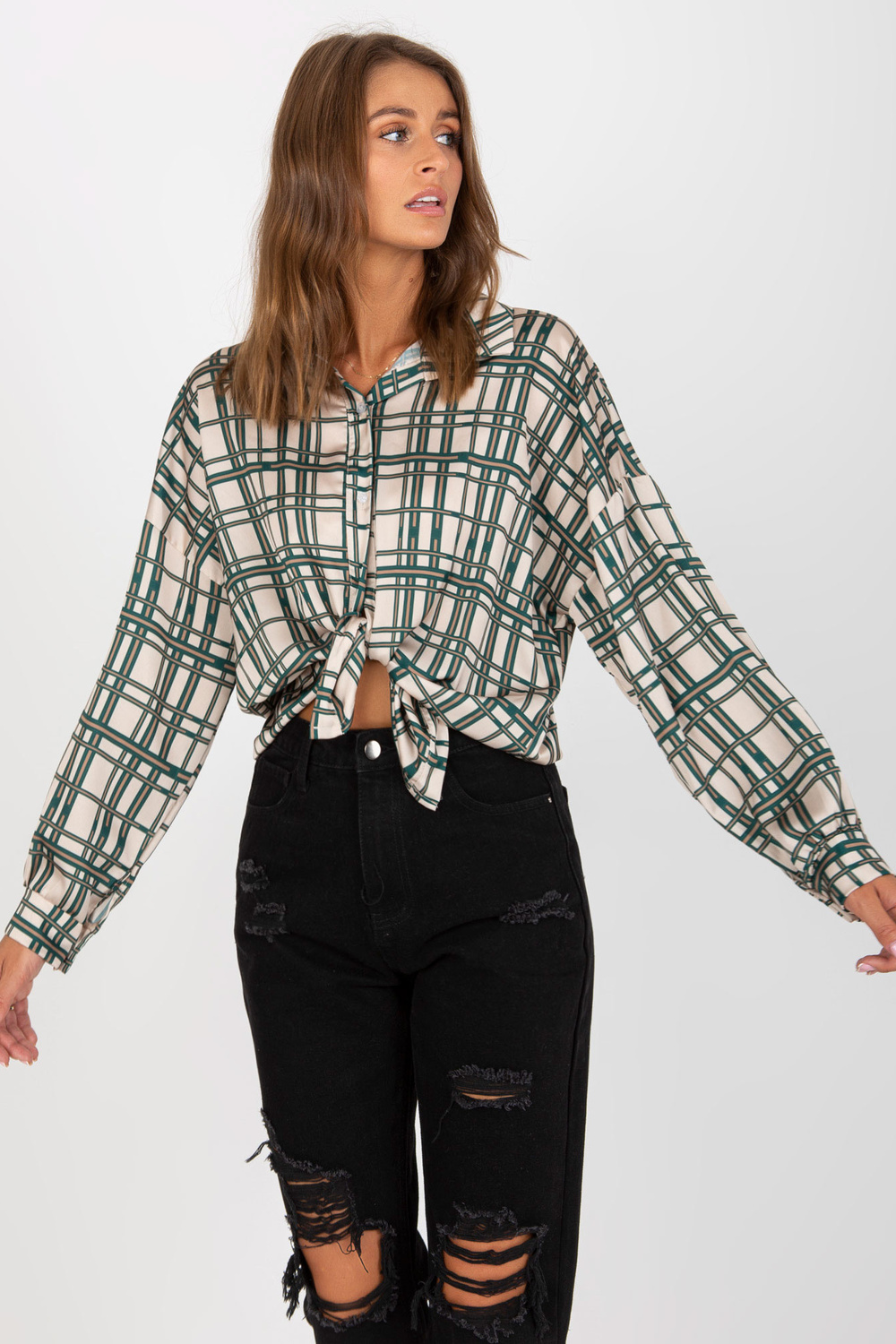 Smėlio spalvos languoti marškiniai iš satino imitacijos.