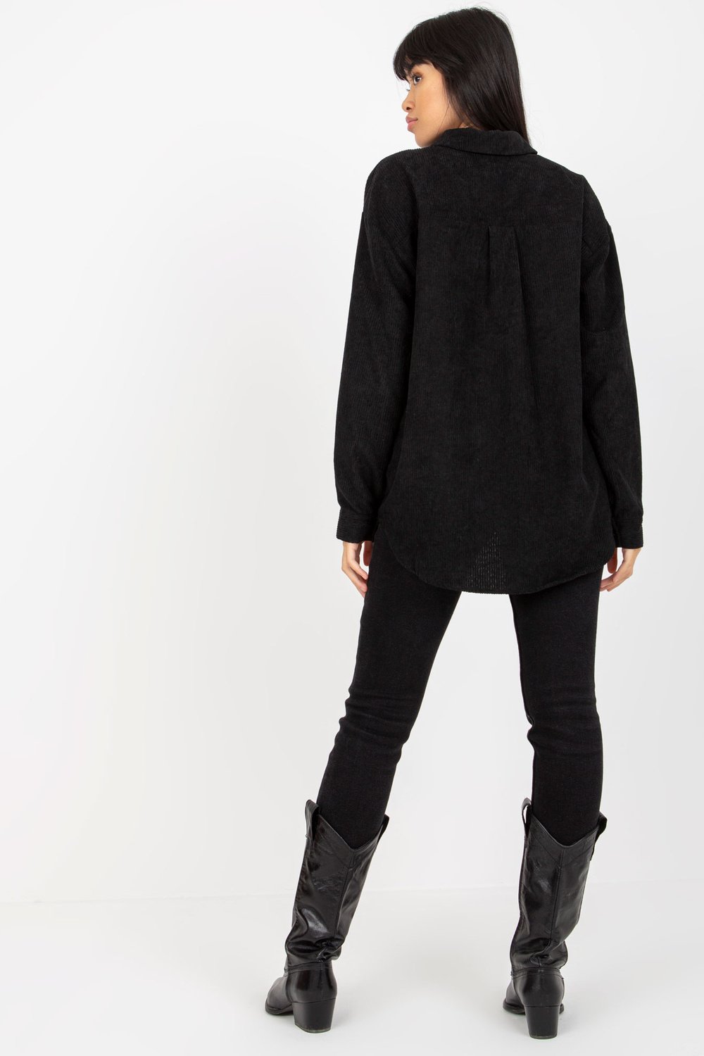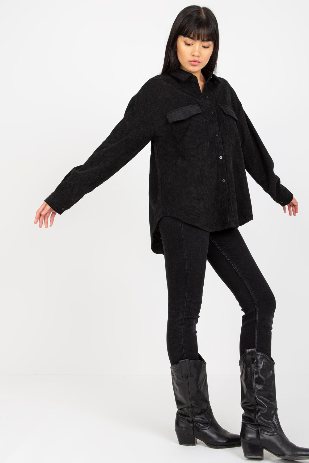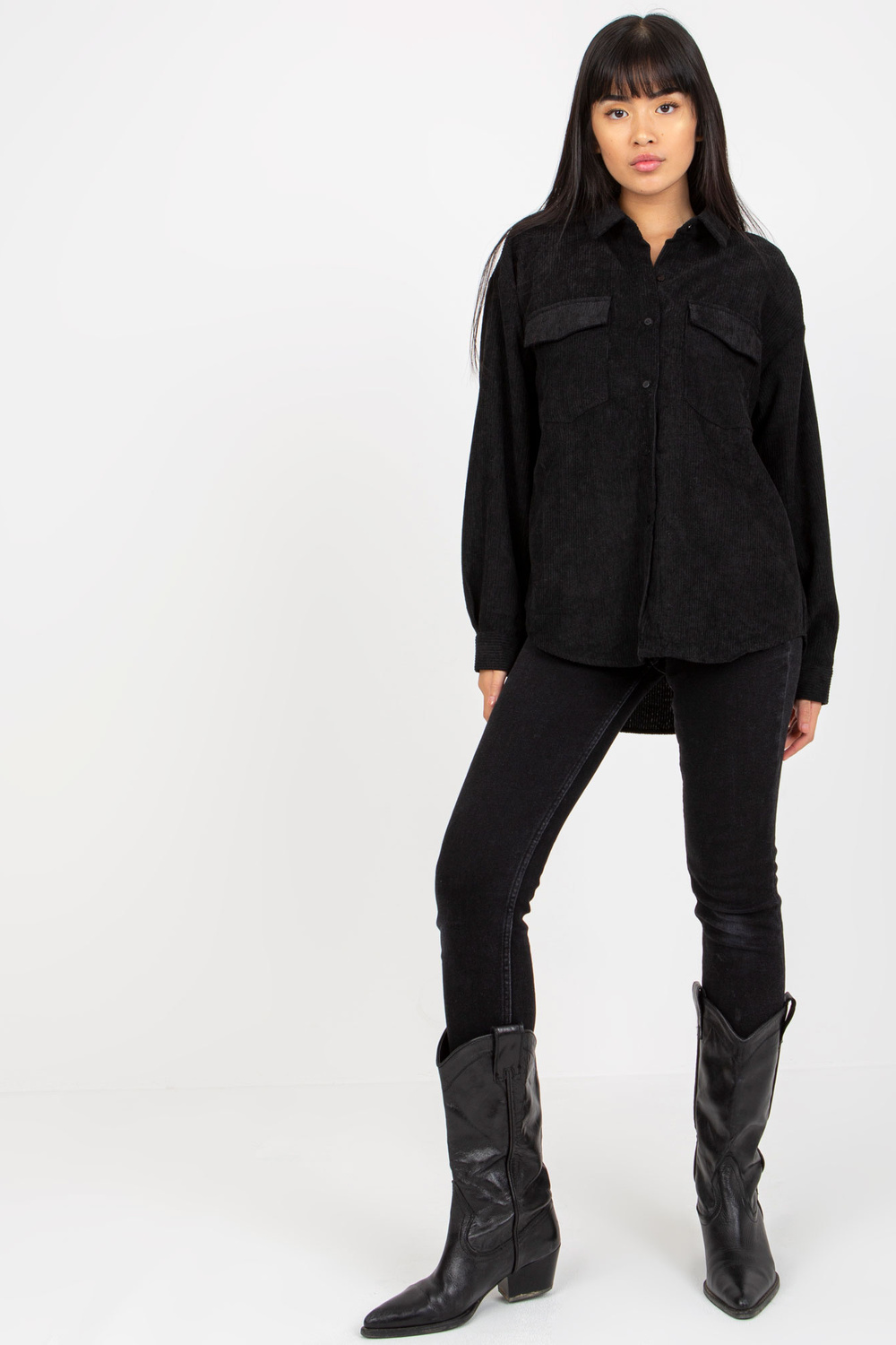 Juodi velveto viršutiniai marškiniai su sagomis.
