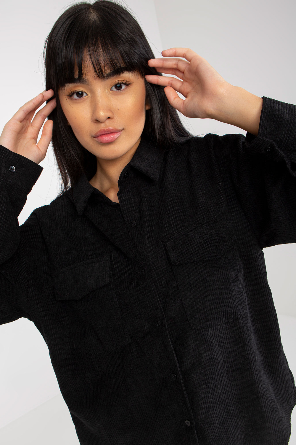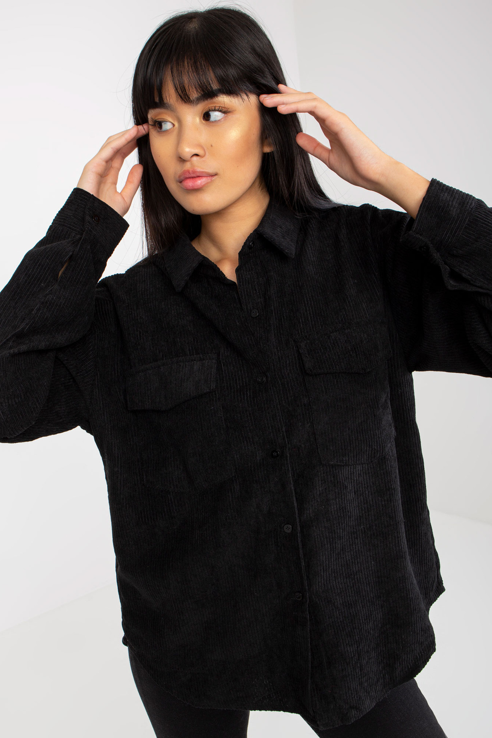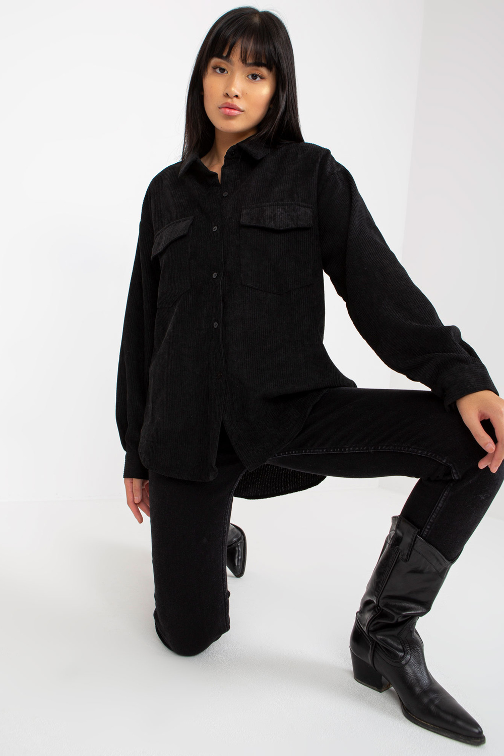Juodi velveto viršutiniai marškiniai su sagomis.
