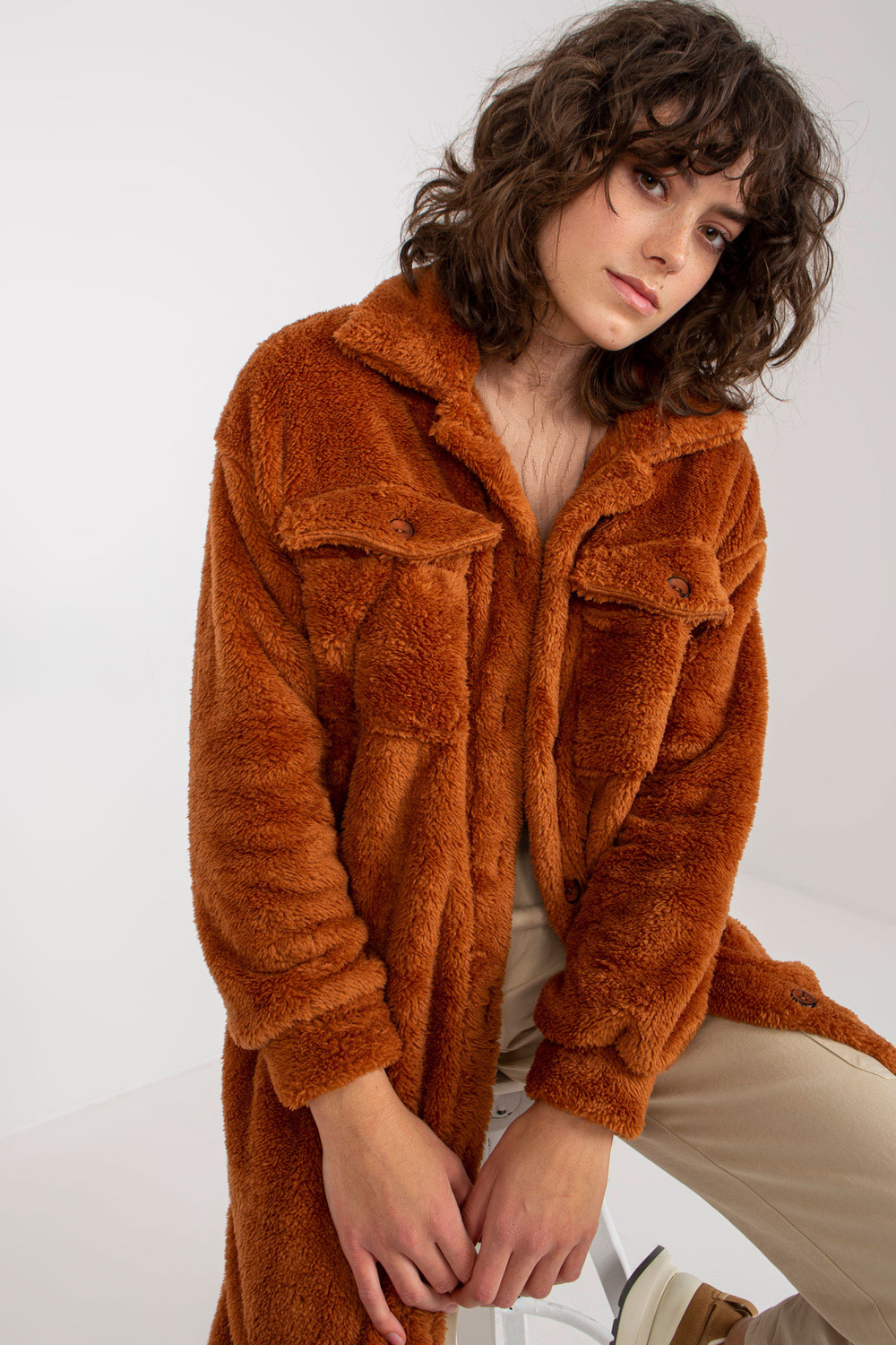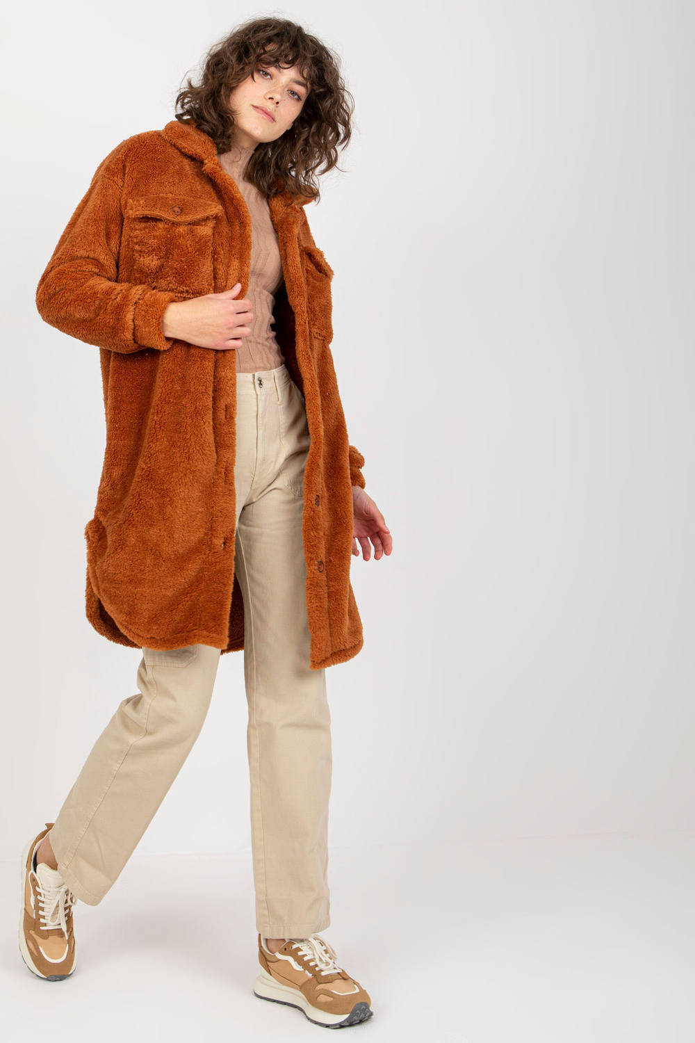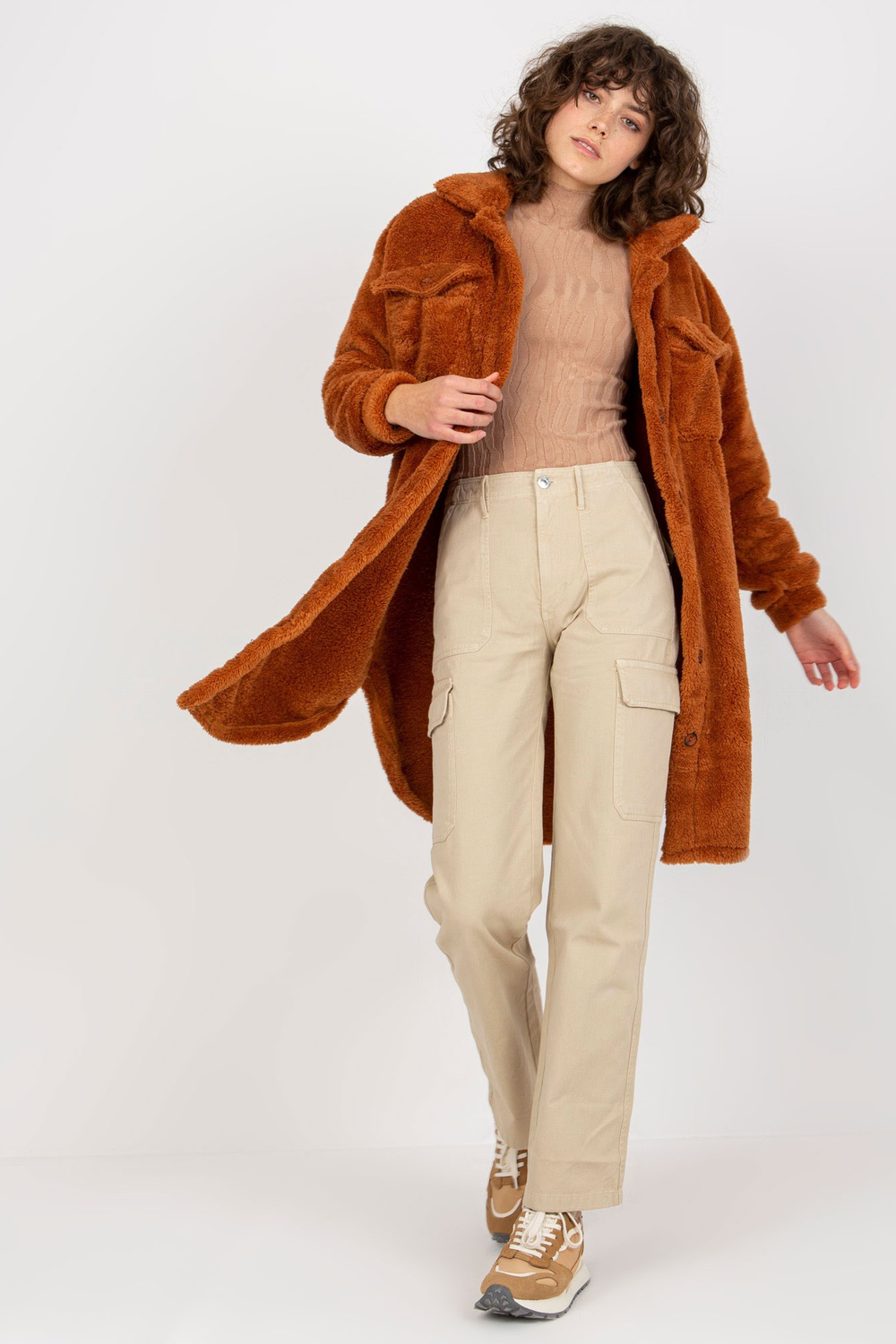 Šviesiai rudi ilgo kailio marškiniai su kišenėmis RUE PARIS.