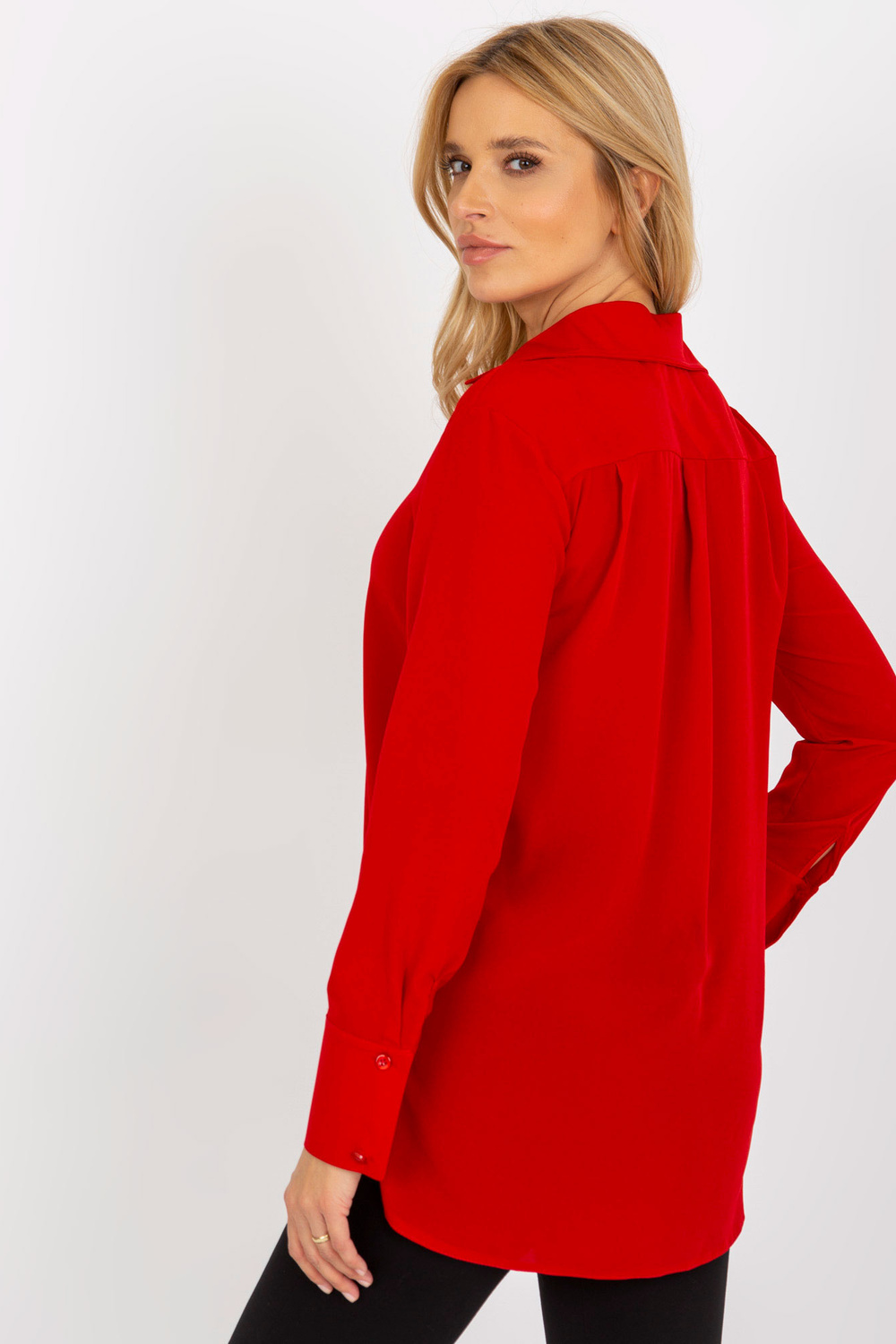 Raudoni elegantiški klasikiniai marškiniai ilgomis rankovėmis.