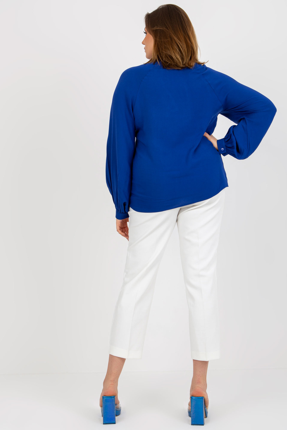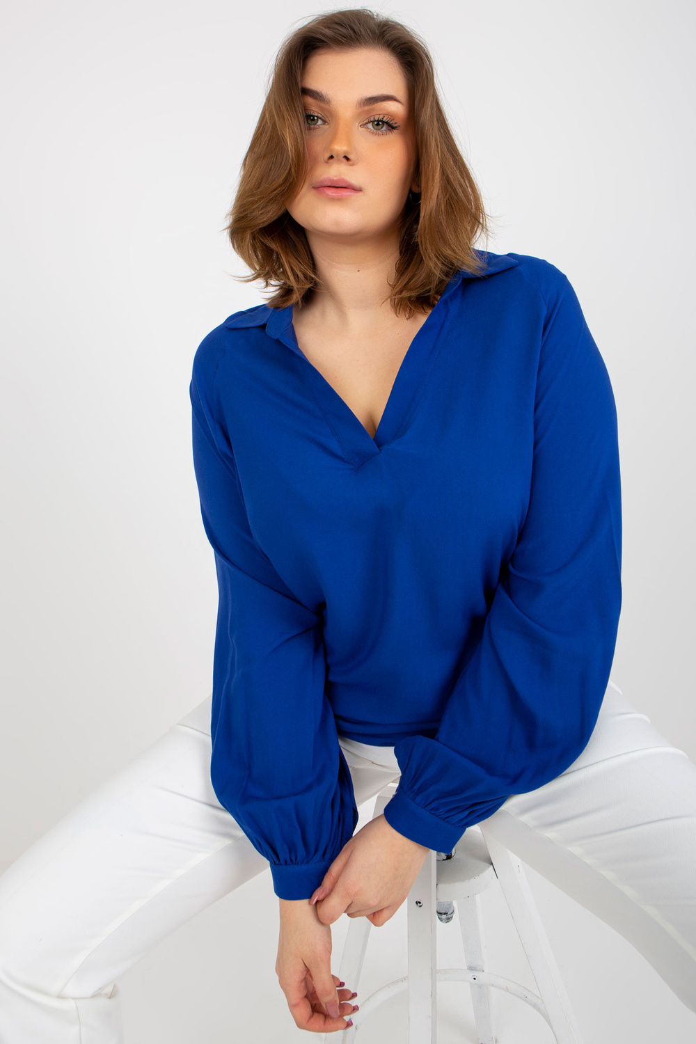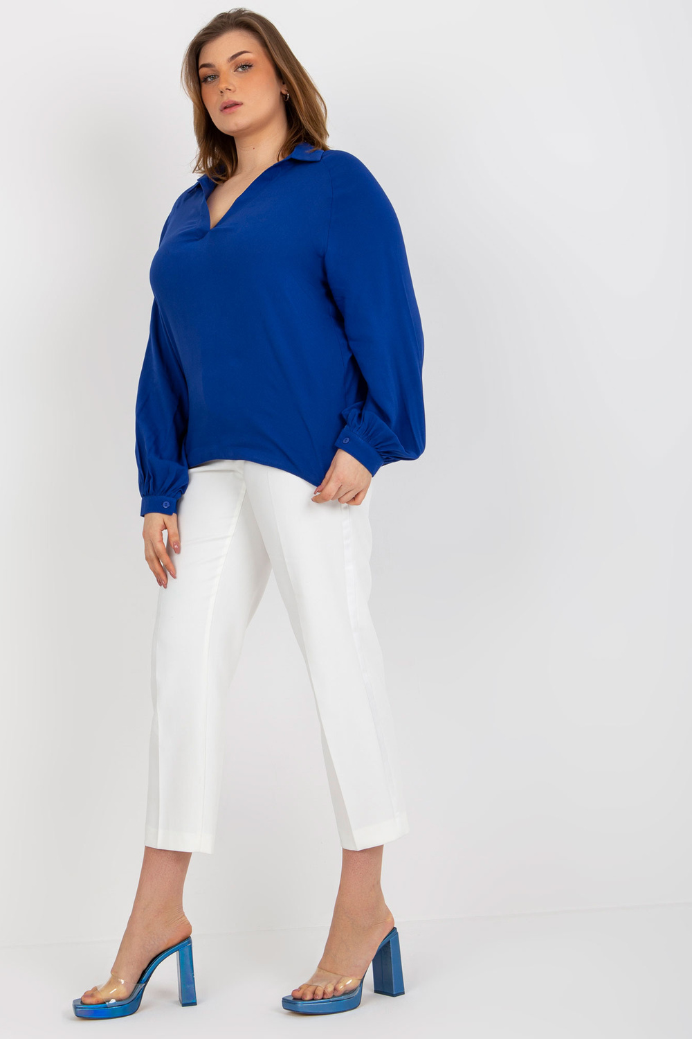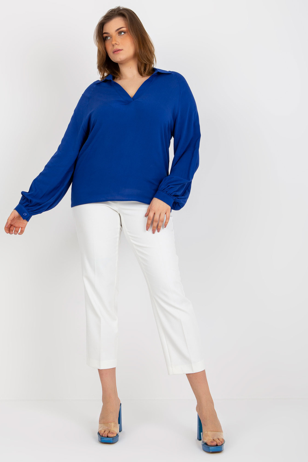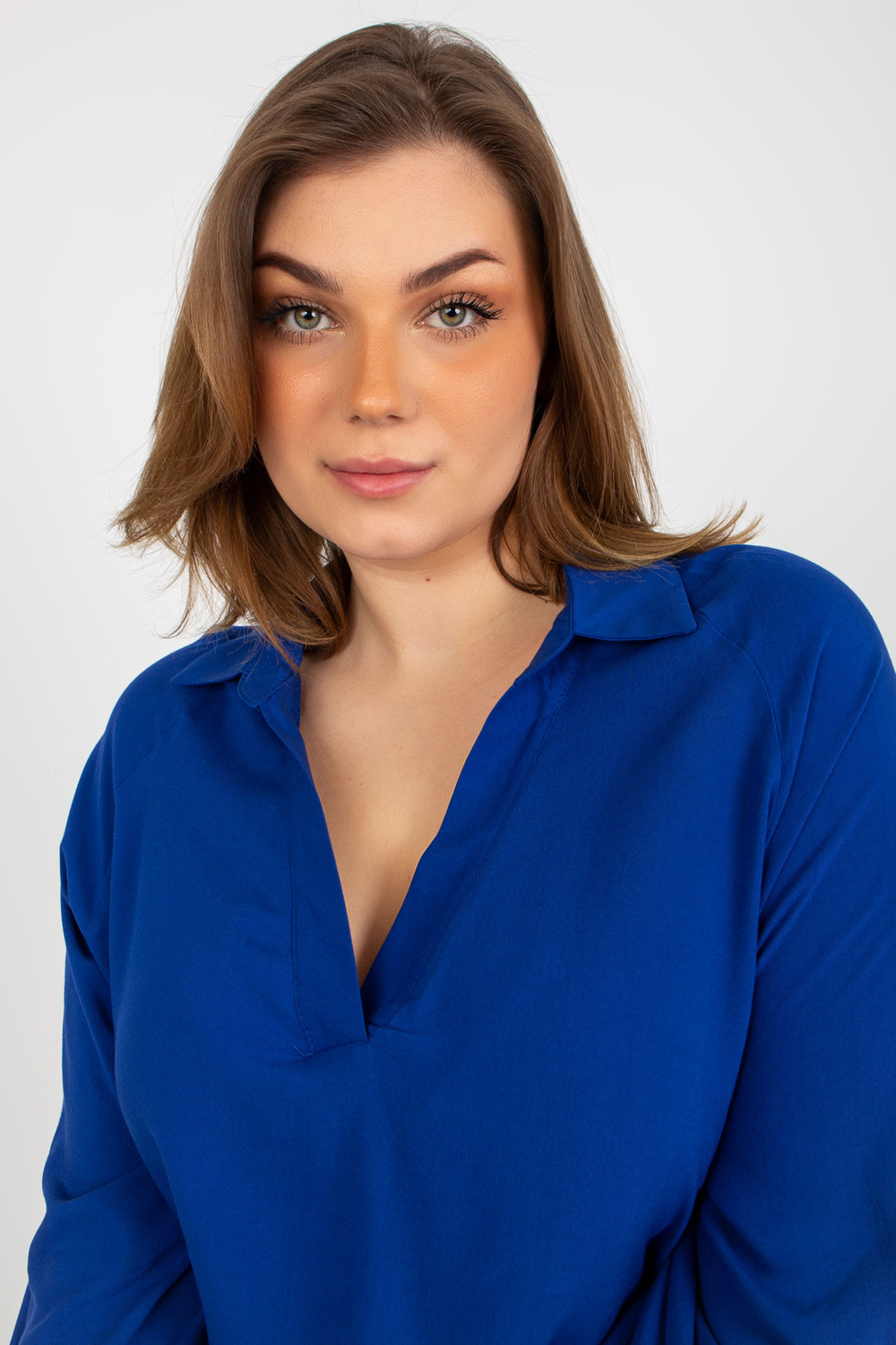 Tamsiai mėlyna plius dydžio marškinių palaidinė iš viskozės.