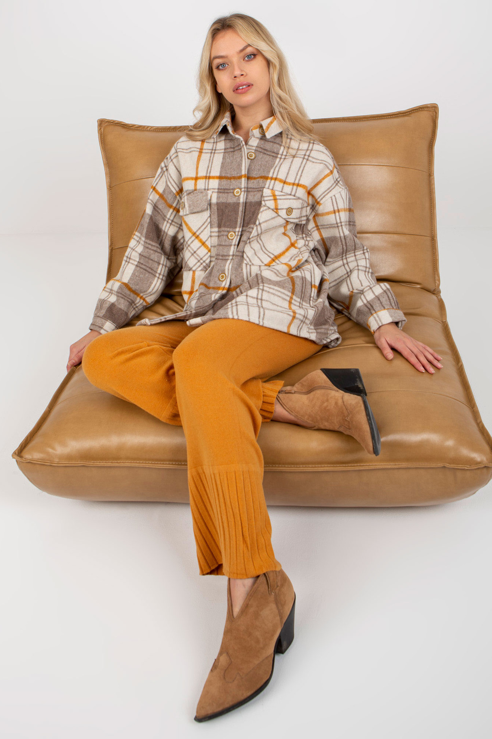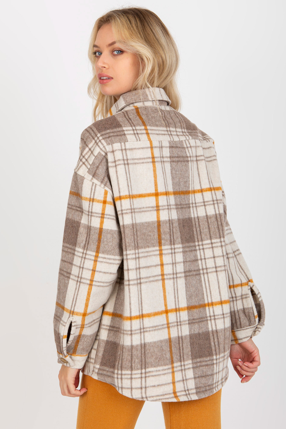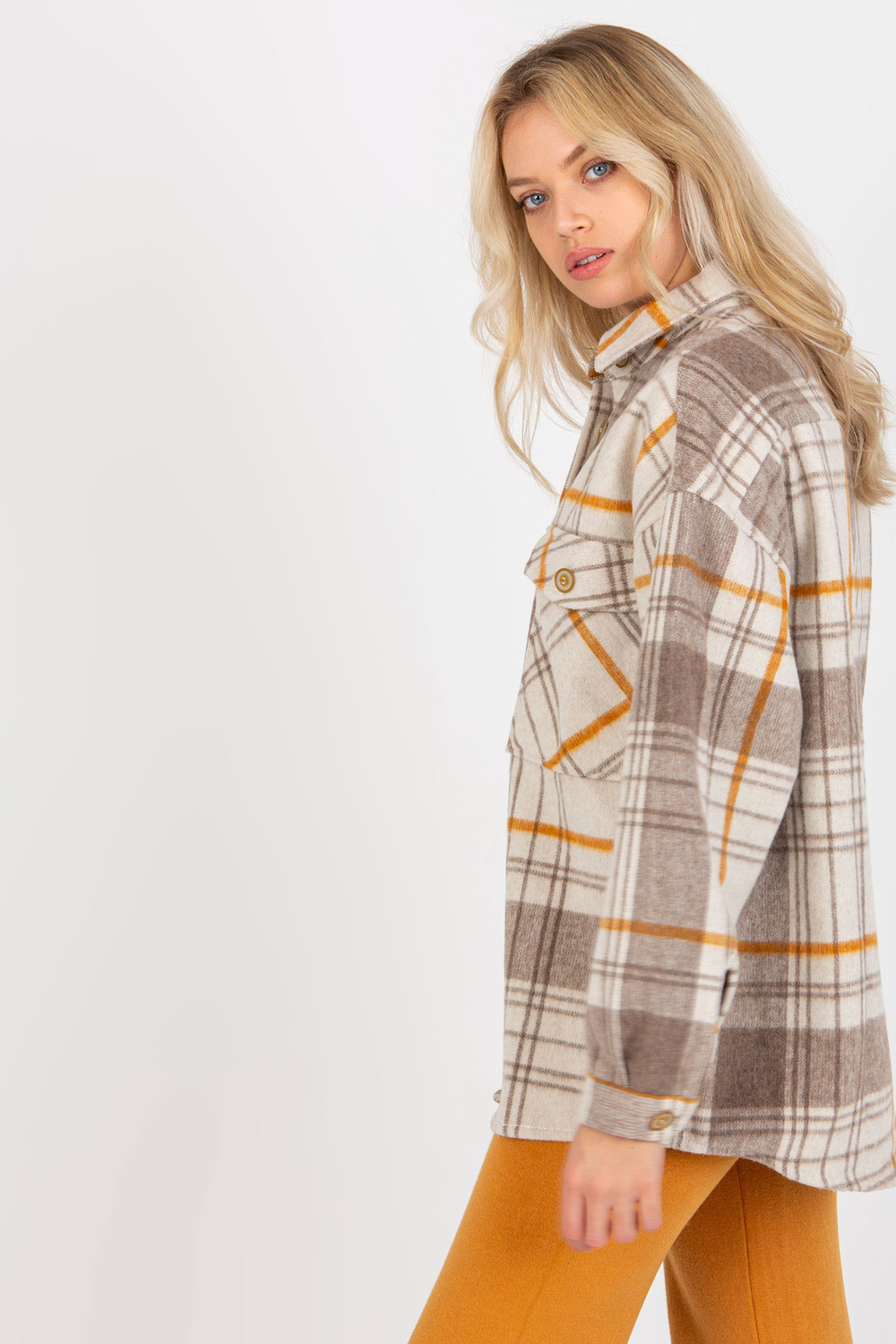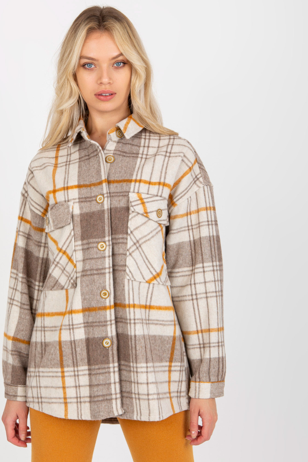 Smėlio spalvos moteriški šilti languoti marškiniai su kišenėmis .