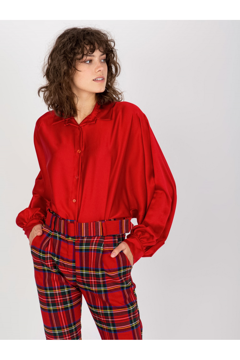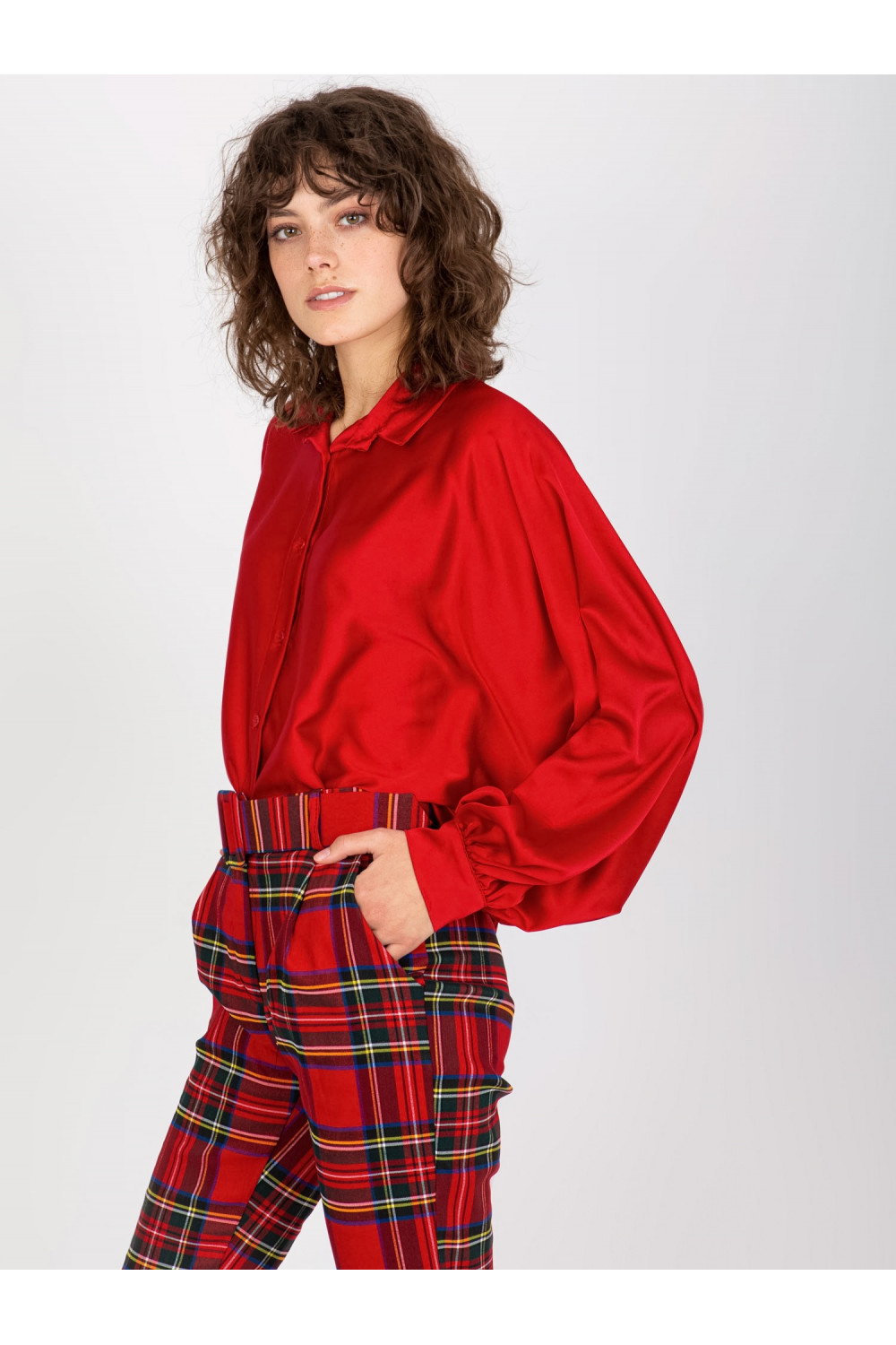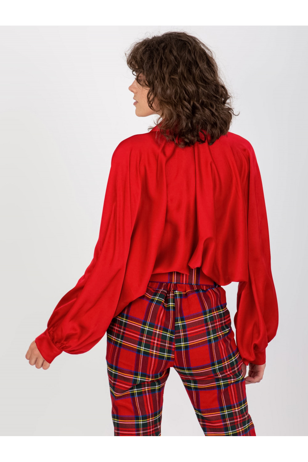 Tamsiai raudoni satino imitacijos marškiniai plačiomis rankovėmis Cristina.