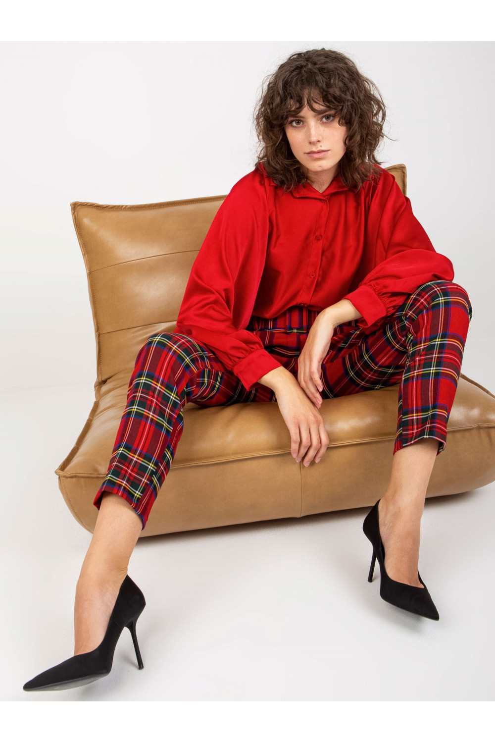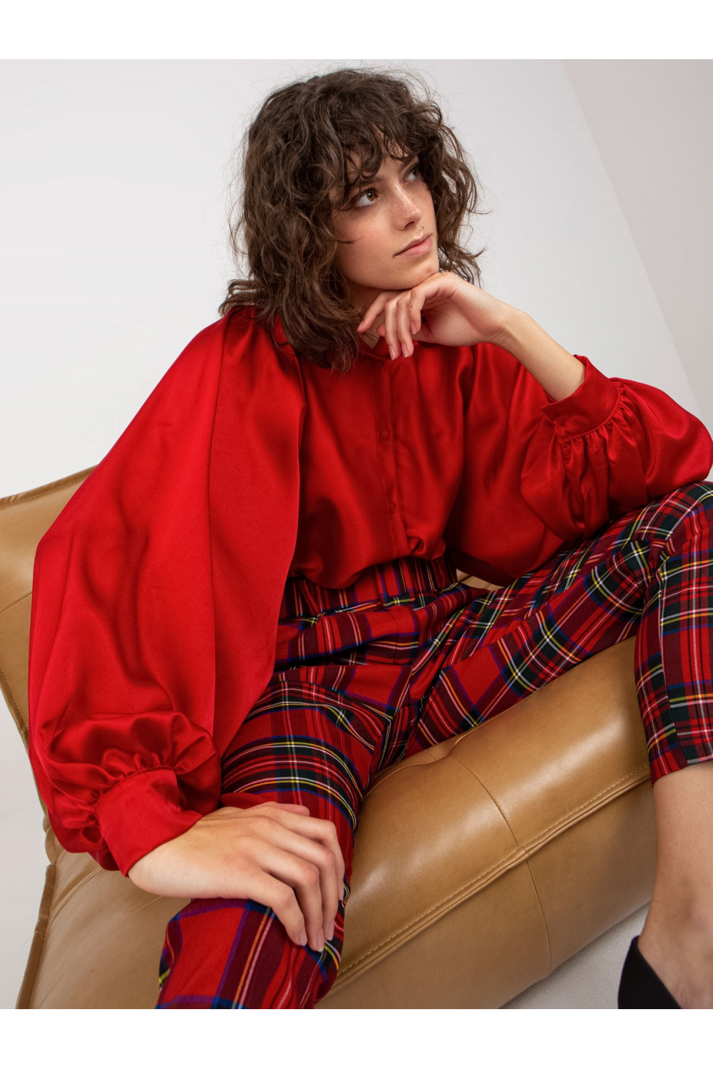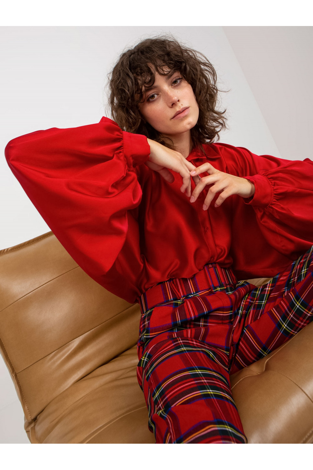 Tamsiai raudoni satino imitacijos marškiniai plačiomis rankovėmis Cristina.