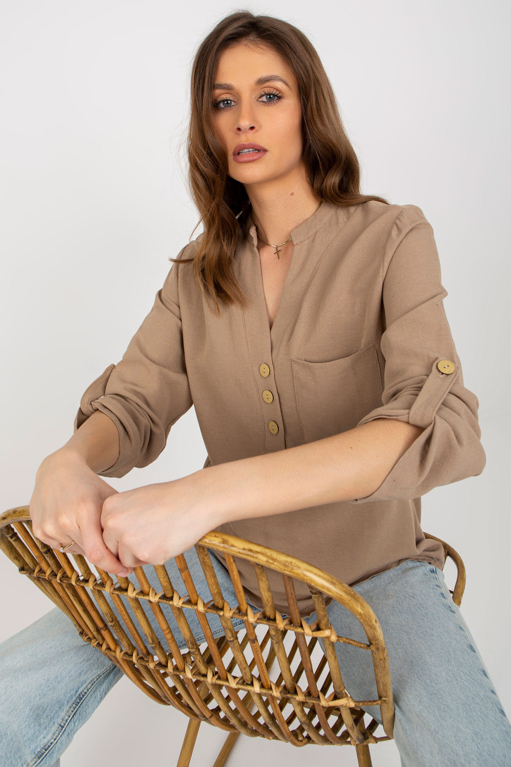Tamsiai smėlio spalvos marškinių palaidinė su stačia apykakle RUE PARIS. Prekės kodas: WN-KS-VE51.11X dominuojantis raštas: lygus Stilius: boho progai: laisvalaikis, darbui, vasarai Modelis dėvi S dydį. Modelio išmatavimai: aukštis 176 cm, krūtinė 85 cm, juosmuo 64 cm,