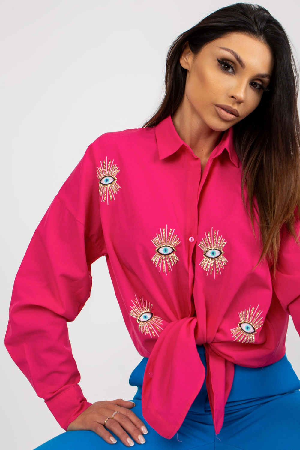 Negabaritinės fuksijos spalvos megztiniai su apykakle.