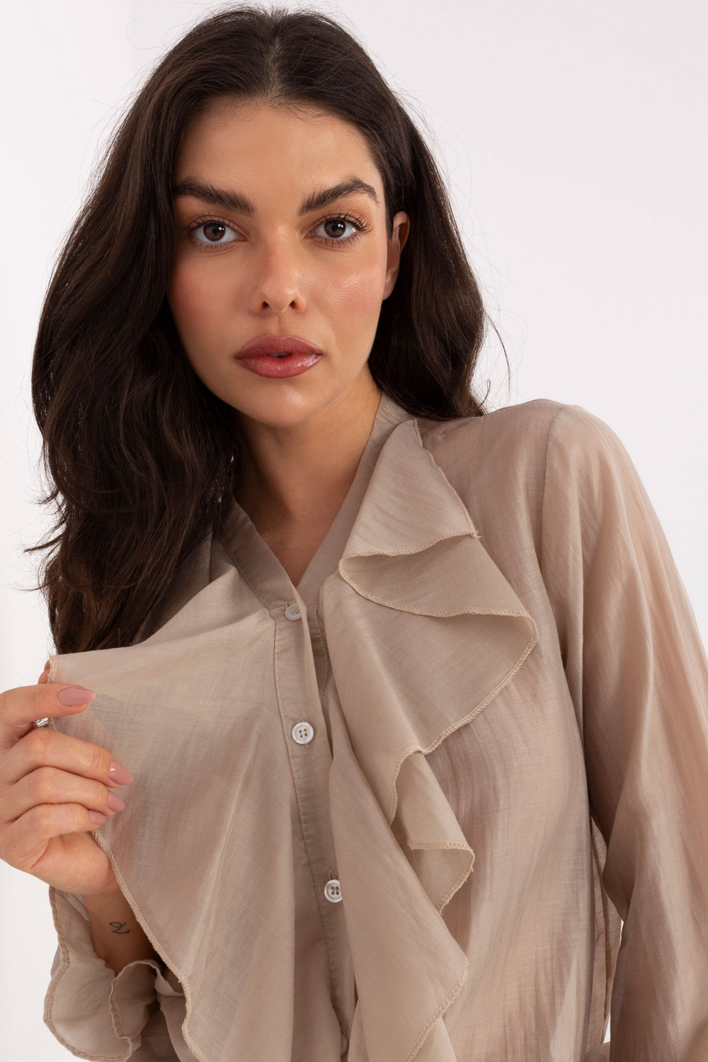 Modelis dėvi vieno dydžio drabužį. Modelio išmatavimai:  ūgis 173 cm, krūtinė 85 cm, liemuo 62 cm, klubai 95 cm .