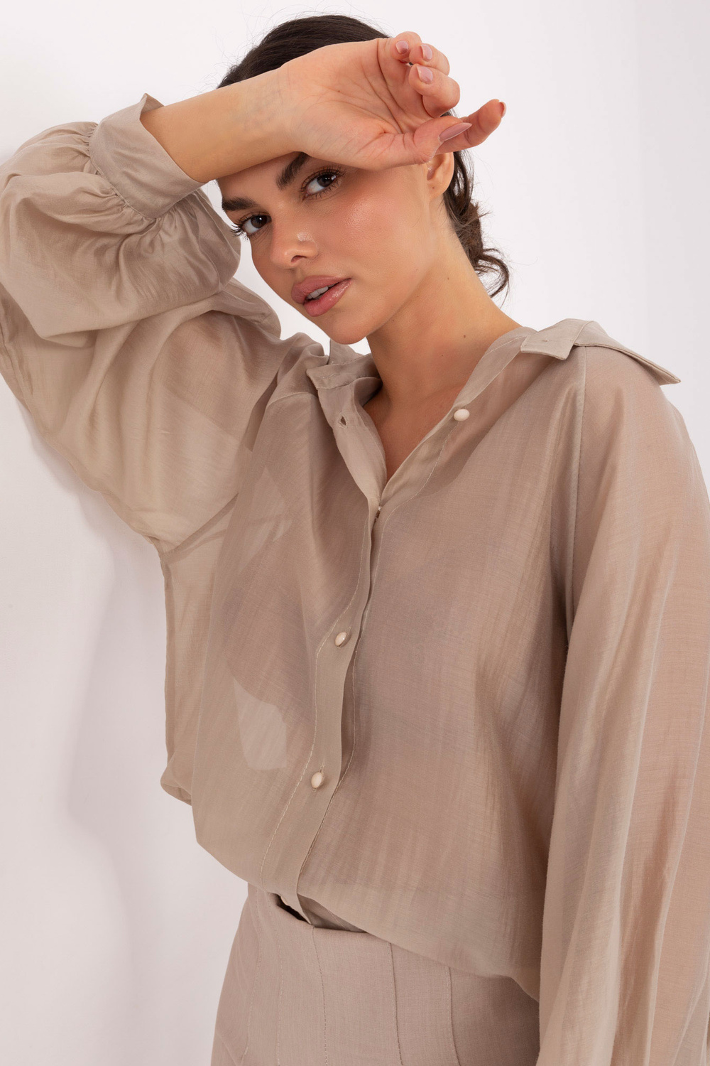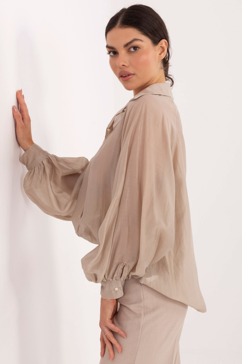 Modelis dėvi vieno dydžio drabužį. Modelio išmatavimai: ūgis 173 cm, krūtinė 85 cm, liemuo 62 cm, klubai 95 cm .