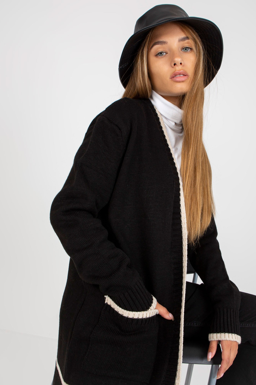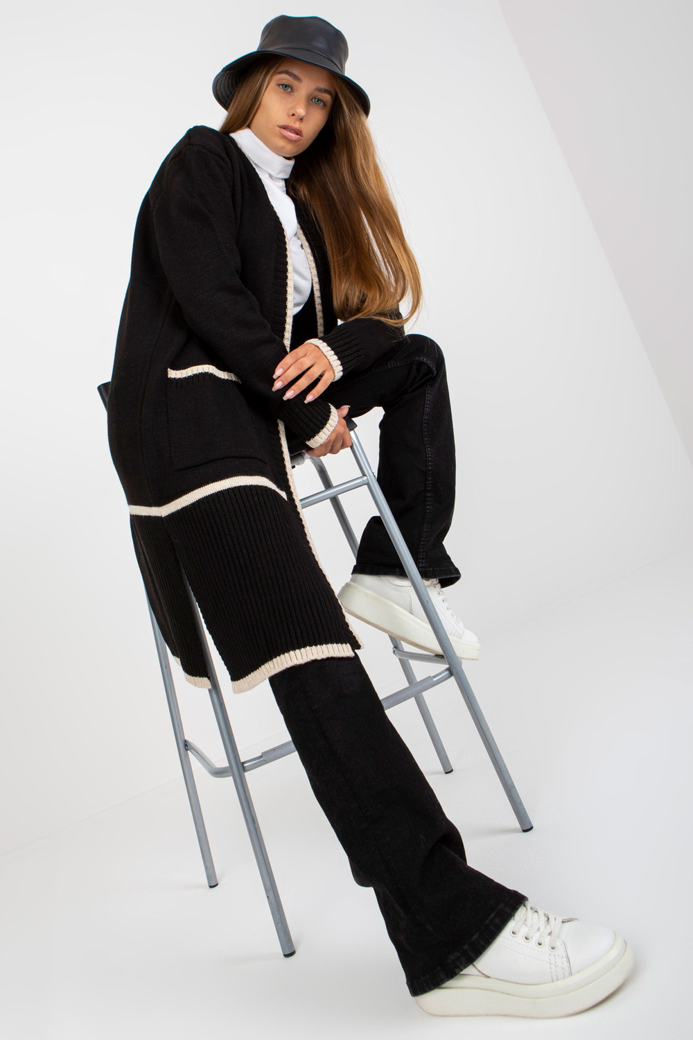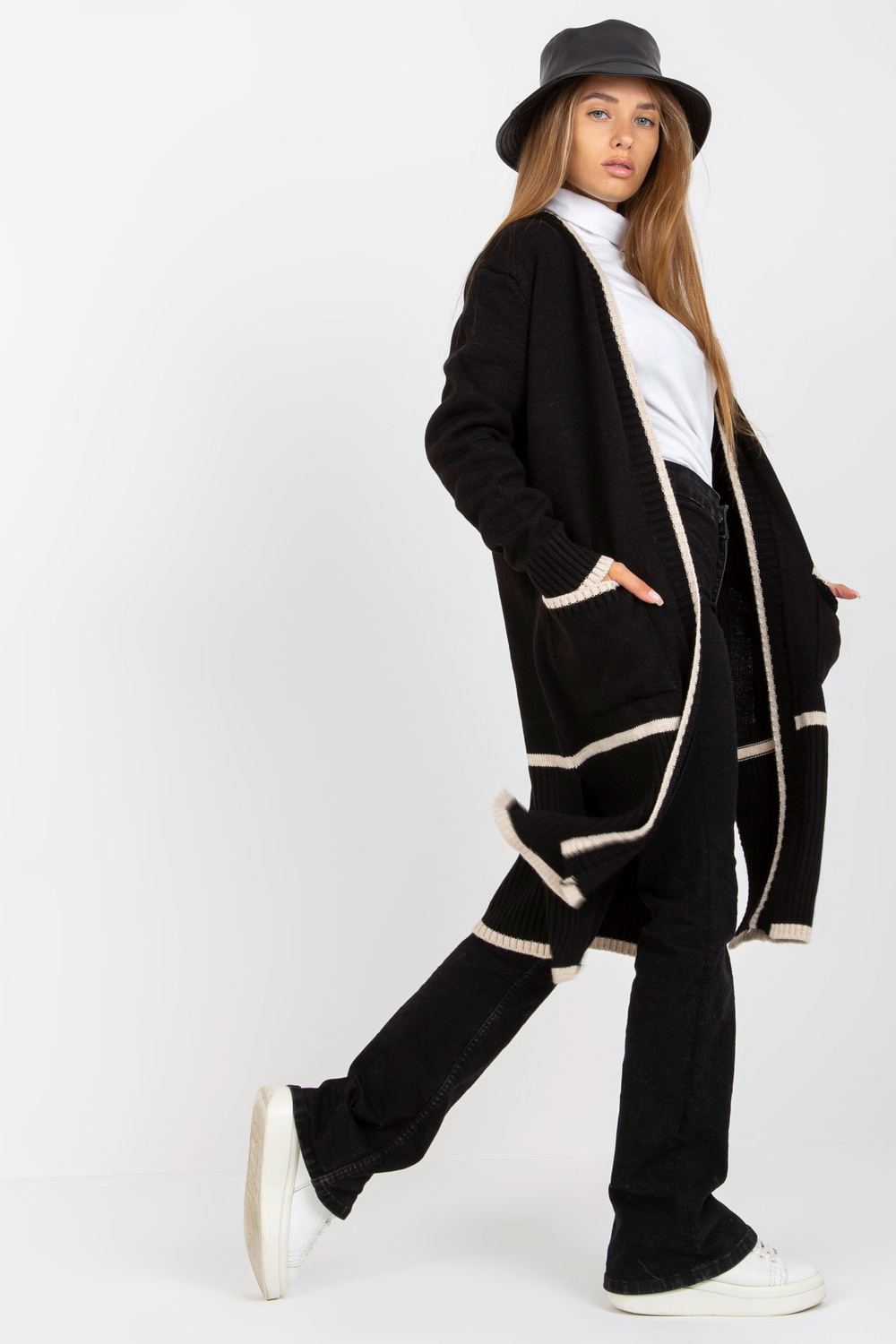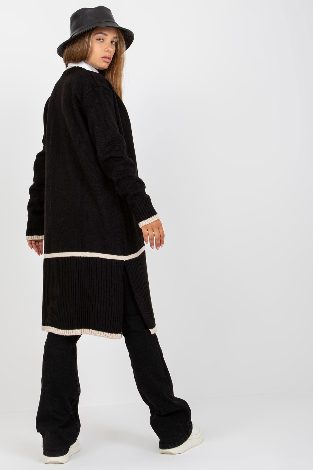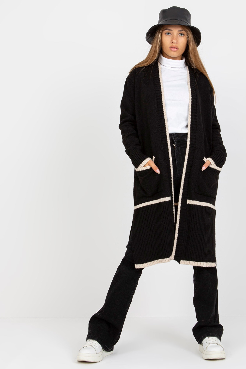 Juodas smėlio spalvos ilgas megztinis be užsegimo RUE PARIS . Produkto kodas: LC-SW-0340.42P dominuojantis raštas: lygus Stilius: laisvalaikis: laisvalaikis, į miestą, pasivaikščioti, į darbą Modelis dėvi vieno dydžio modelio matmenys: ūgis 163 cm, krūtinė 86 cm