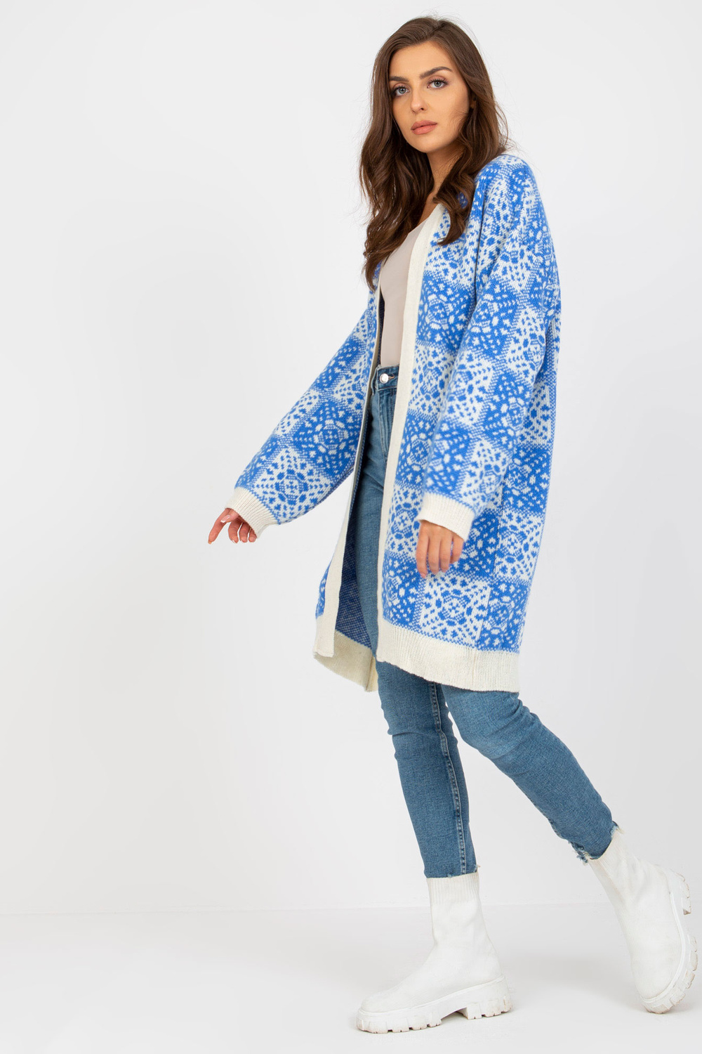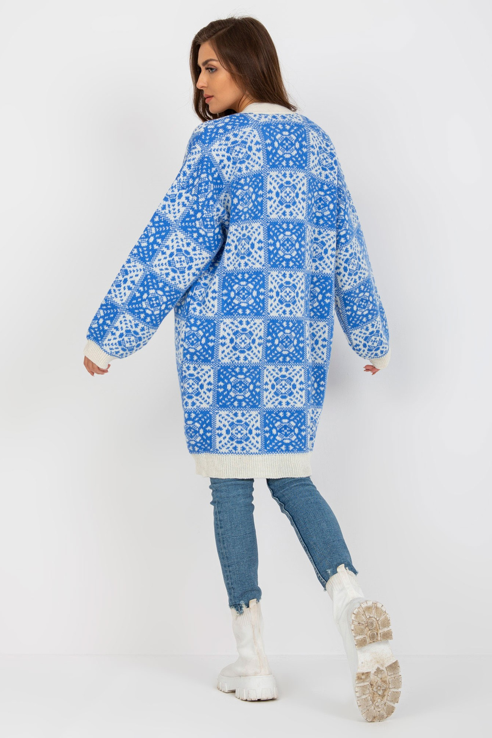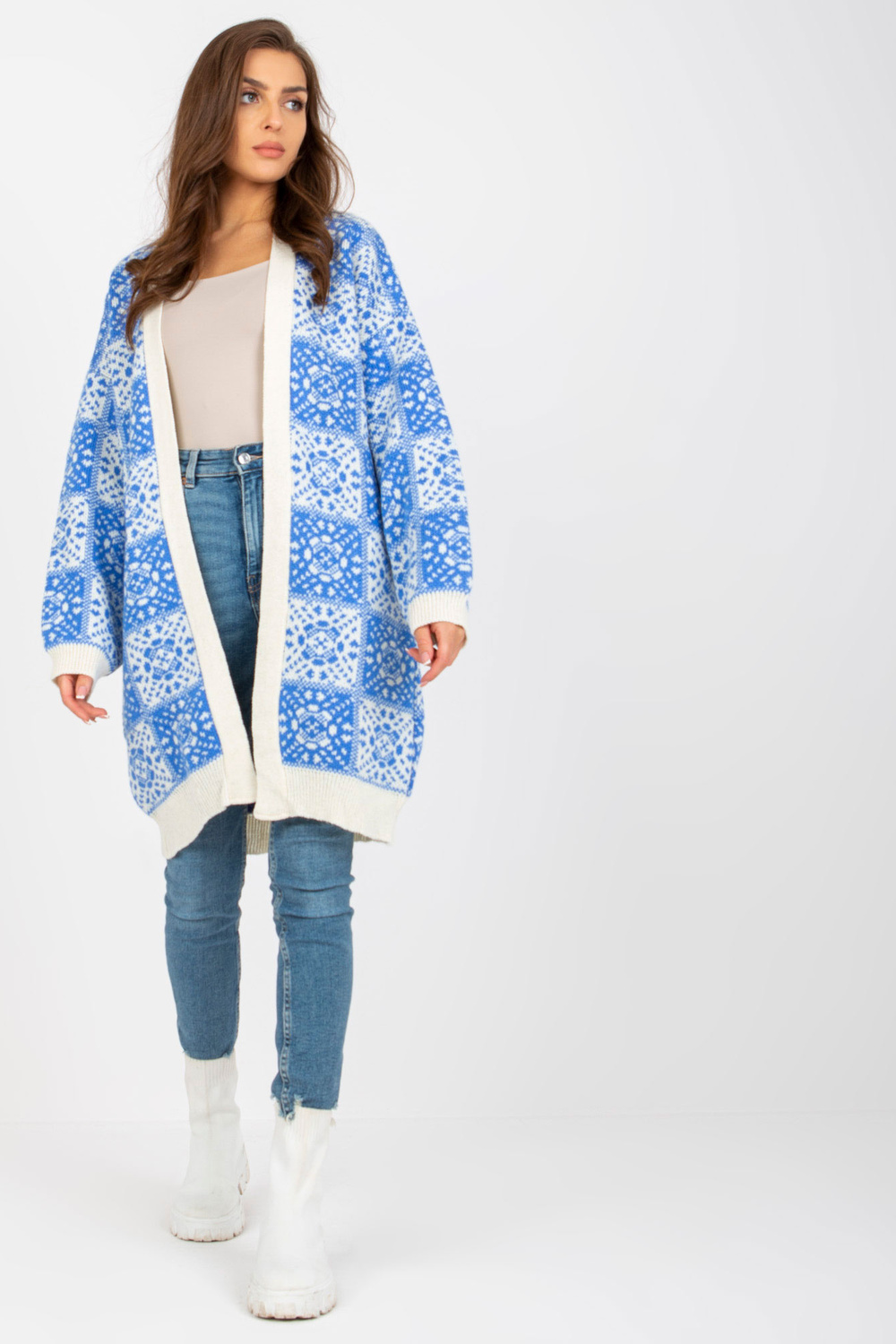 Vieno dydžio megztinio matmenys matuojami plokščiai: plotis po pažastimis - 64 cm, bendras ilgis - 85 cm, rankovių ilgis - 58 cm.
