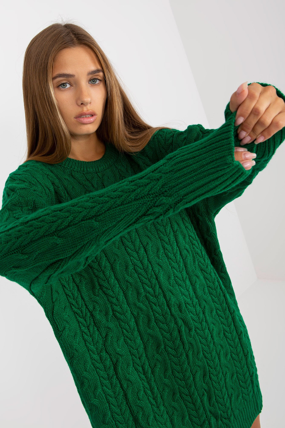 Žalias ilgas megztinis su pynėmis ir apvalia iškirpte RUE PARIS . Produkto kodas: LC-SW-8010.22P dominuojantis raštas: sklandus Stilius: laisvalaikis: laisvalaikis, į miestą, pasivaikščioti, į darbą Modelis dėvi vieno dydžio dydį. Modelio matmenys: aukštis 163 cm, b