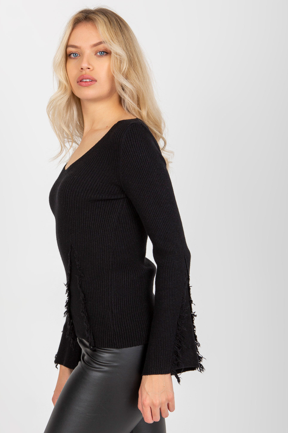 Klasikinis juodas megztinis su briaunelėmis platėjančiomis rankovėmis .