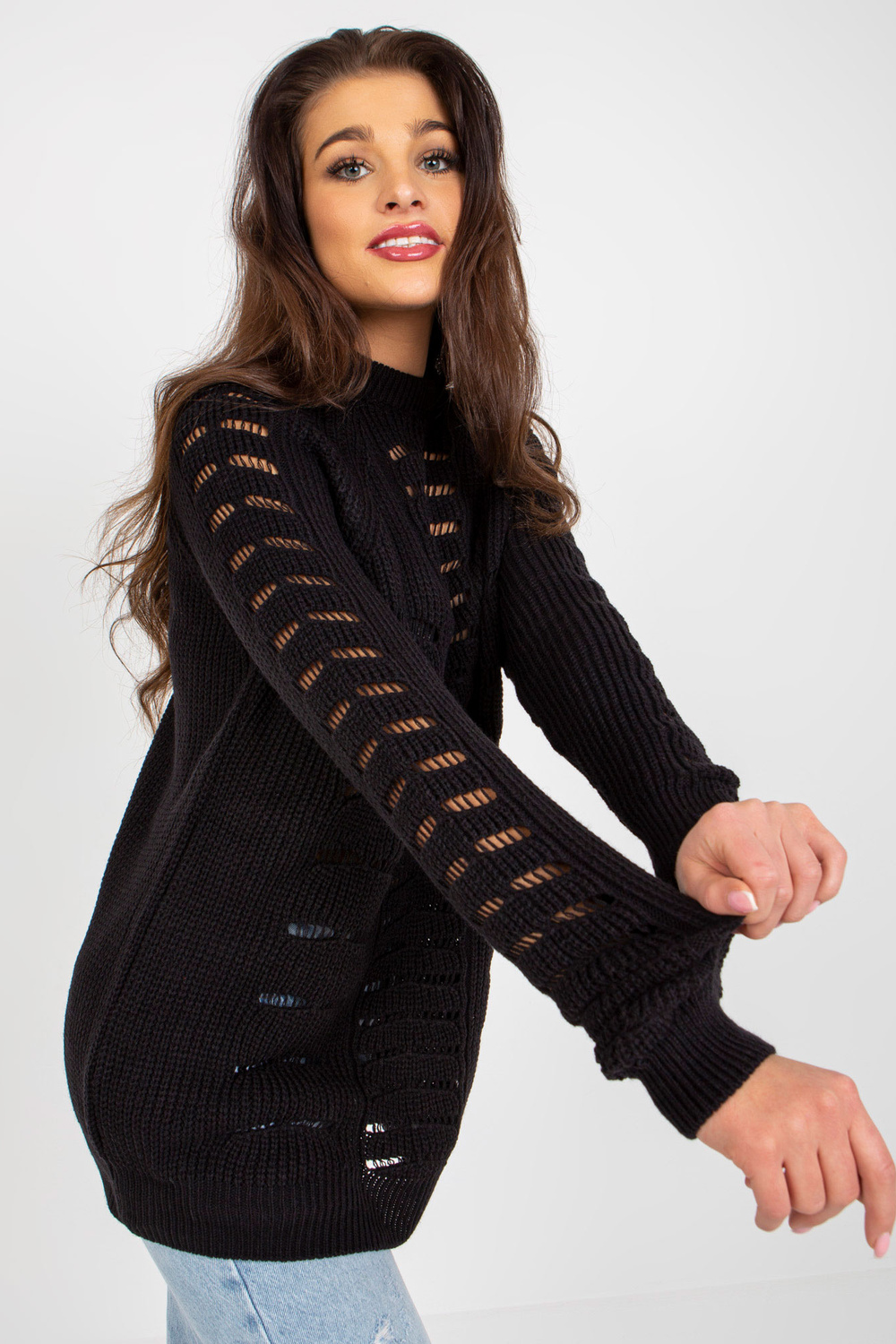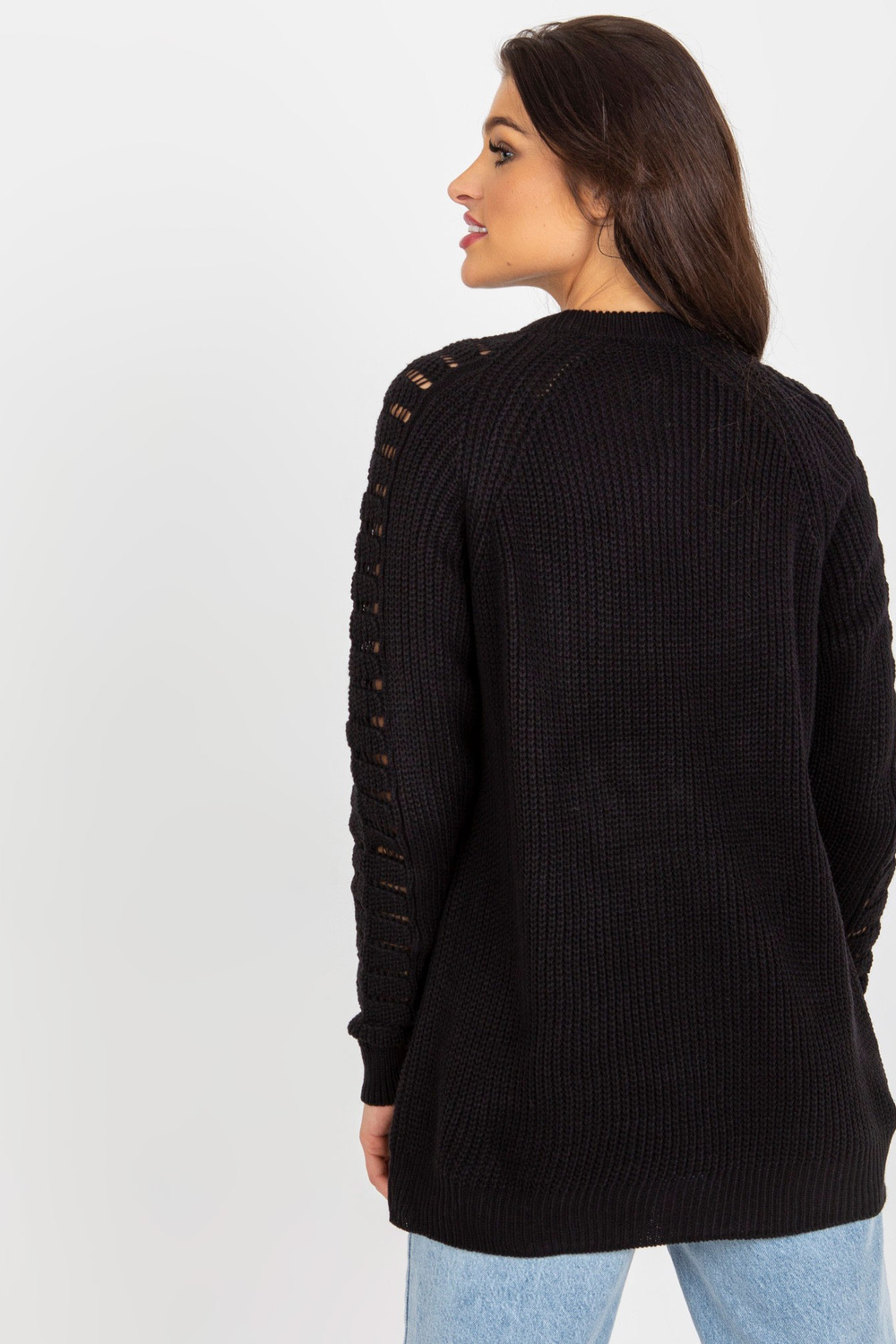 Juodas ažūrinis oversize megztinis su vilna.