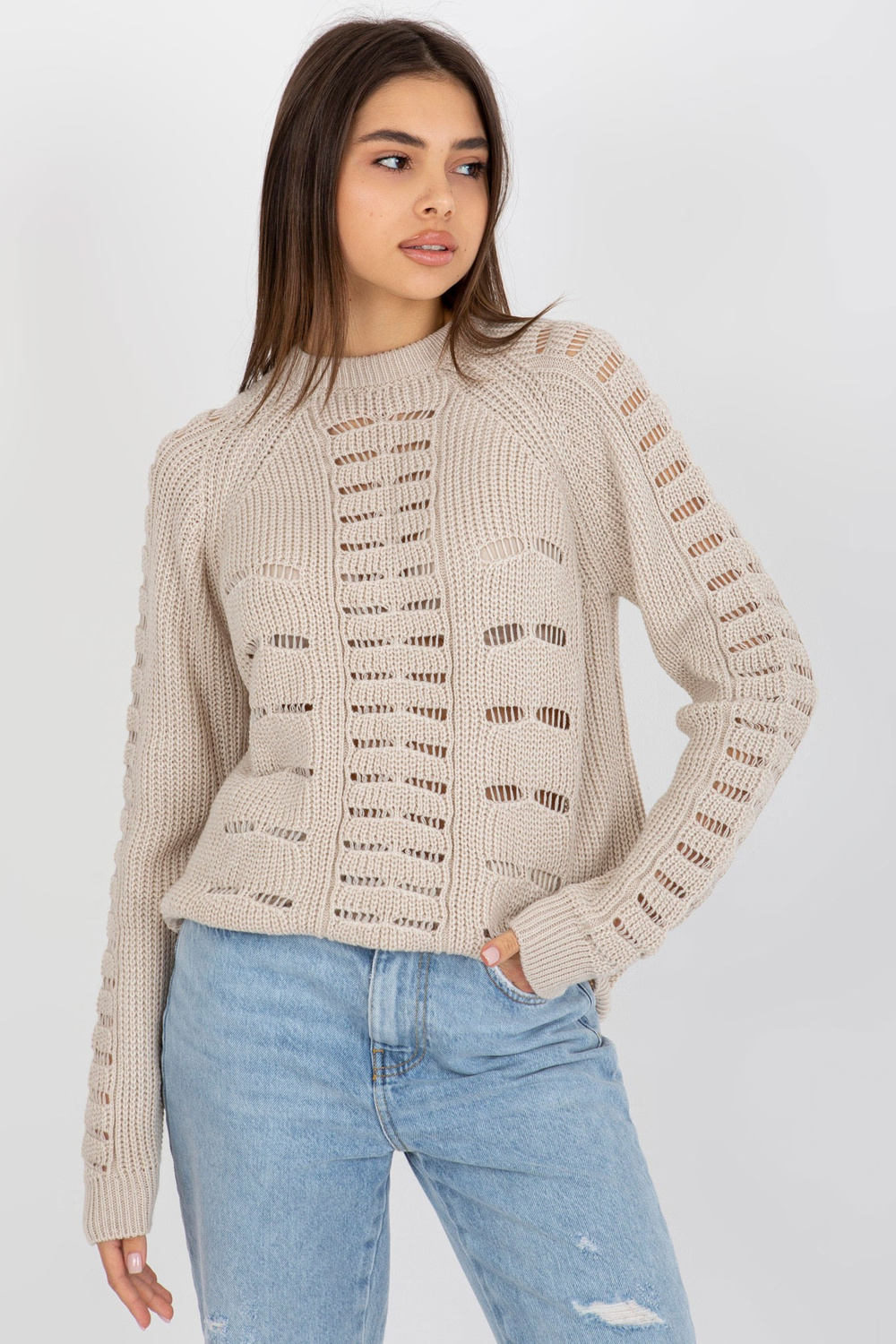 Smėlio spalvos ilgesnis oversize megztinis ažūriniu raštu.