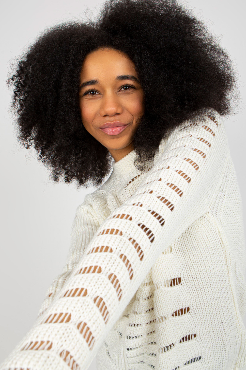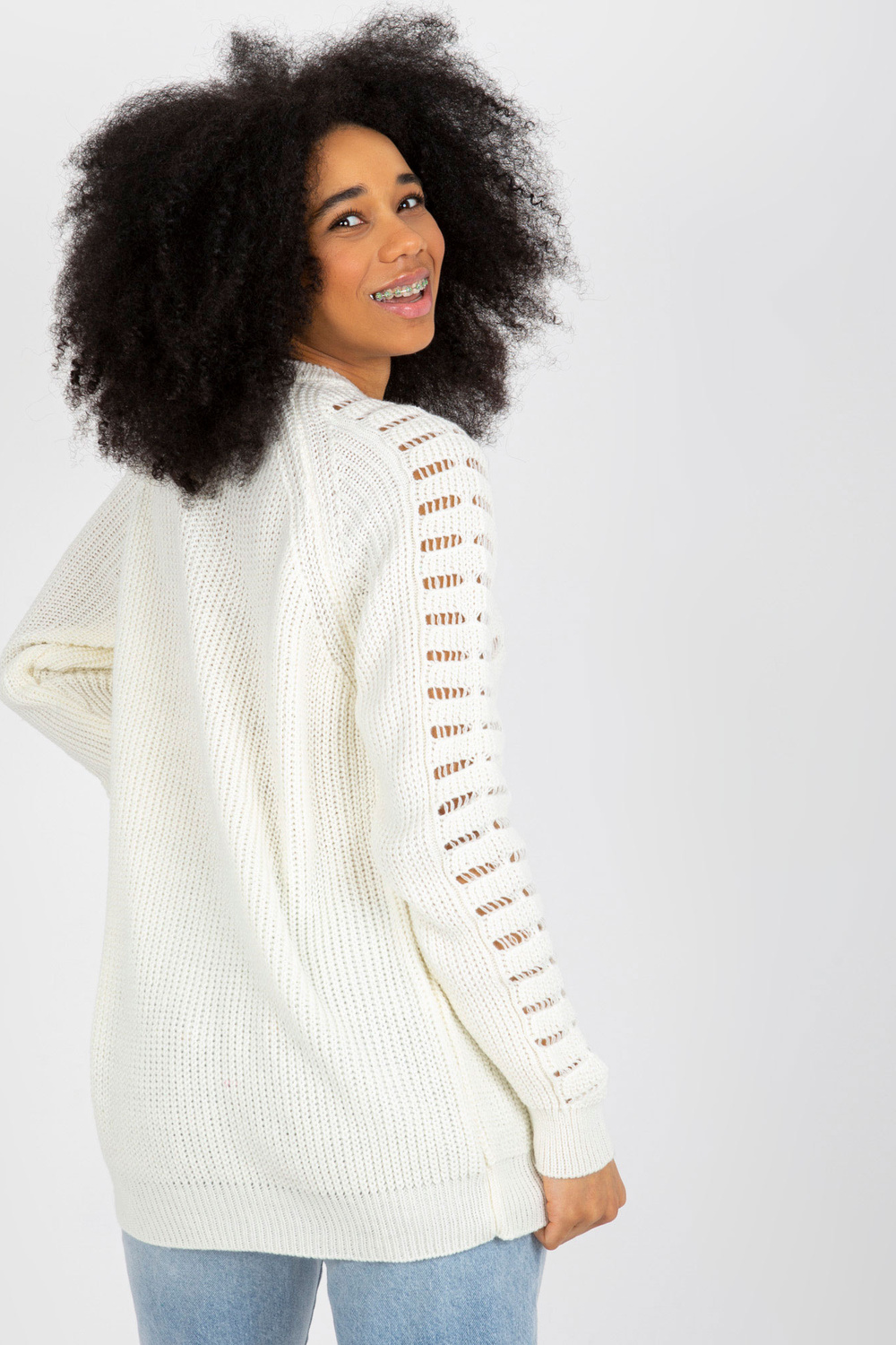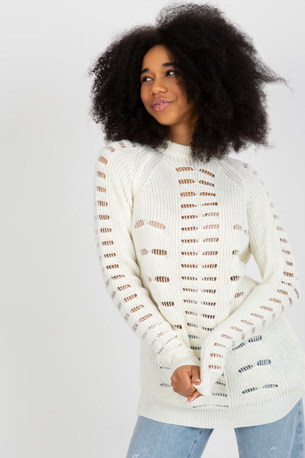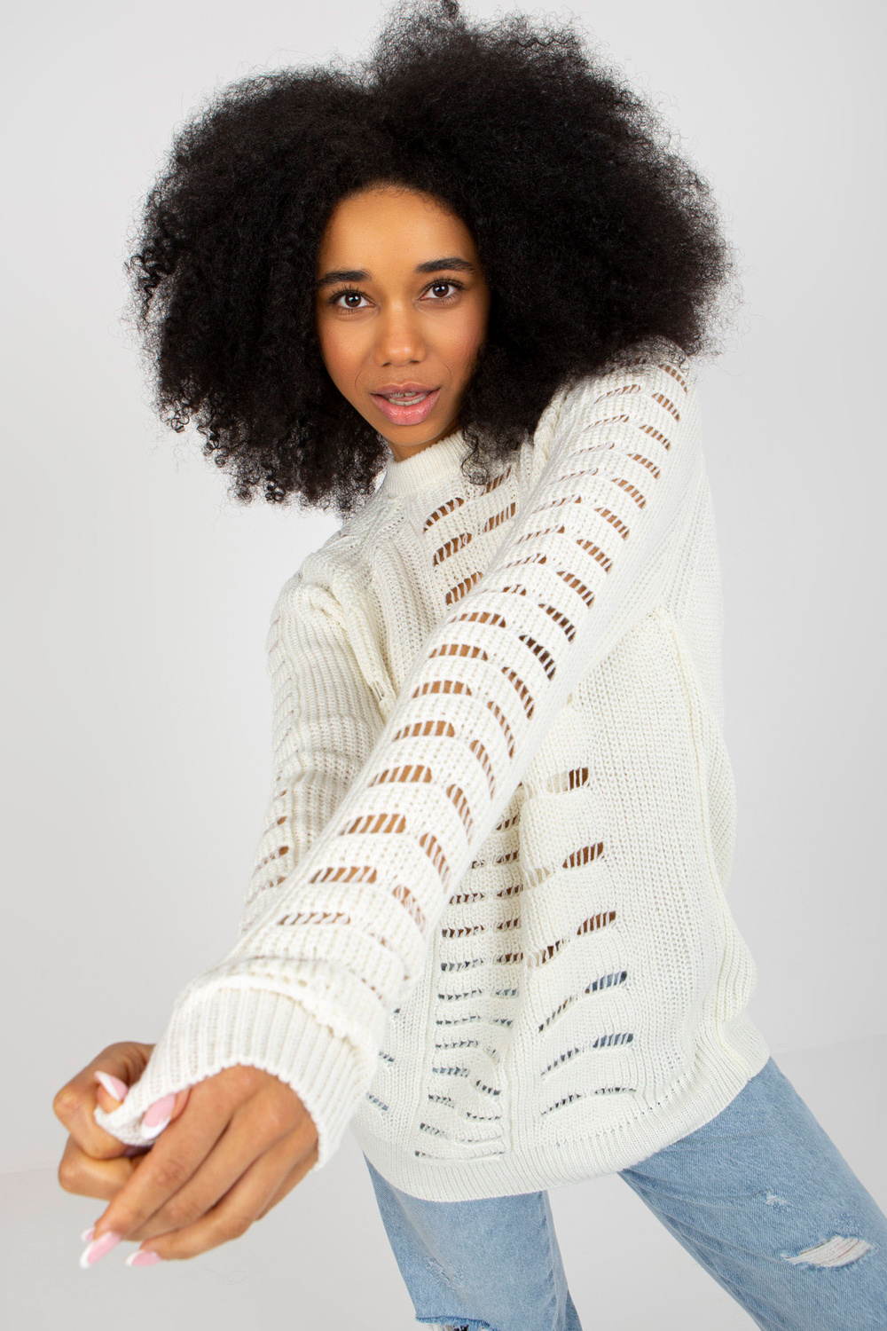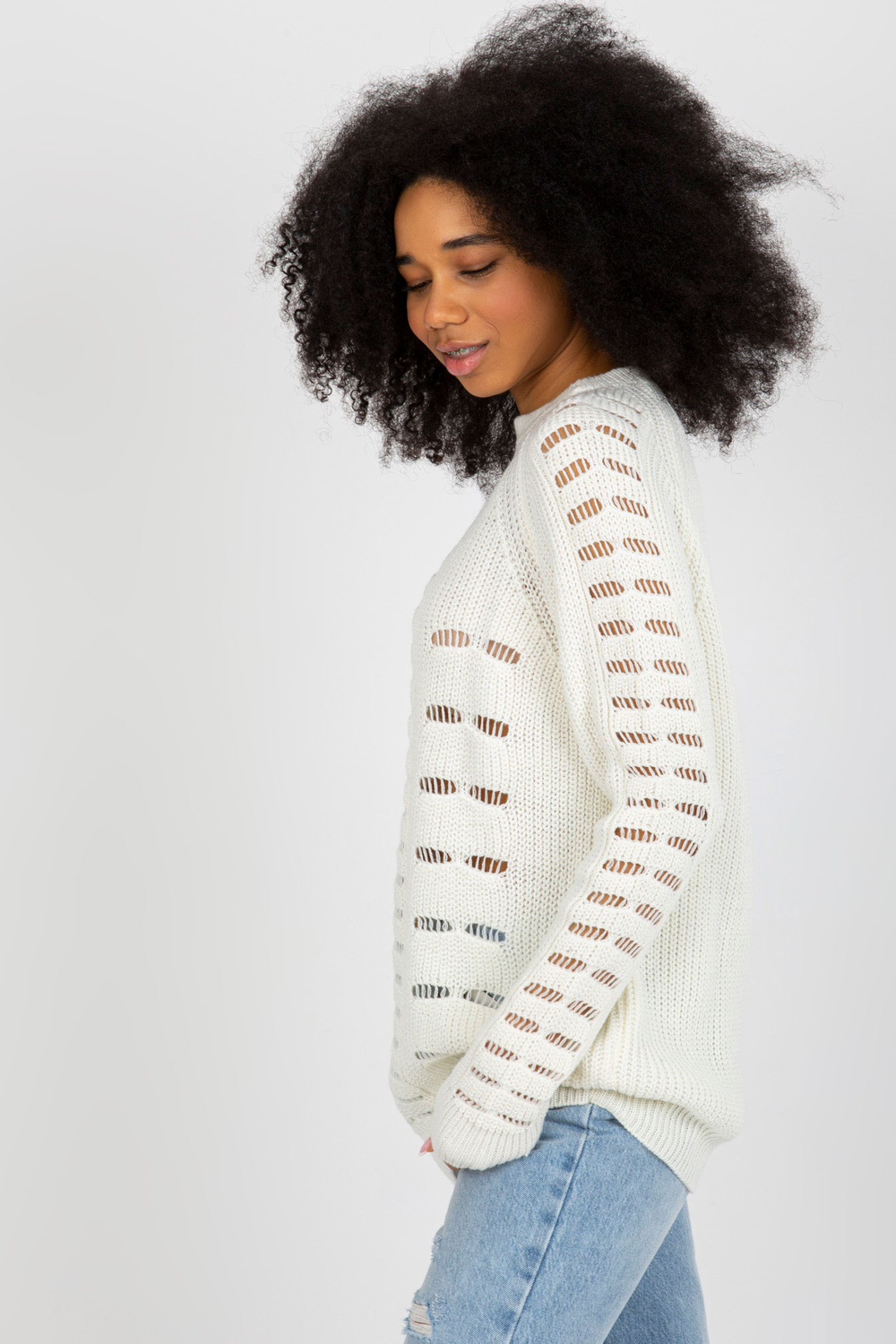 Negabaritinis moteriškas ažūrinio rašto megztinis.
