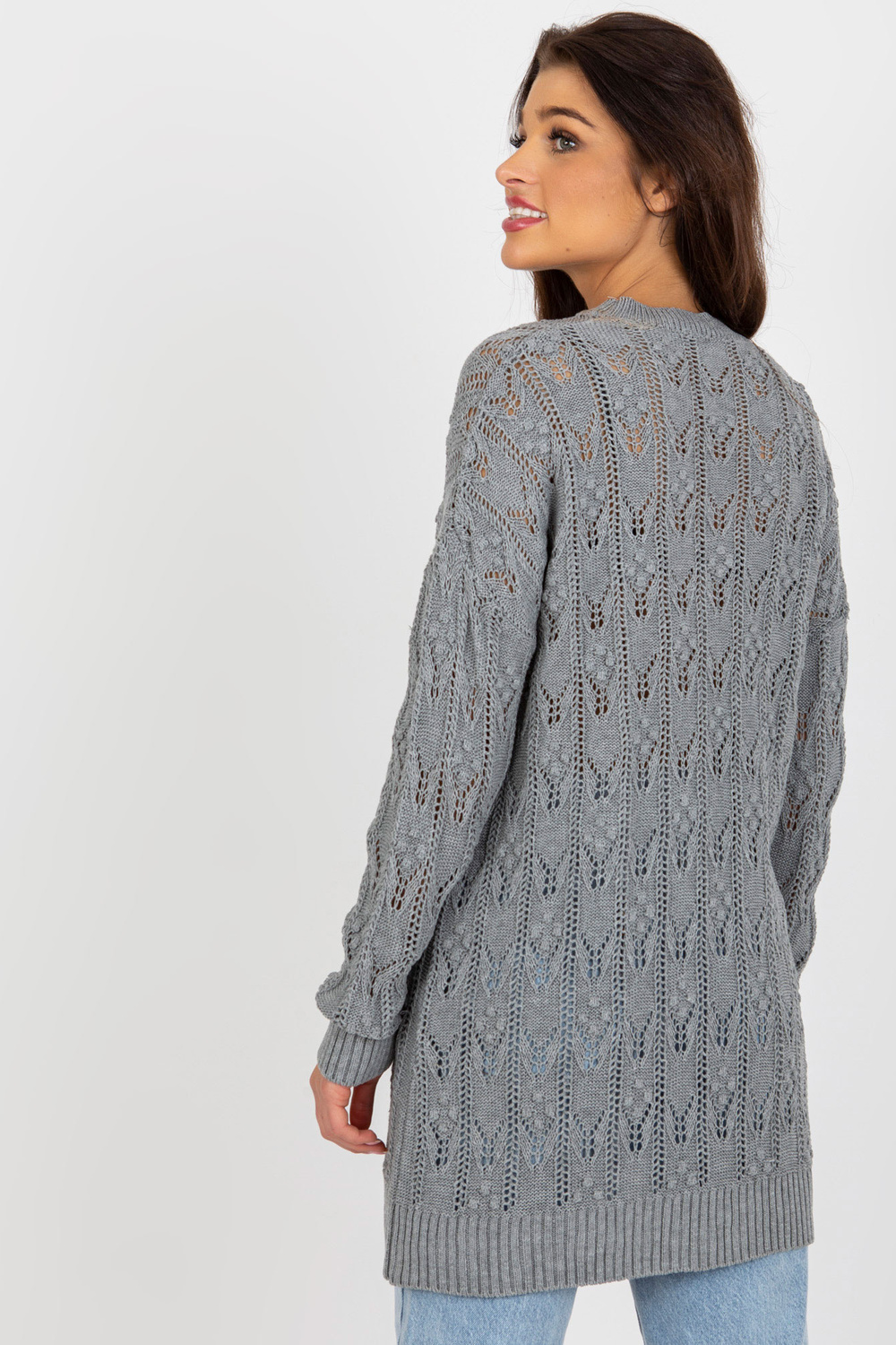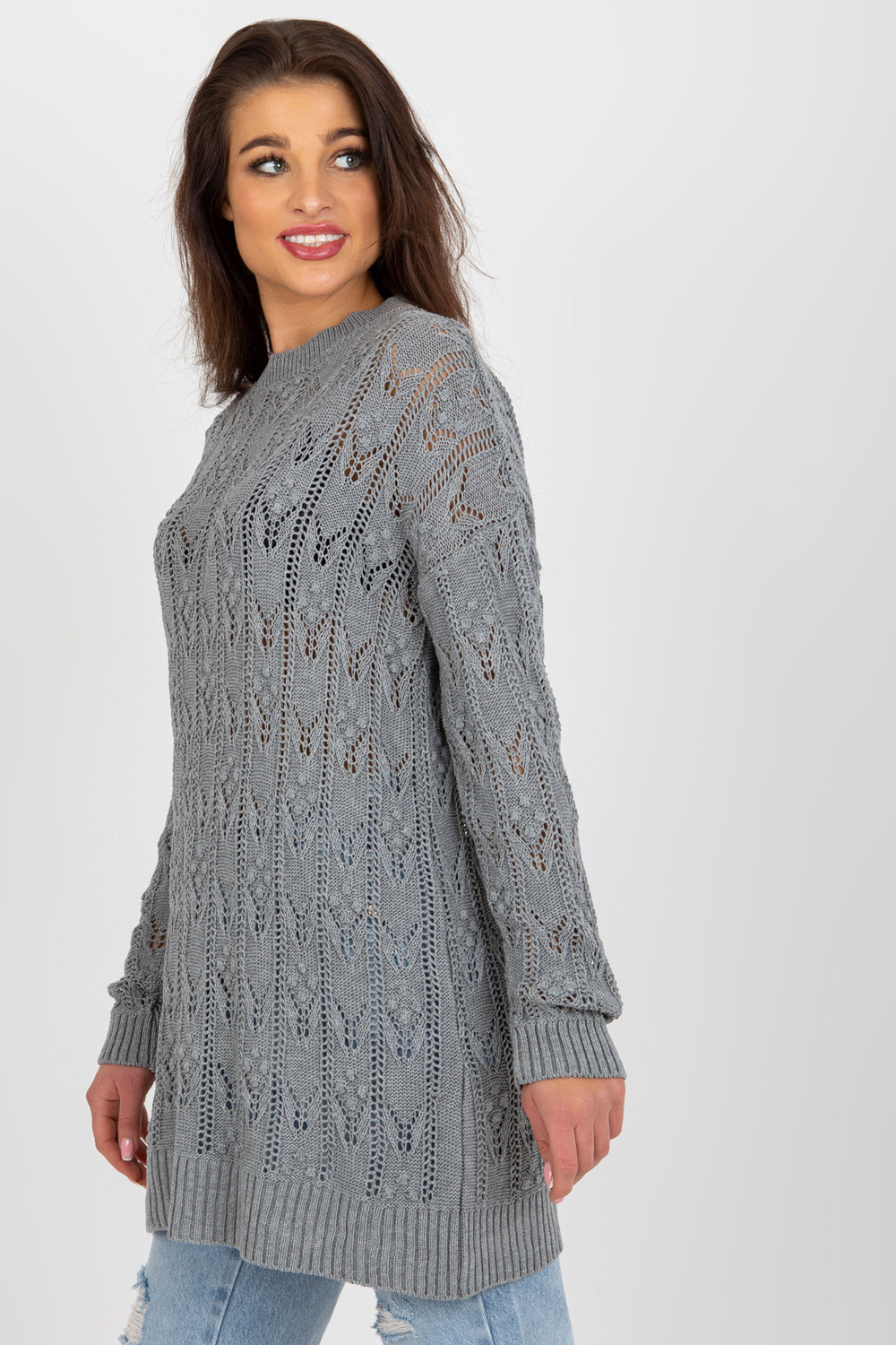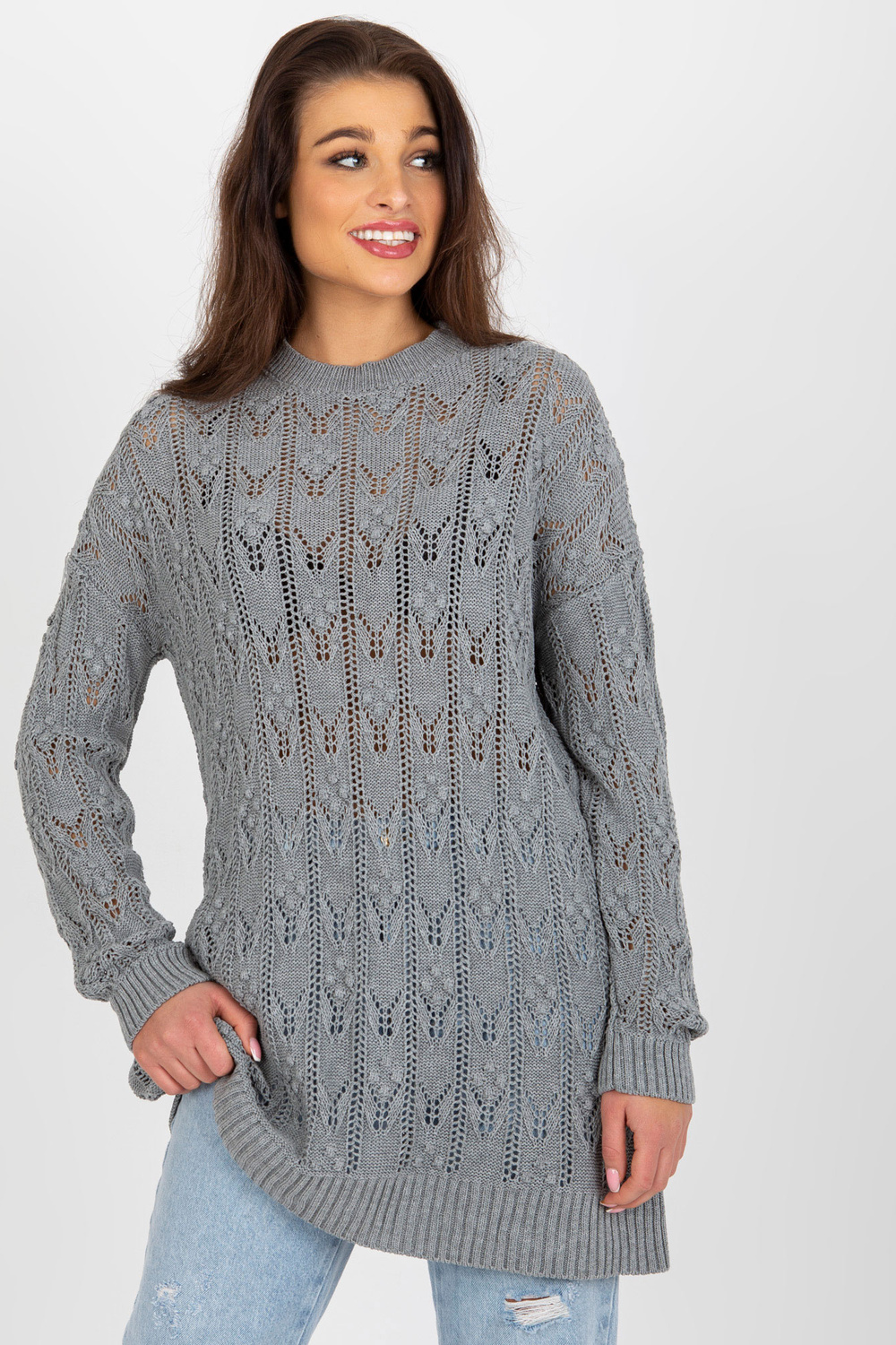 Pilka ažūrinė megzta suknelė su oversize kirpimu.