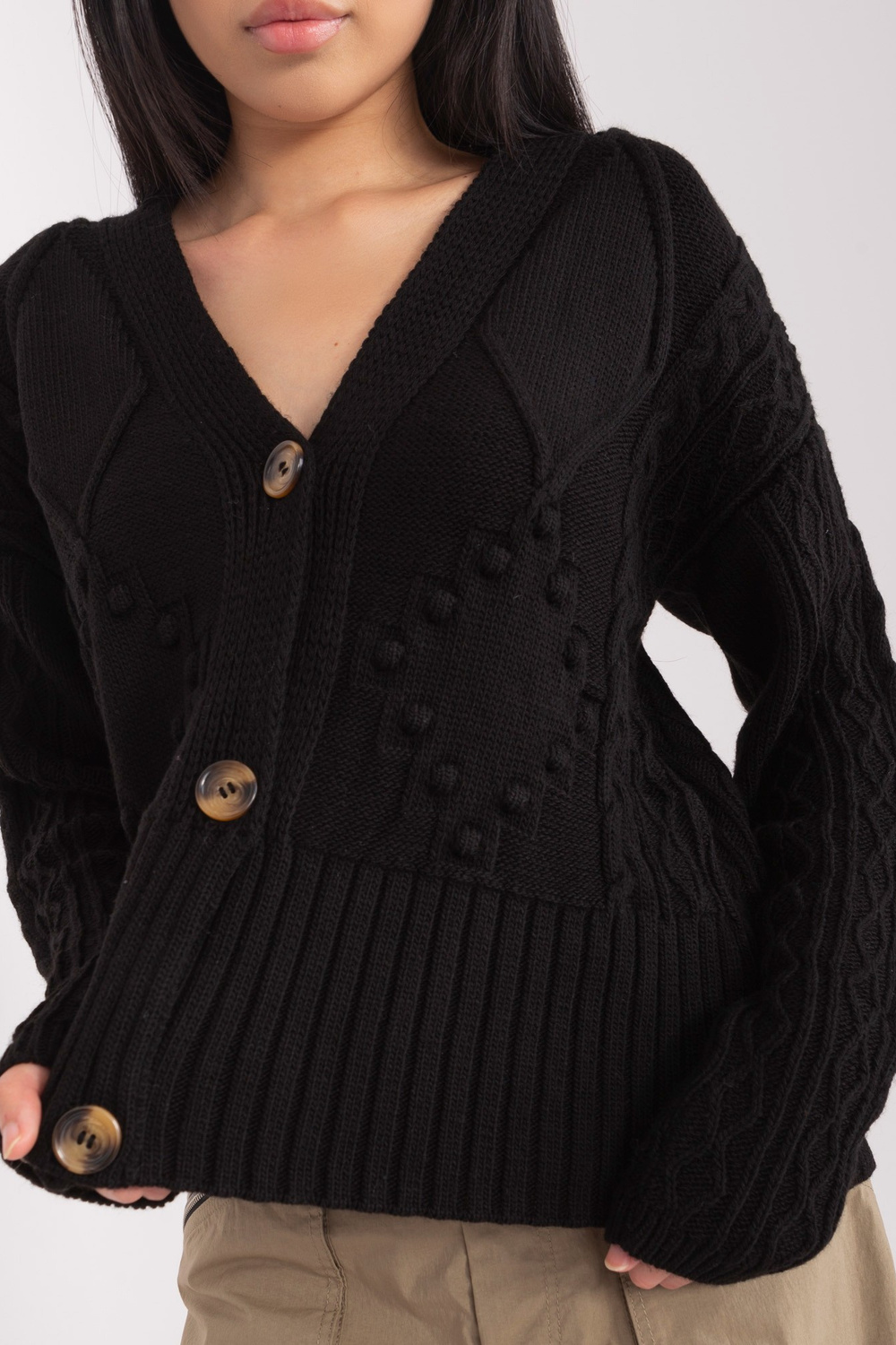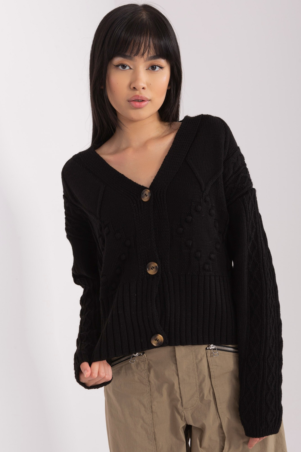 Modelis dėvi vieno dydžio dydį. Modelio išmatavimai: ūgis 167 cm, krūtinė 73 cm, juosmuo 64 cm, klubai 91 cm.