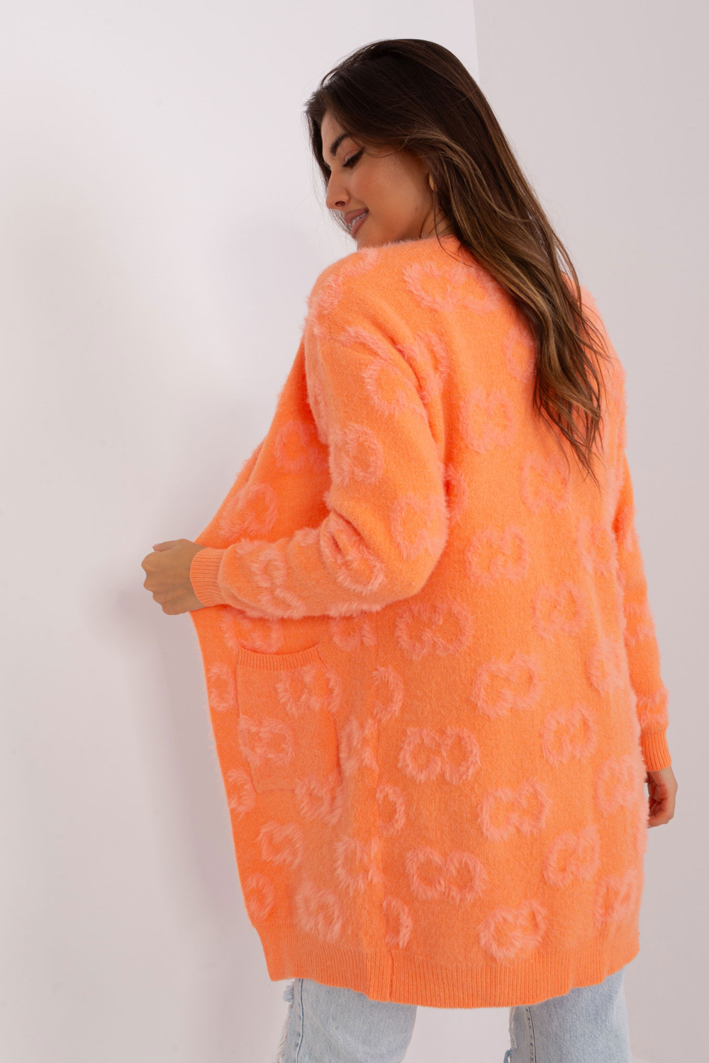 Vieno dydžio megztinio matmenys, matuojamas plokščias: plotis po pažastimis - 65 cm, bendras ilgis - 82 cm, rankovių ilgis - 60 cm.