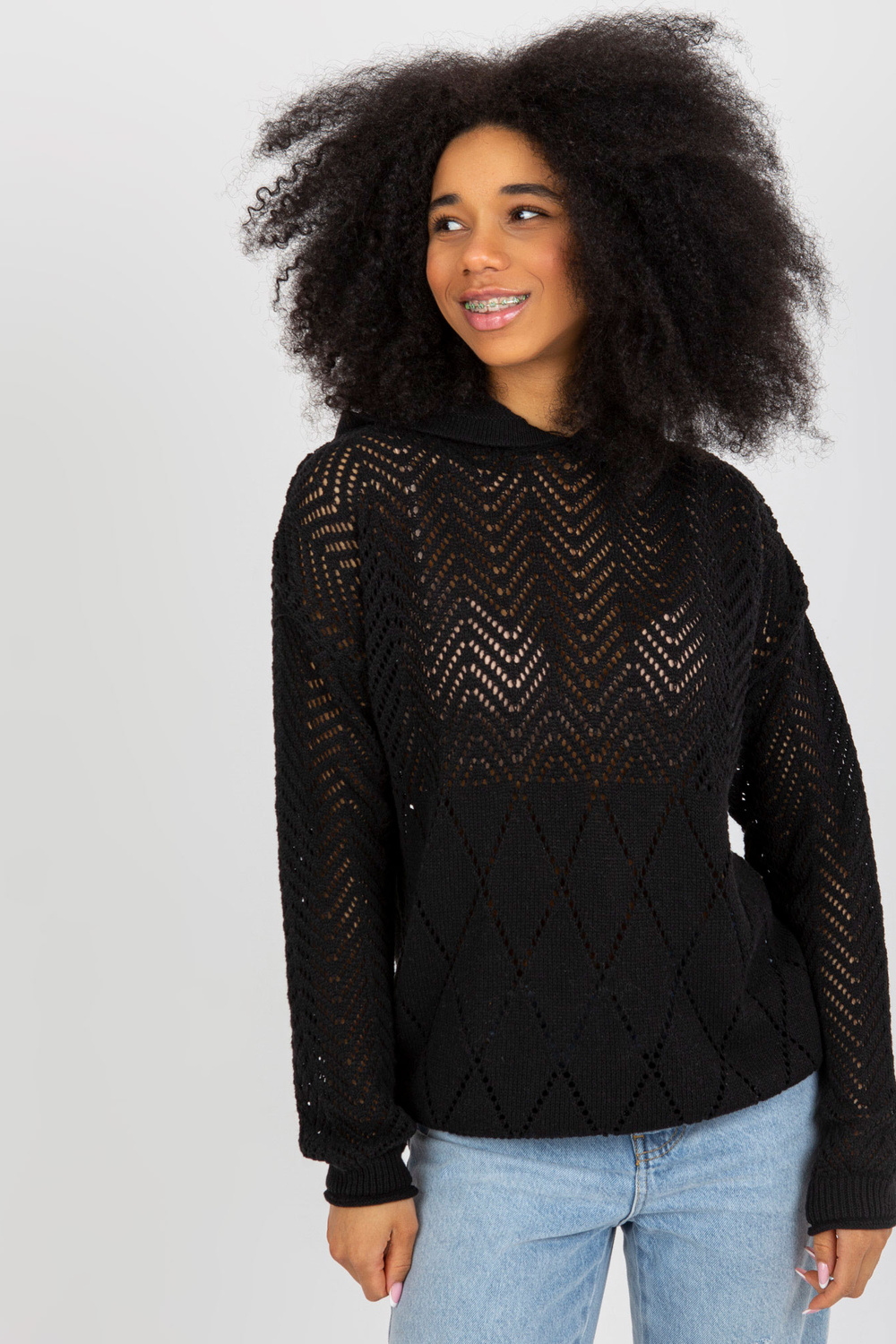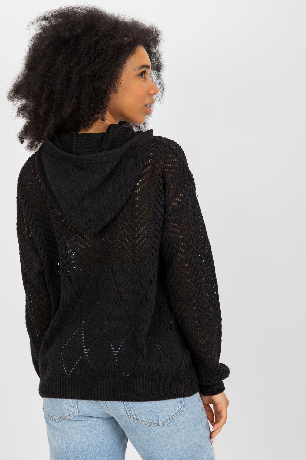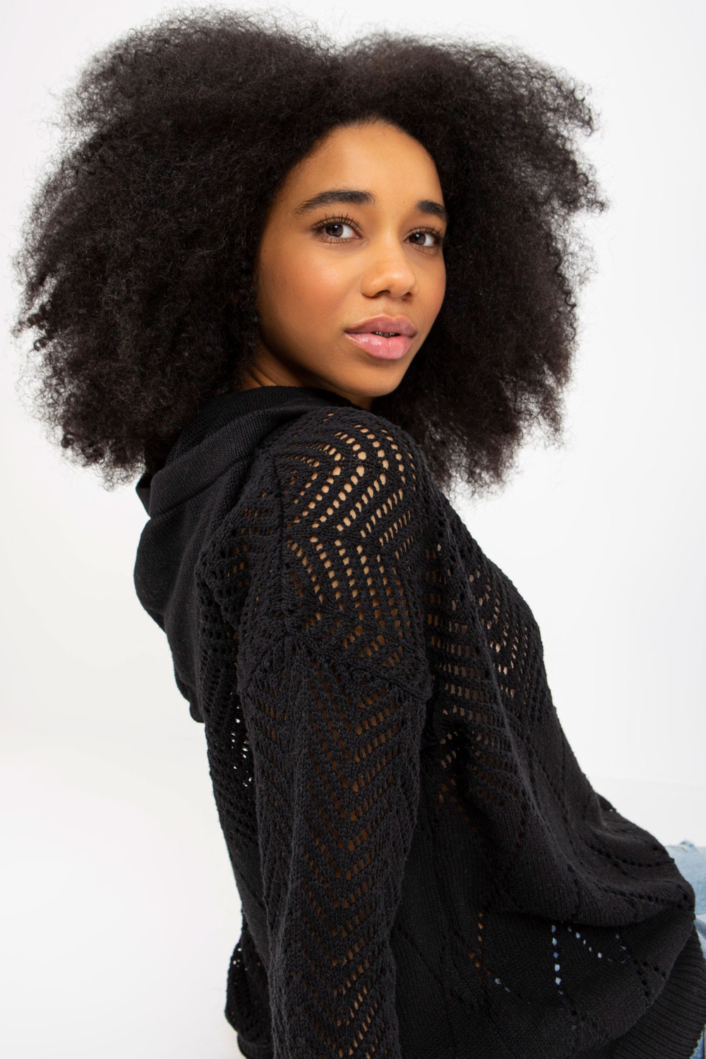 Juodas ažūrinis vasarinis megztinis su gobtuvu.