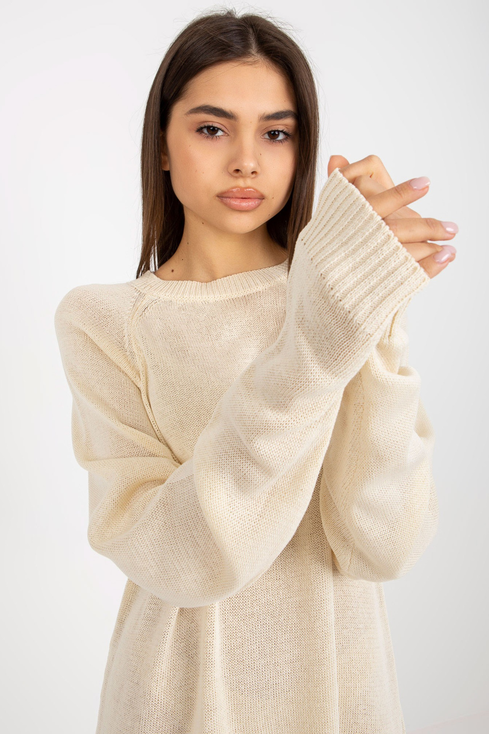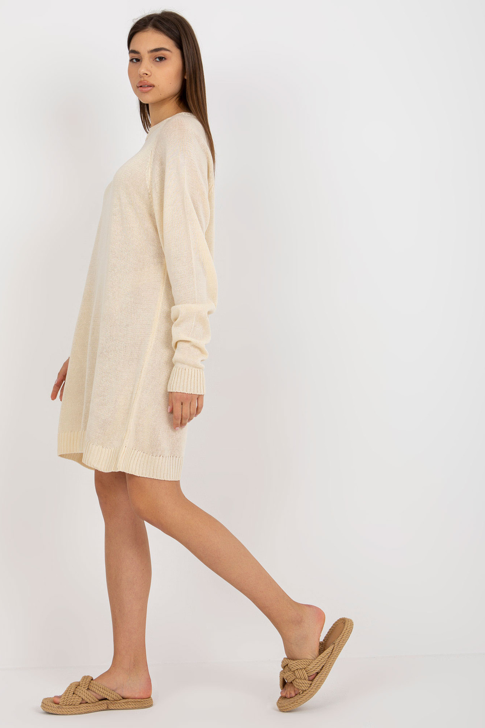 Šviesiai smėlio spalvos oversize vasarinė megzta suknelė su vilna.