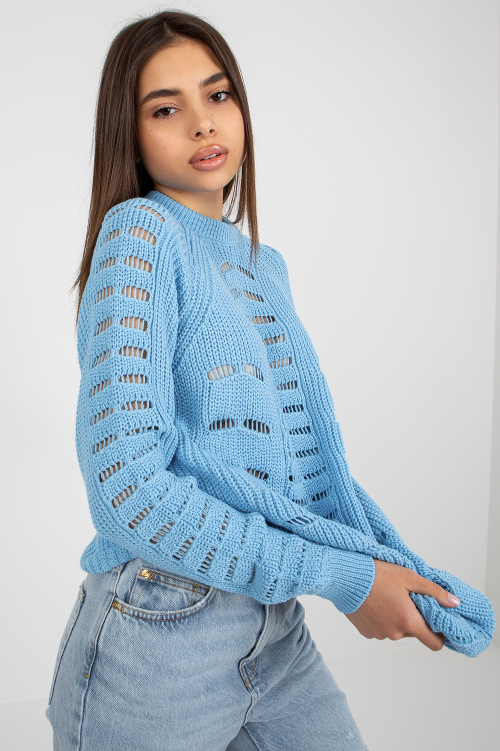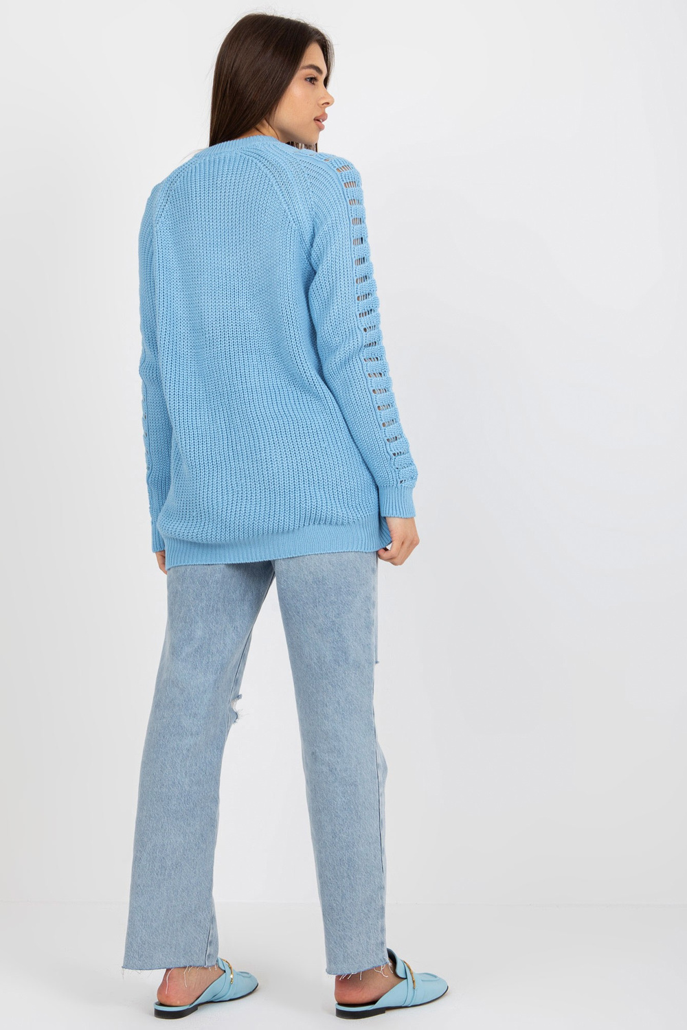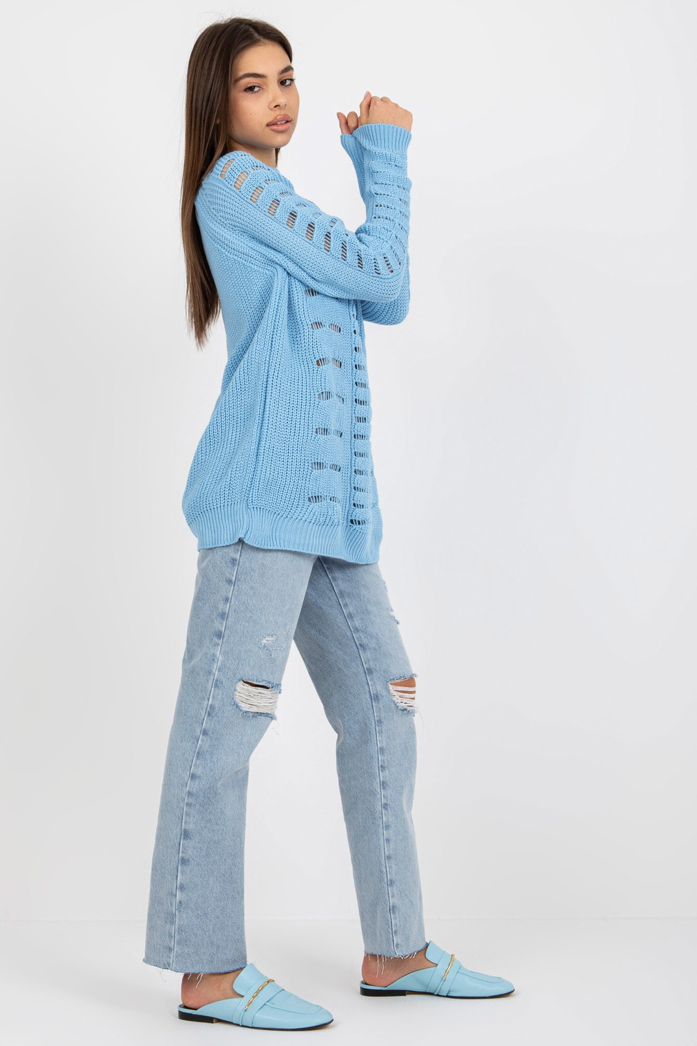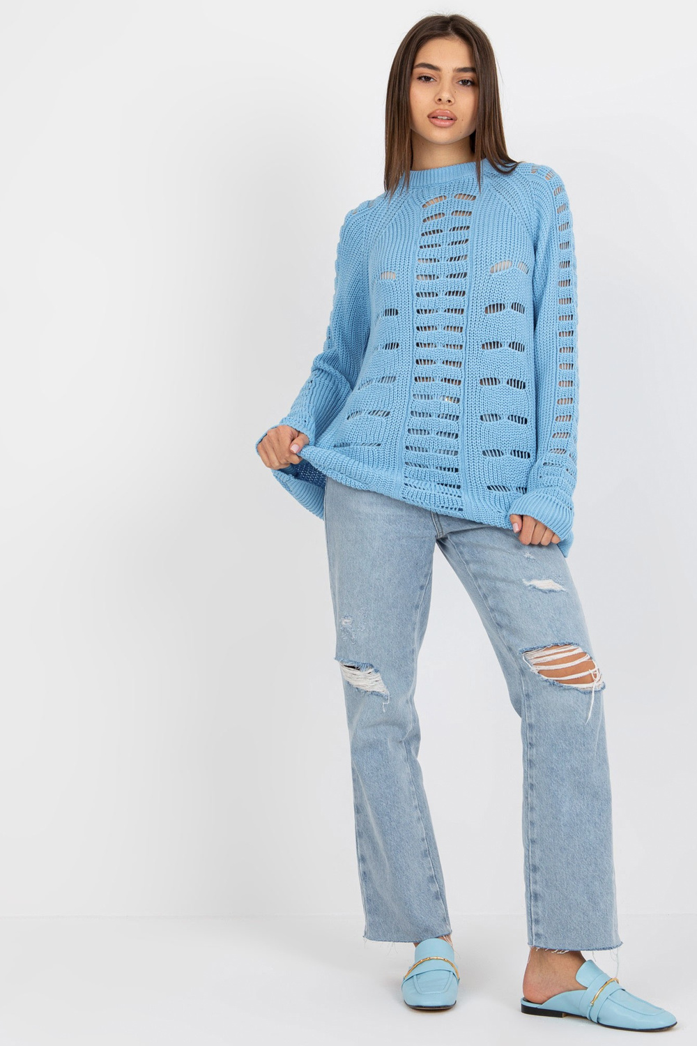 Šviesiai mėlynas ažūrinis oversize megztinis su vilna.
