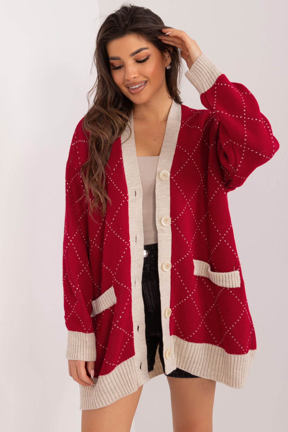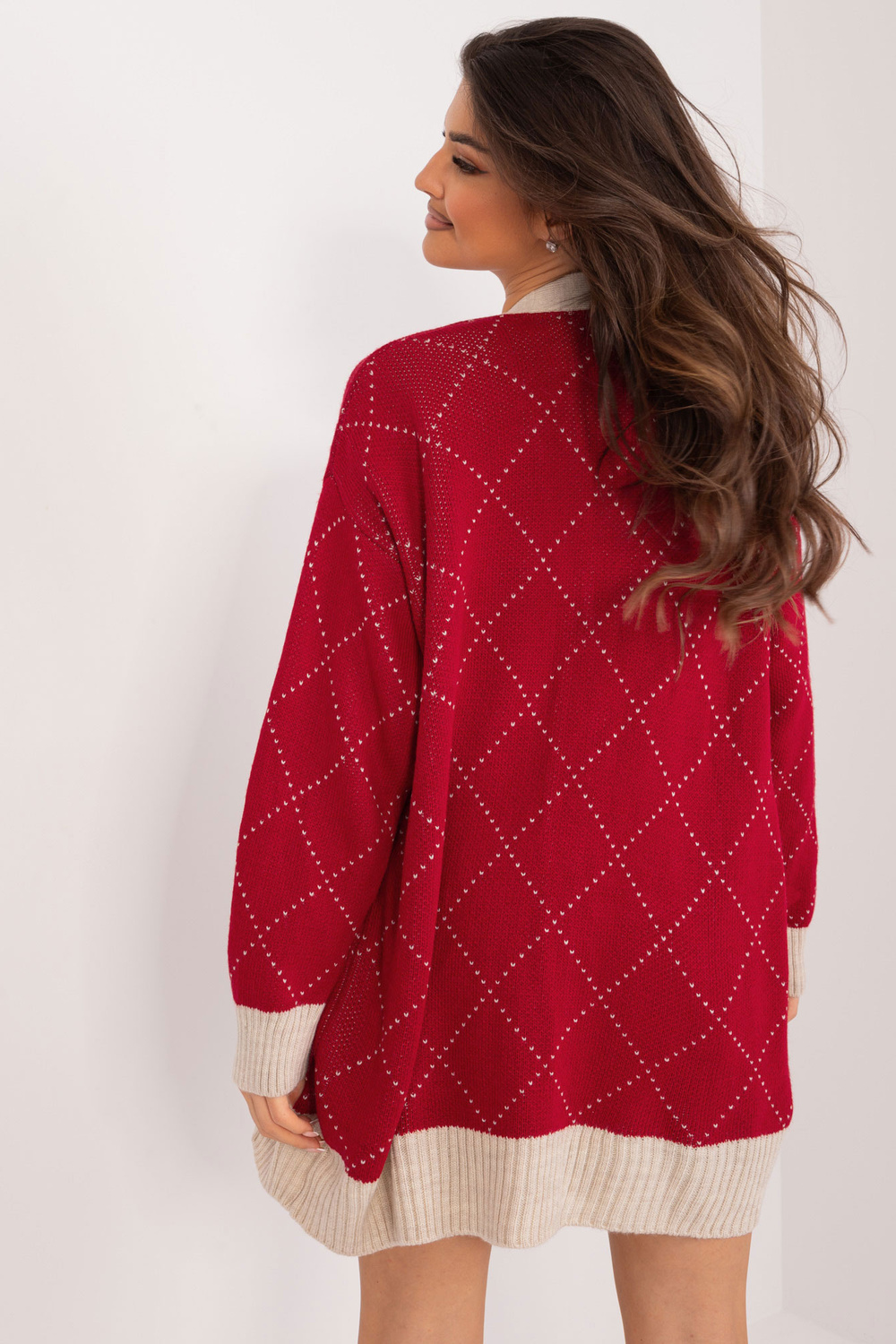 Vieno dydžio megztinio matmenys matuojami plokščiai: pažasties plotis - 70 cm, bendras ilgis - 80 cm, rankovių ilgis - 62 cm.