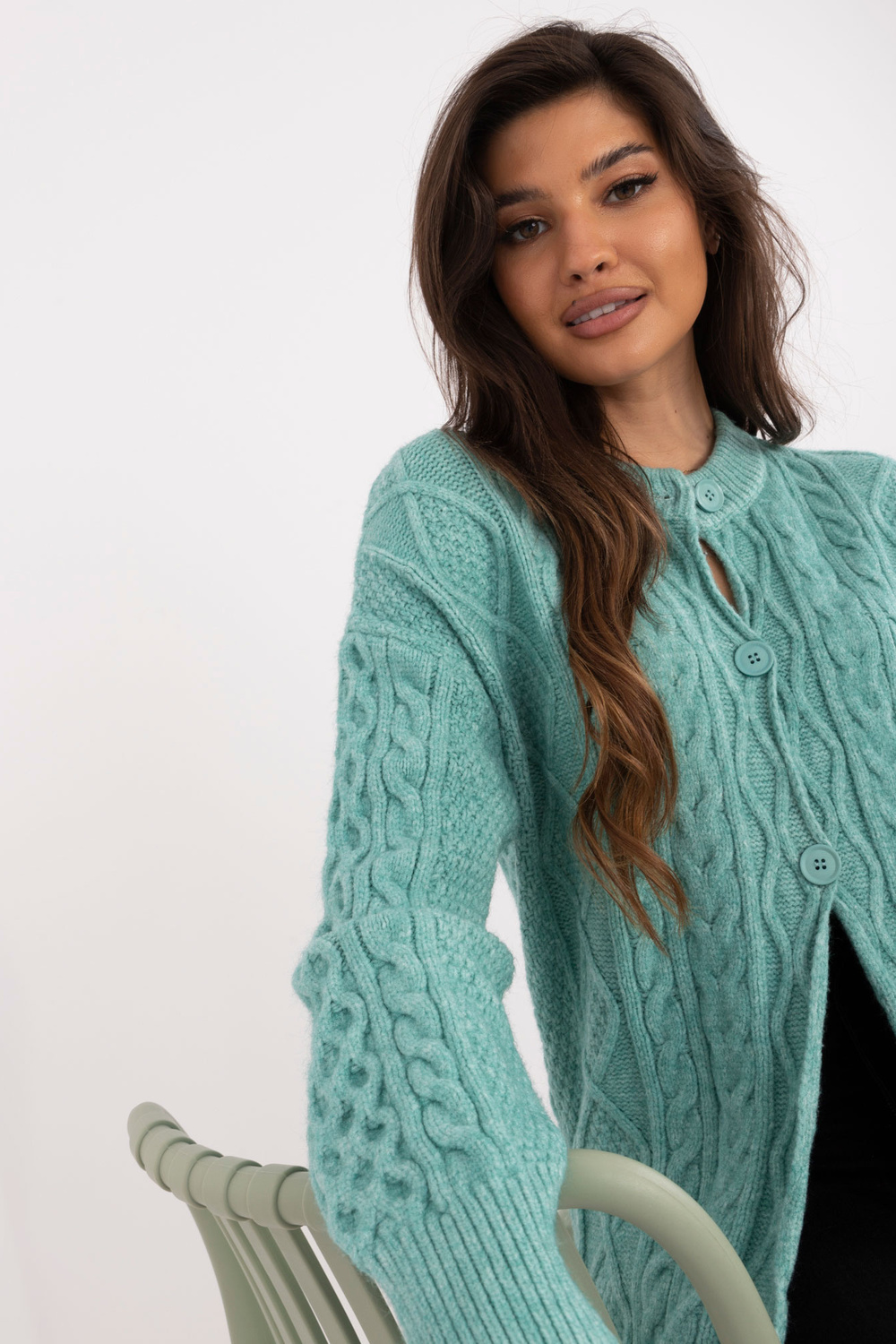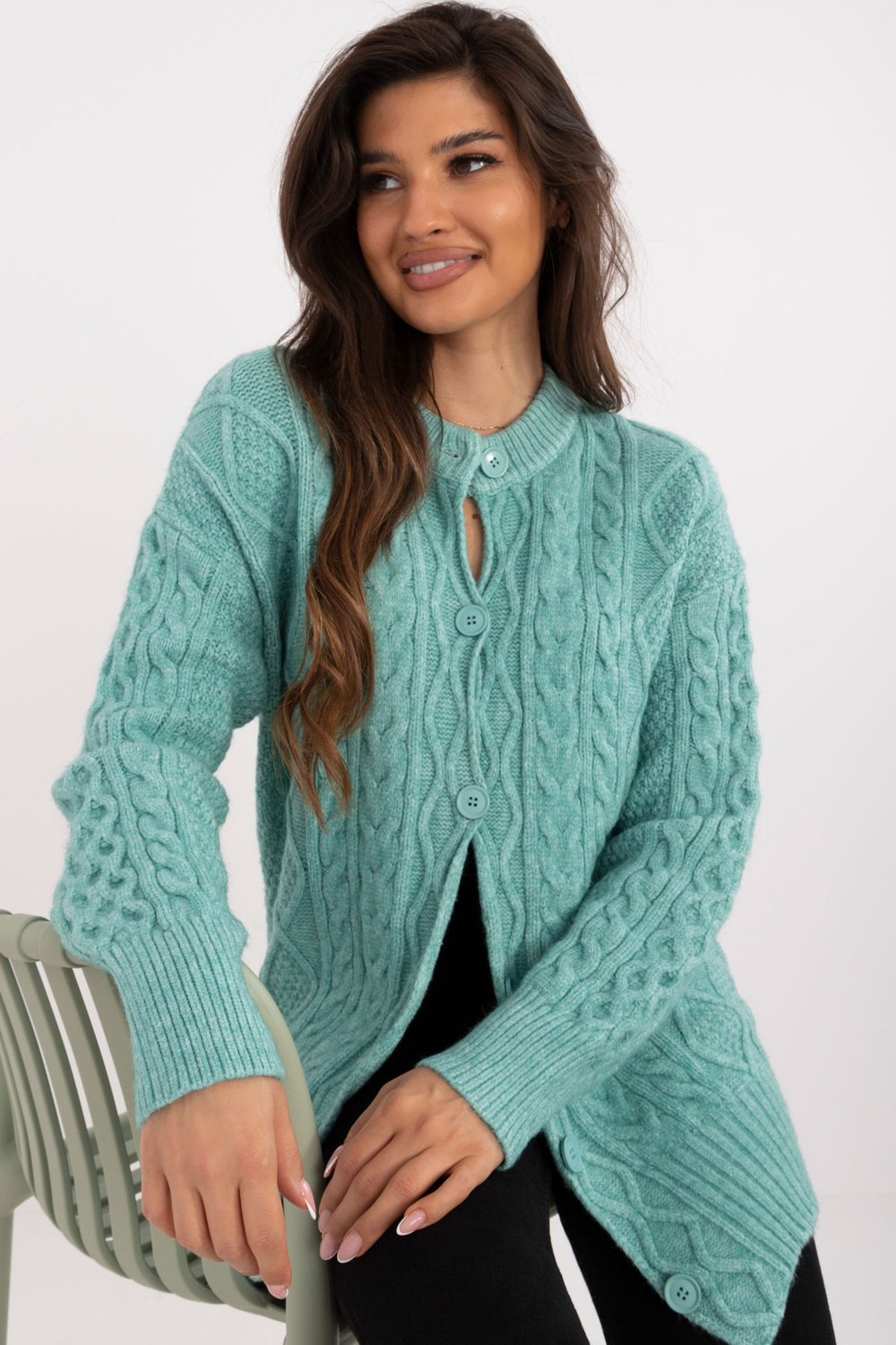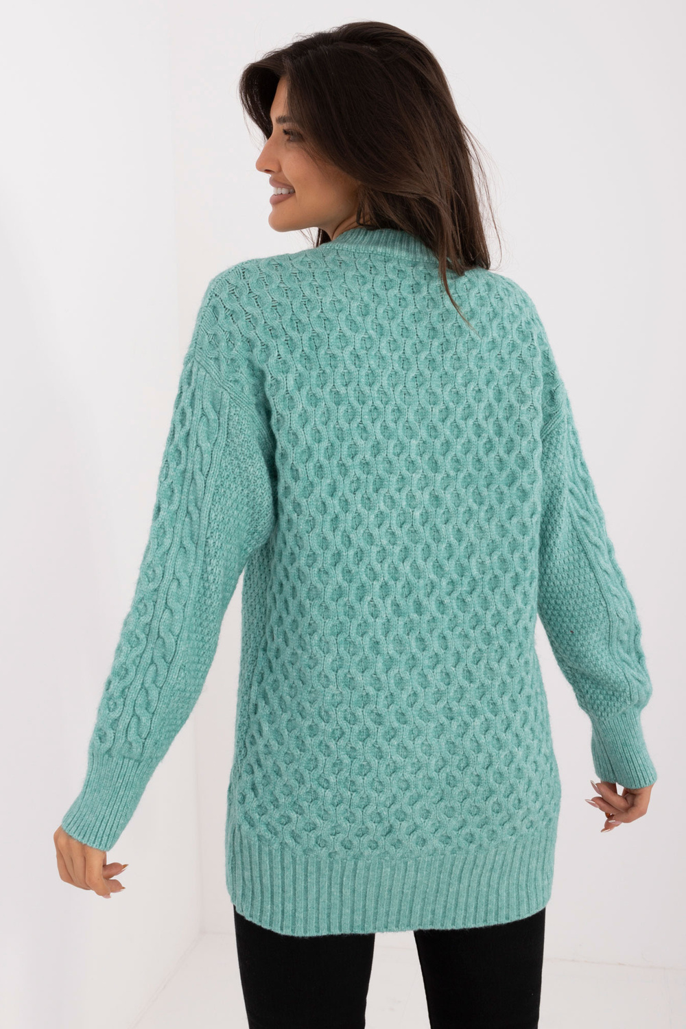 Vieno dydžio megztinio matmenys matuojami plokščiai: pažasties plotis - 58 cm, rankovių ilgis - 60 cm, bendras ilgis - 75 cm.