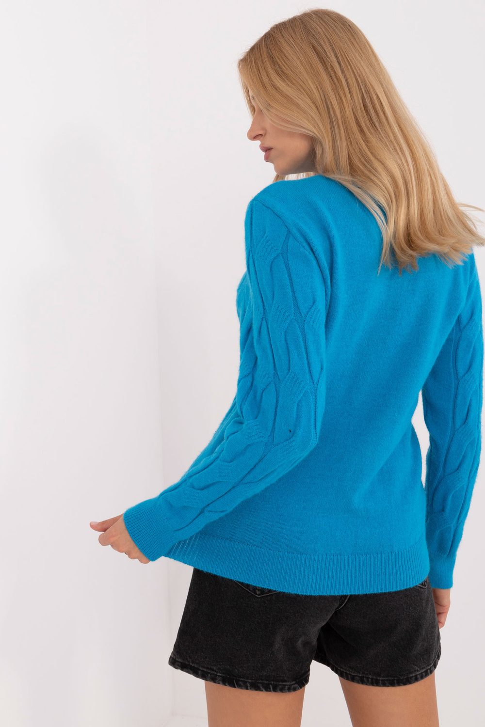 Vieno dydžio megztinio matmenys matuojami plokščiai: pažasties plotis - 48 cm, rankovių ilgis - 61 cm, bendras ilgis - 63 cm.