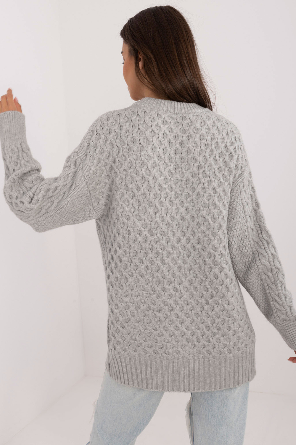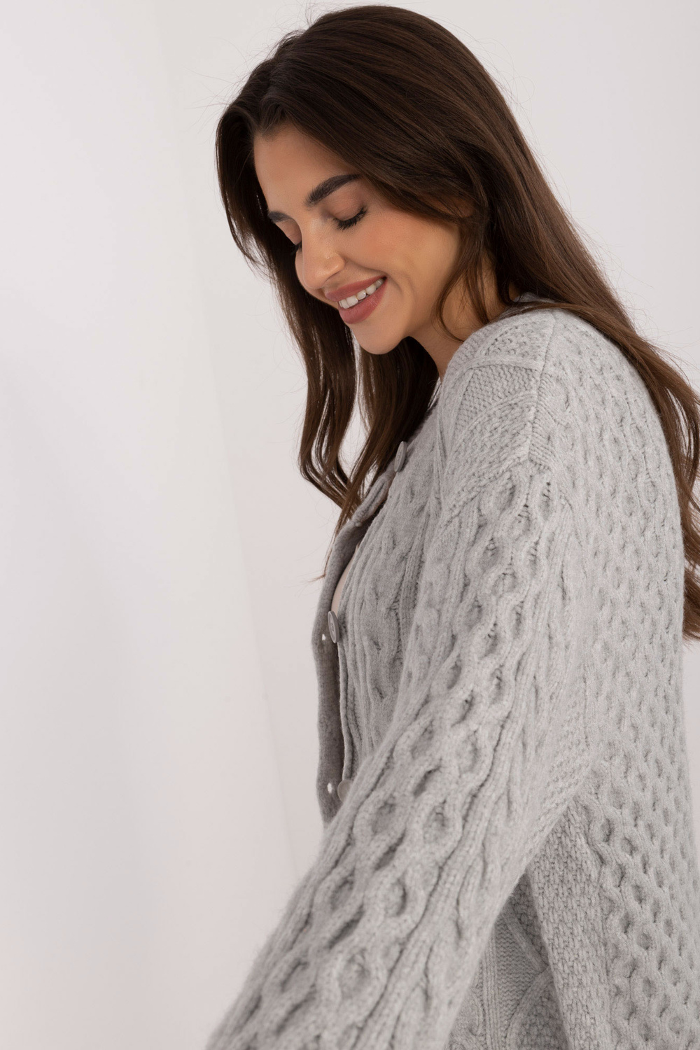 Vieno dydžio megztinio matmenys matuojami plokščiai: pažasties plotis - 58 cm, rankovių ilgis - 60 cm, bendras ilgis - 75 cm.