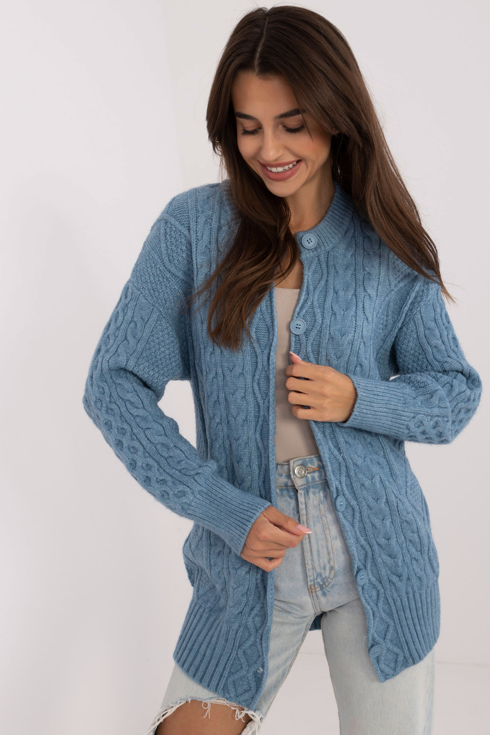Vieno dydžio megztinio matmenys matuojami plokščiai: pažasties plotis - 58 cm, rankovių ilgis - 60 cm, bendras ilgis - 75 cm.