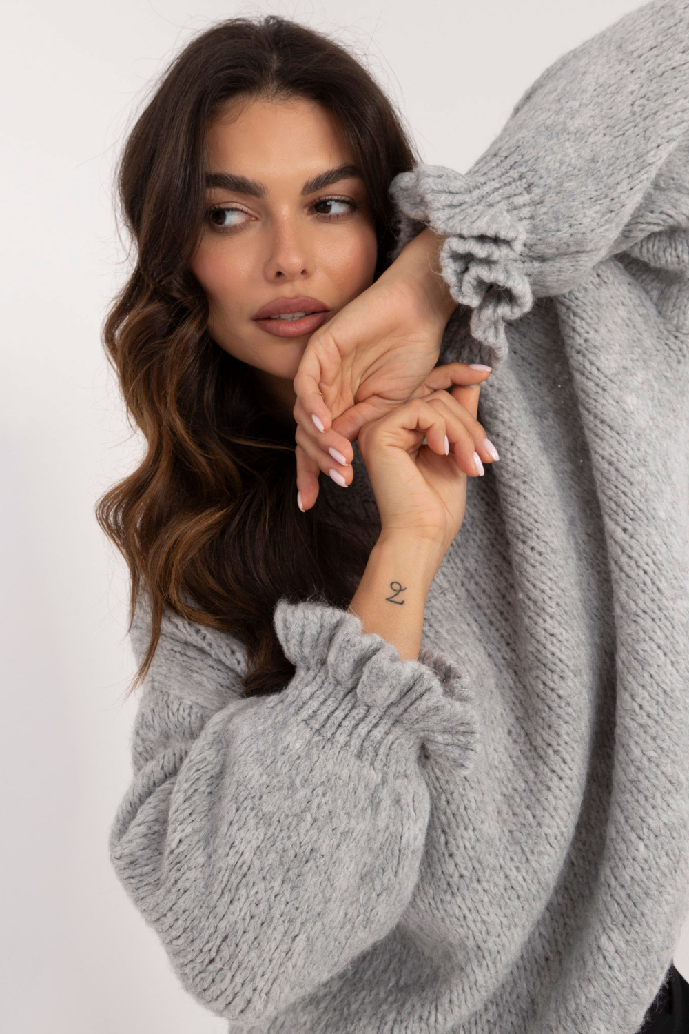 Vieno dydžio megztinio išmatavimai matuojami plokščiai: pažasties plotis - 70 cm, bendras ilgis - 84 cm, rankovių ilgis - 52 cm