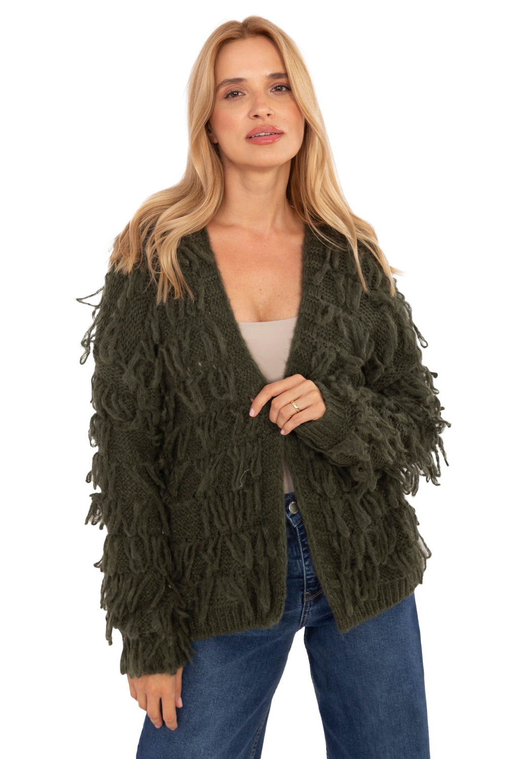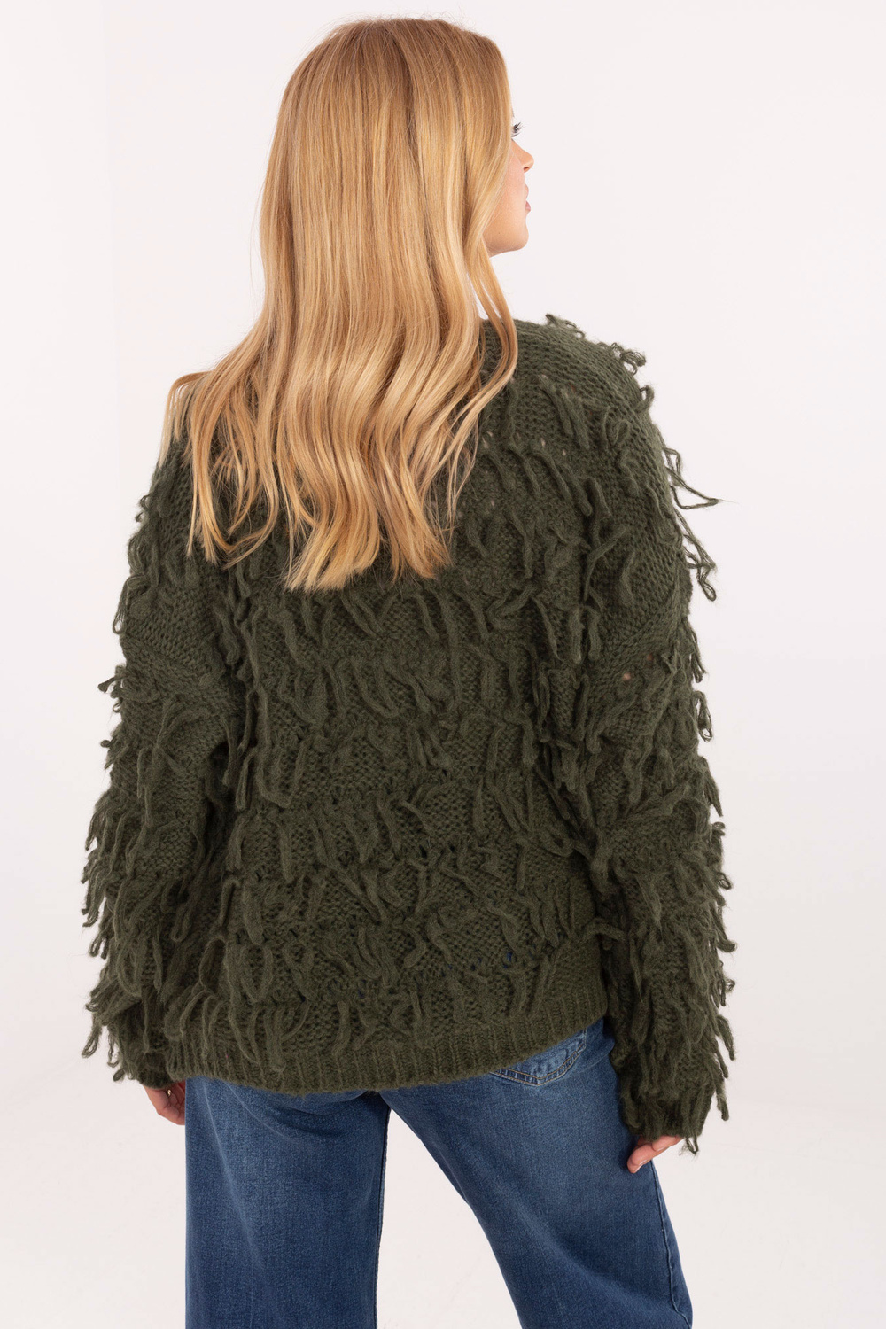 Megztinio matmenys vieno dydžio, matuojant plokščiai: plotis po pažastimis - 67 cm, rankovės ilgis - 52 cm (nuo siūlės), bendras ilgis - 66 cm, plotis klubų srityje - 65 cm.