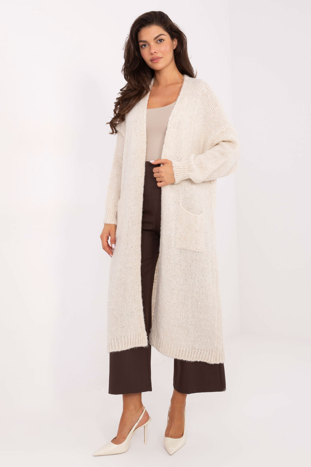 Kardigano matmenys vieno dydžio (one size) rūbuose, matuojant lygioje padėtyje: plotis po pažastimis - 70 cm, rankovės ilgis - 43 cm (nuo siūlės), plotis klubuose - 64 cm, bendras ilgis - 111 cm.